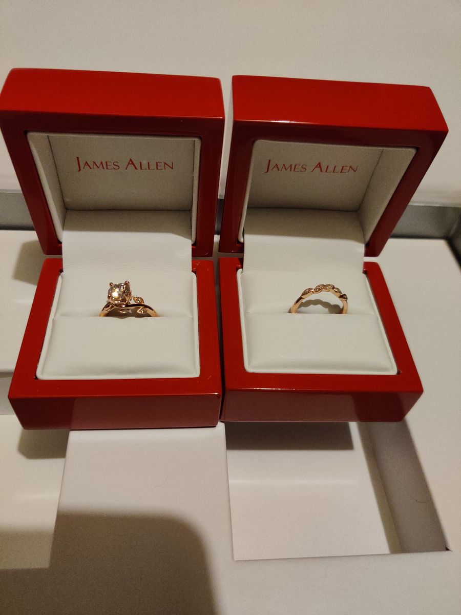 Purchased new from James Allen, never used. Includes the engagement ring and the matching wedding band, both in 14K rose gold.
