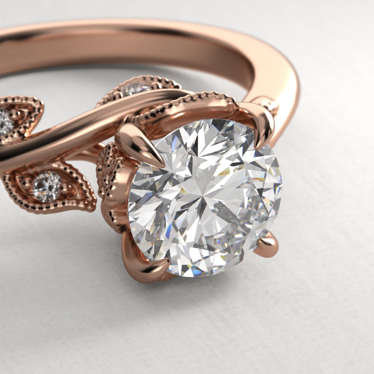 The vine design wraps around the center diamond with delicate leaf accents, giving it a romantic, nature-inspired look.