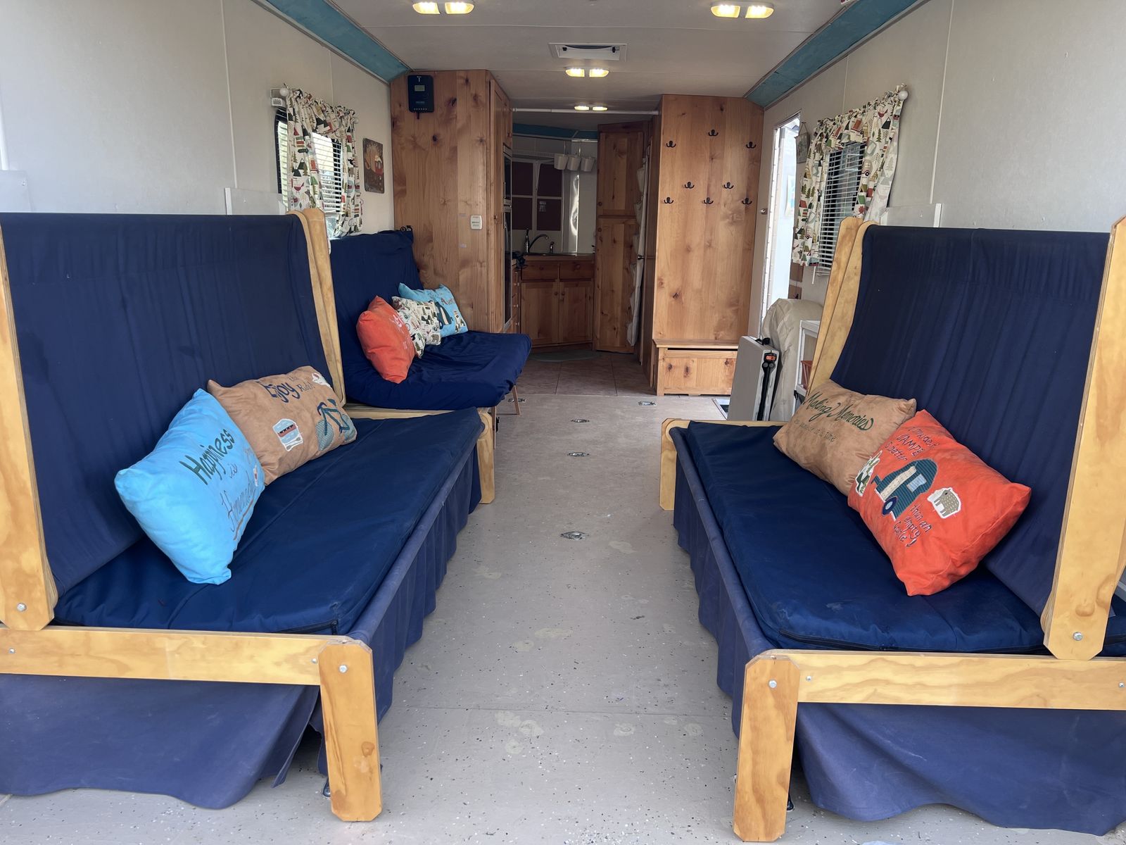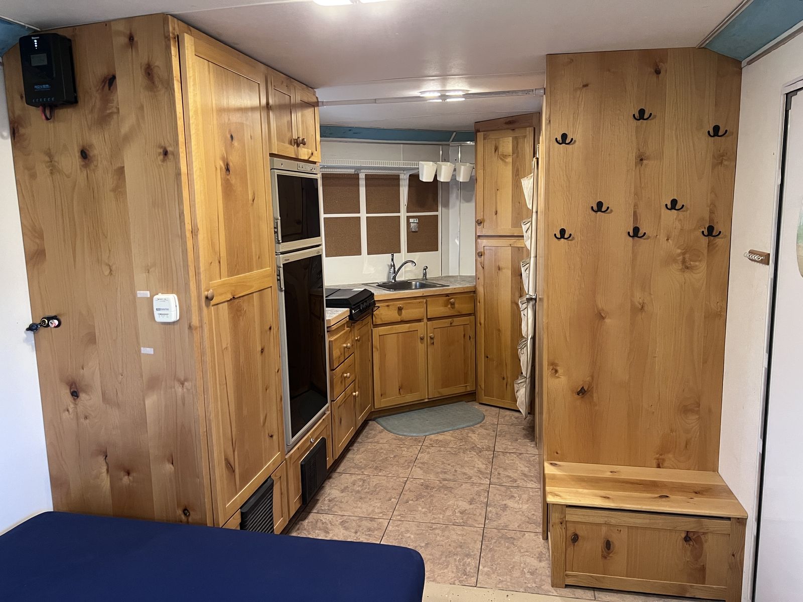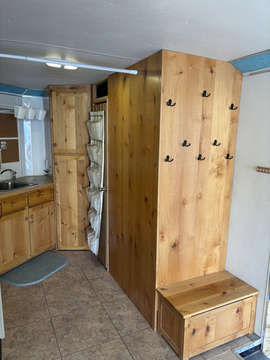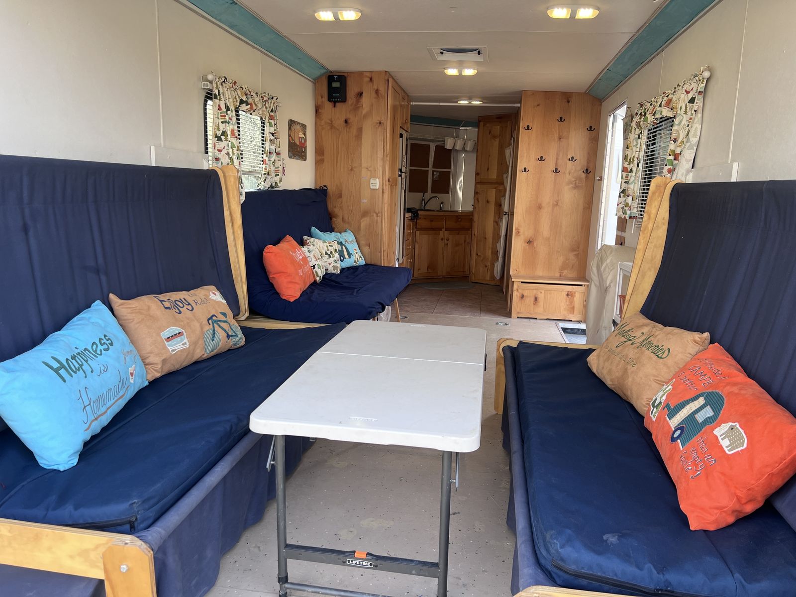 This toy hauler was built for durability and optimal functionality. It has 14 feet of clear space for toys with 7 foot ceiling. We have fit a six seater side-by-side, dirt bikes, four wheelers, mountain bike bikes, and/or kayaks. This trailer sleeps six adults comfortably, with room for more on mats on the floor if needed.. Cabinets are all custom built from knotty alder. Has a spacious 6 cubic foot fridge with freezer, stove with griddle burner, spacious food pantry, and giant bedding cabinet. Outlets are plentiful, and wired for installing a microwave above the stove if desired. Beds fold up snugly against the wall and convert into couches that can seat 12 with versatile table. A curtain rod can divide the open space into two rooms for ease in changing.