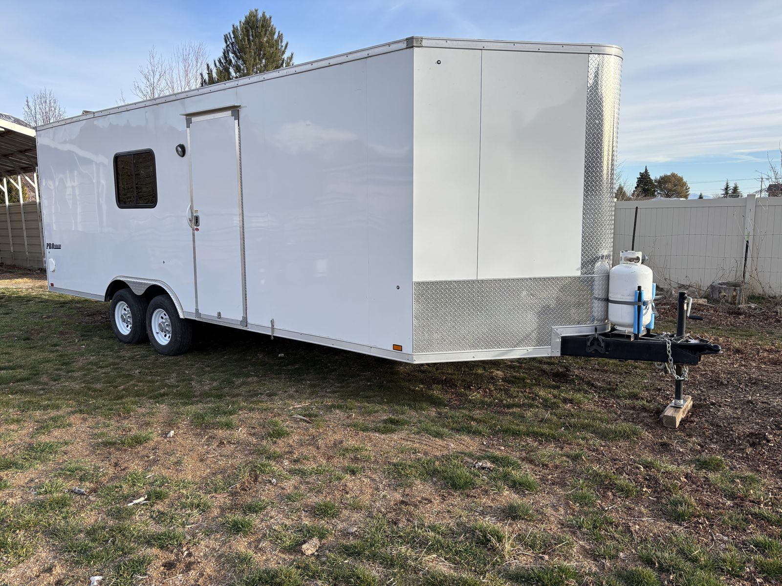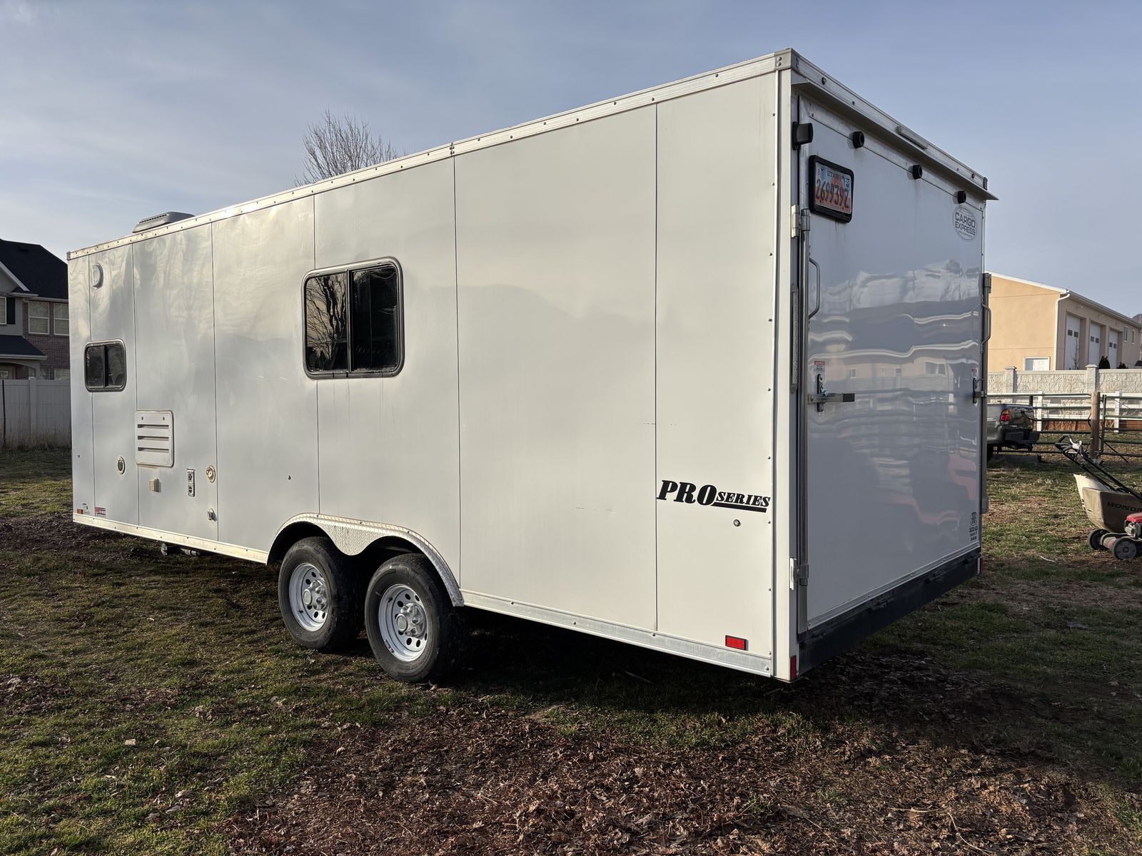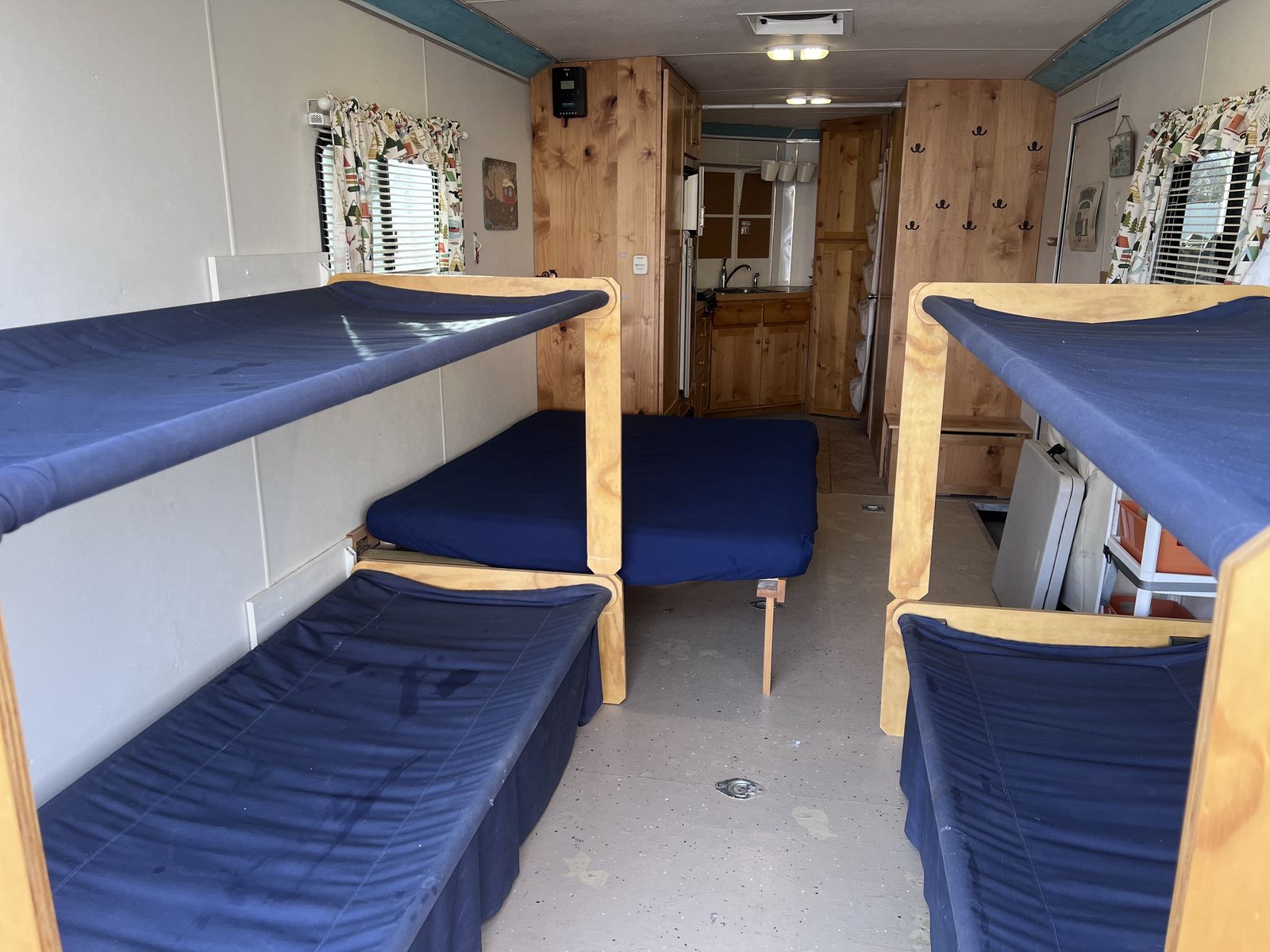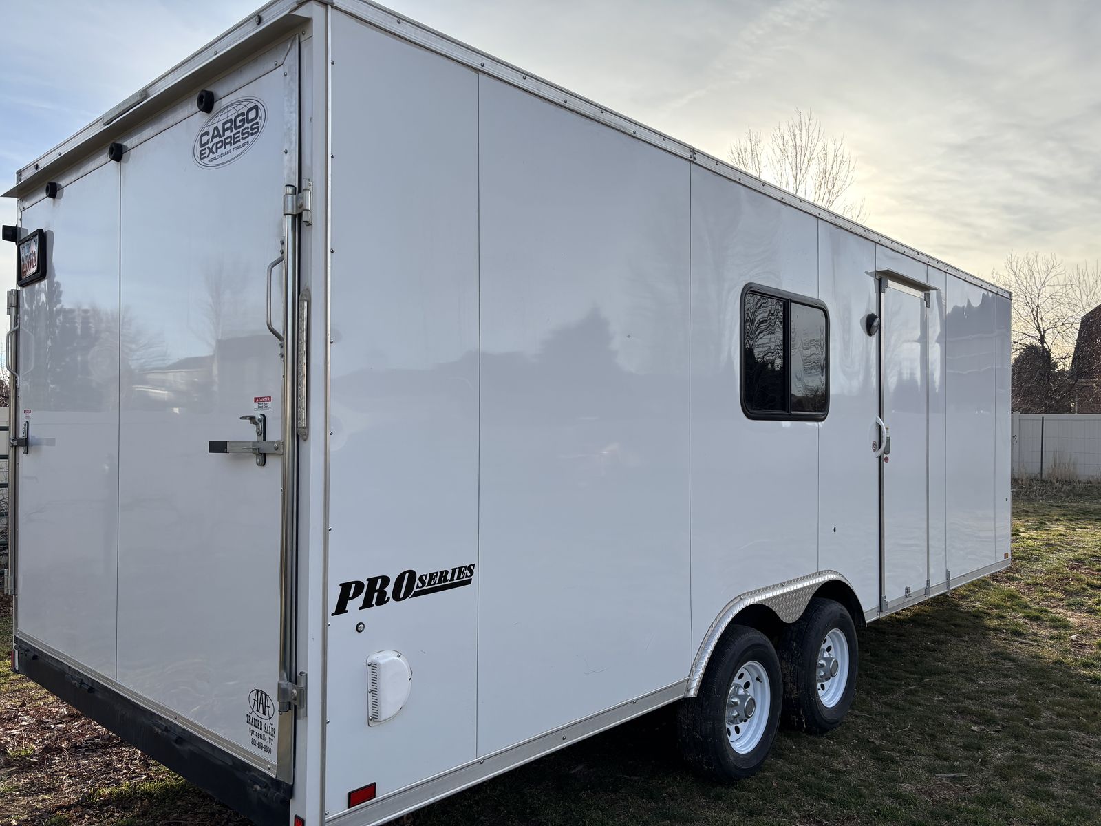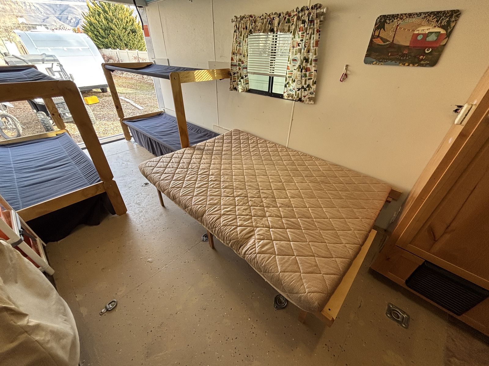 This toy hauler was built for durability and optimal functionality. It has 14 feet of clear space for toys with 7 foot ceiling. We have fit a six seater side-by-side, dirt bikes, four wheelers, mountain bike bikes, and/or kayaks. This trailer sleeps six adults comfortably, with room for more on mats on the floor if needed.. Cabinets are all custom built from knotty alder. Has a spacious 6 cubic foot fridge with freezer, stove with griddle burner, spacious food pantry, and giant bedding cabinet. Outlets are plentiful, and wired for installing a microwave above the stove if desired. Beds fold up snugly against the wall and convert into couches that can seat 12 with versatile table. A curtain rod can divide the open space into two rooms for ease in changing.