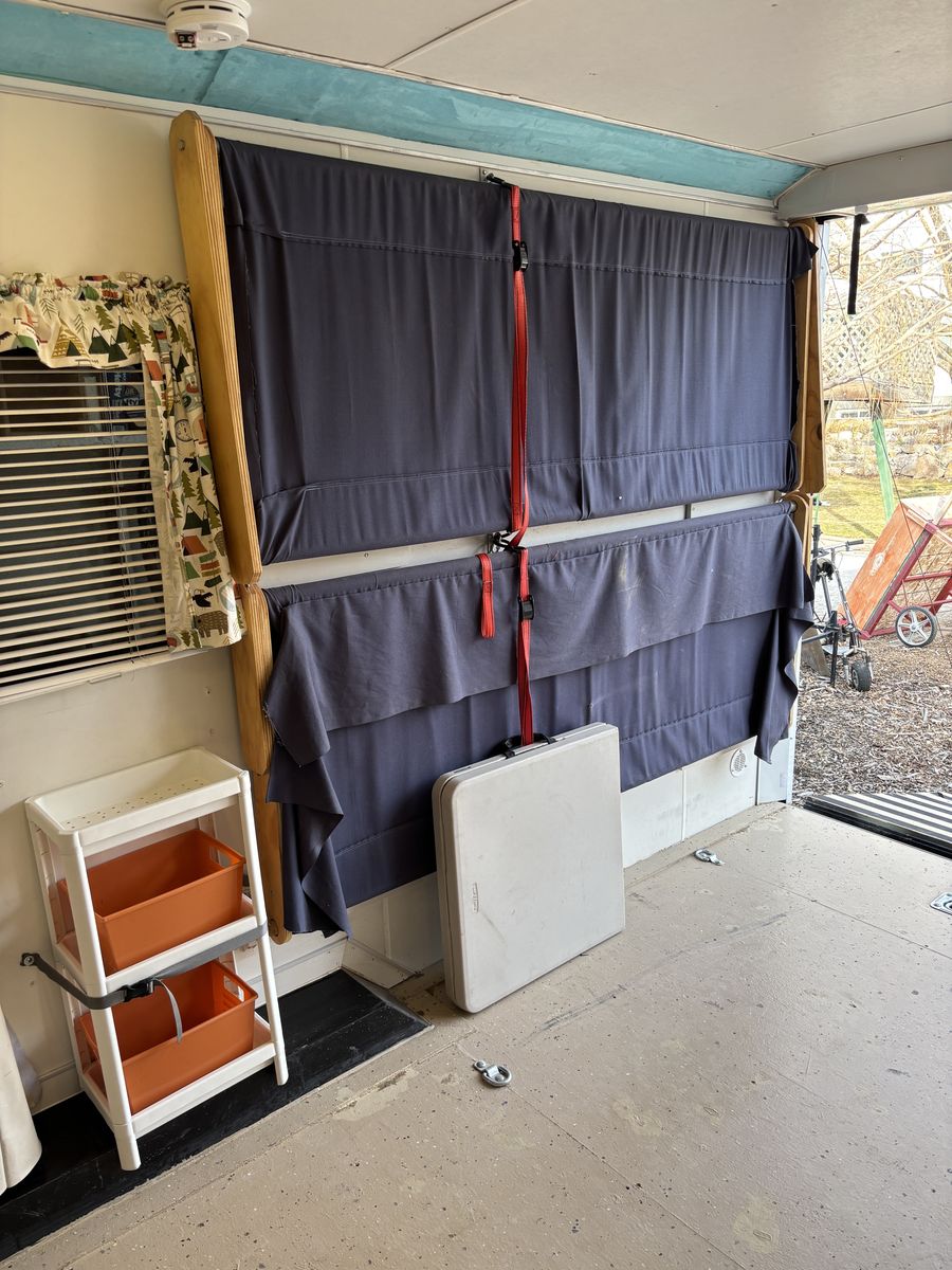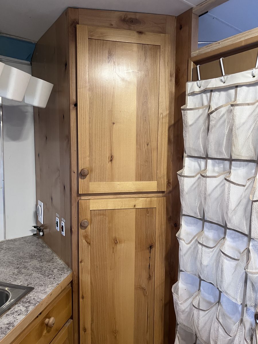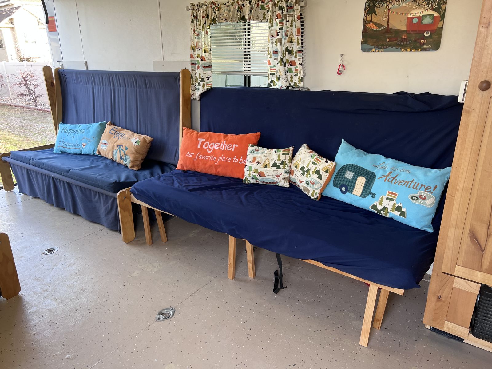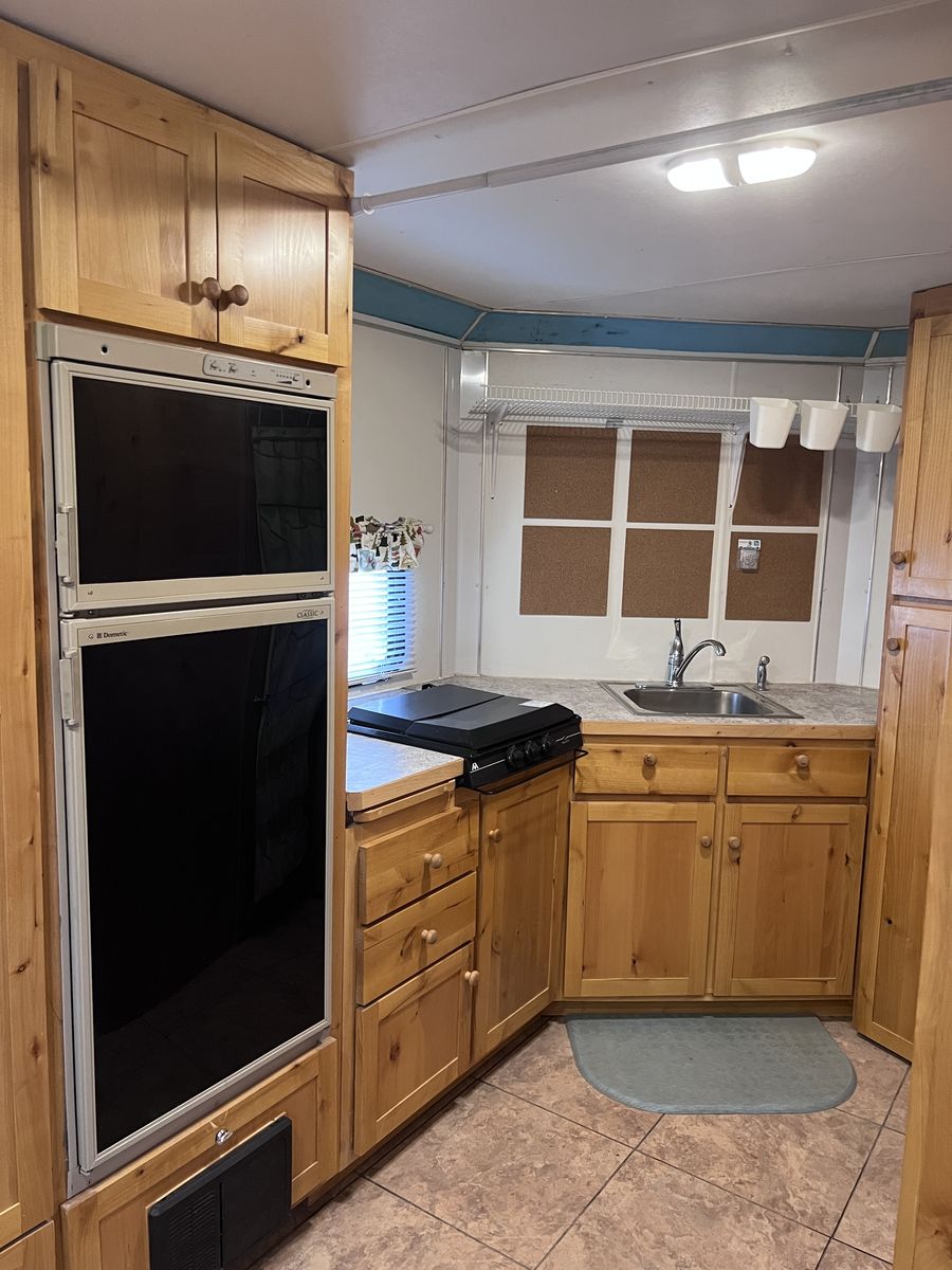 This toy hauler was built for durability and optimal functionality. It has 14 feet of clear space for toys with 7 foot ceiling. We have fit a six seater side-by-side, dirt bikes, four wheelers, mountain bike bikes, and/or kayaks. This trailer sleeps six adults comfortably, with room for more on mats on the floor if needed.. Cabinets are all custom built from knotty alder. Has a spacious 6 cubic foot fridge with freezer, stove with griddle burner, spacious food pantry, and giant bedding cabinet. Outlets are plentiful, and wired for installing a microwave above the stove if desired. Beds fold up snugly against the wall and convert into couches that can seat 12 with versatile table. A curtain rod can divide the open space into two rooms for ease in changing.