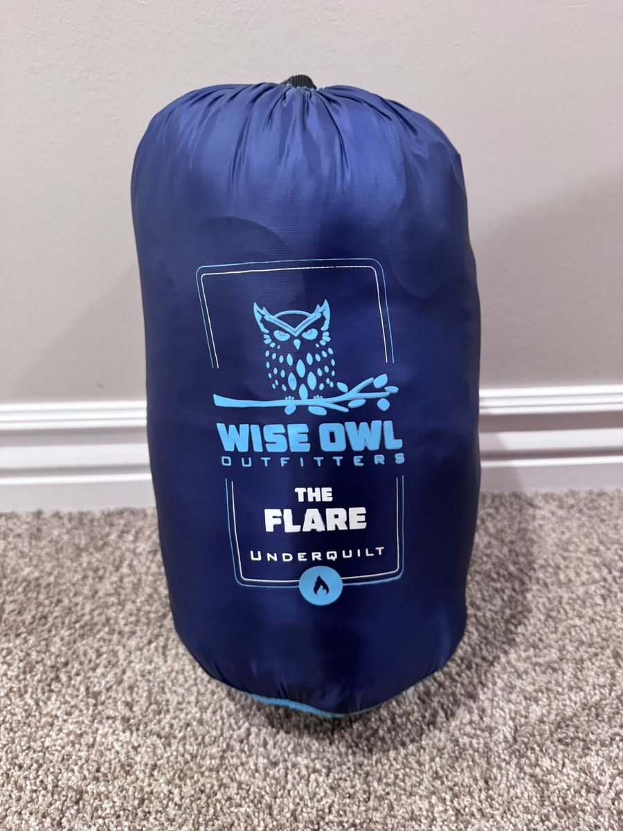 VenmoLike new Wise Owl Flare Underquilt – 40°F rated, synthetic insulation, water-resistant, adjustable fit for single/double hammocks. Never used, clean, includes stuff sack. Perfect for Utah camping!