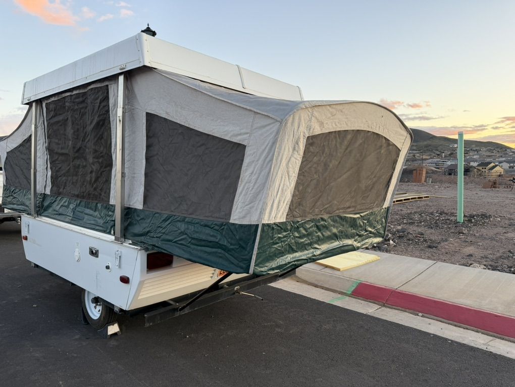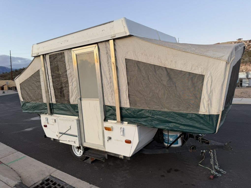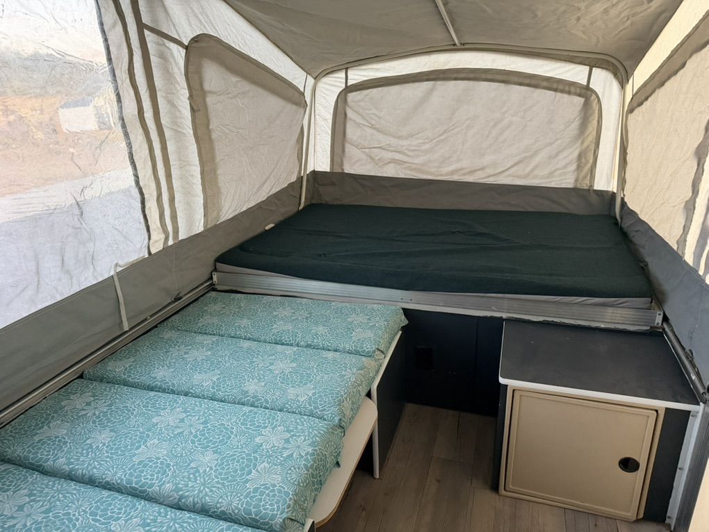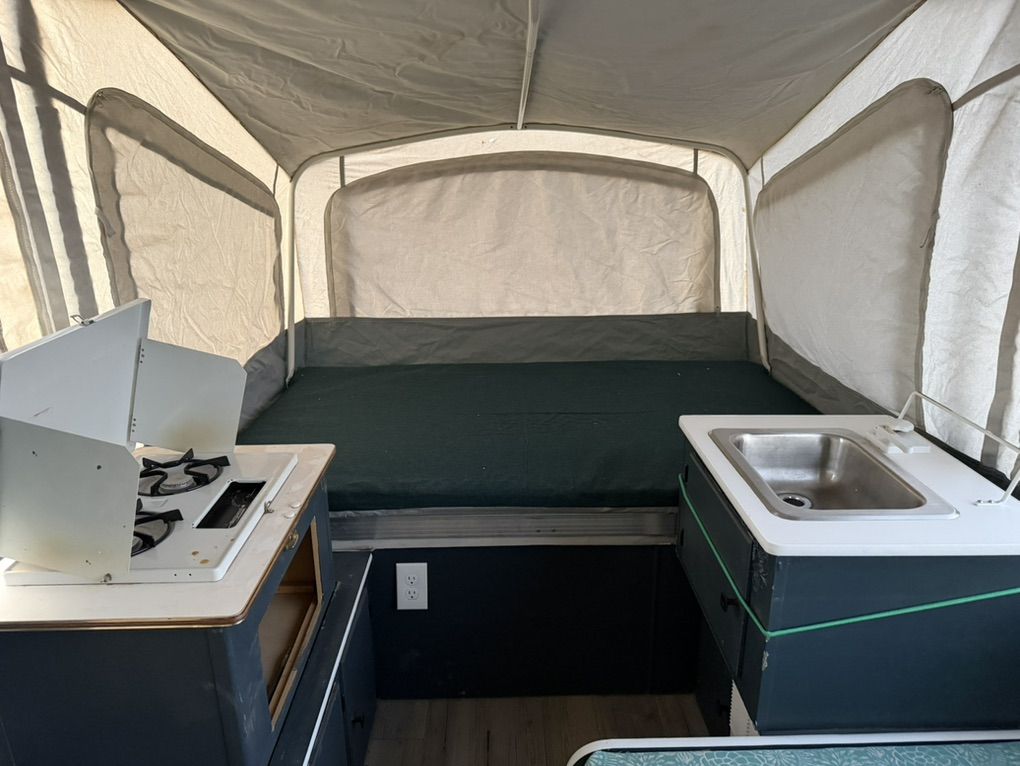 Has stove, heater, ice box, dining table, and sink. Sleeps up to 6 with 3 sleeping areas. Message me with any questions.