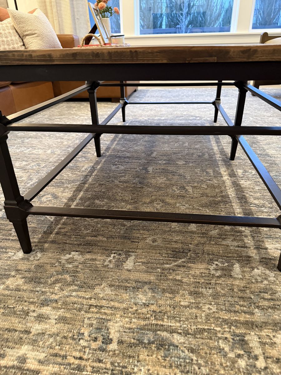 Details: • 54” rectangular coffee table • Reclaimed wood parquet top • Dark bronze iron frame • Very solid and well built • Like New Condition