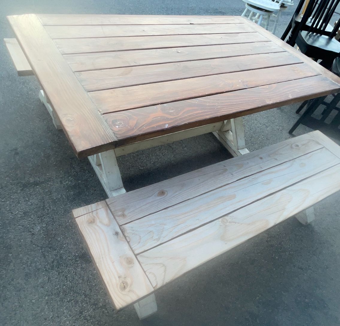 VenmoAwesome Solid wood heavy duty high quality table with 2 benches A little stain or paint and this will be a great set for many years. 67 in long 3ft wide 30 in tall 16 1/2 in wide benches 18 in tall Can deliver