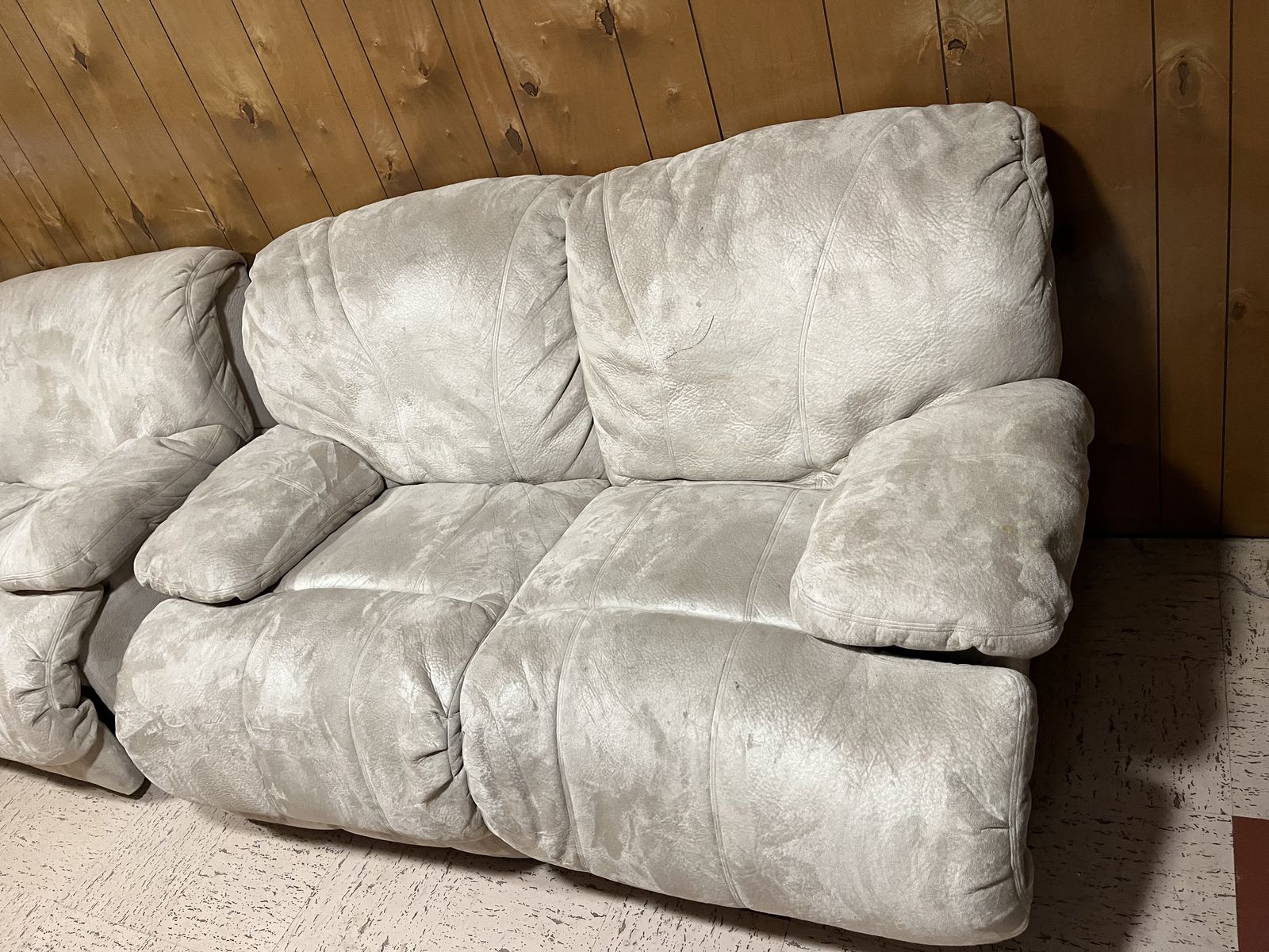 VenmoBeige microfiber couches. They’ve been in a playroom so they need a little cleaning but microfiber cleans up really well. 3 of the 4 edge seats recline at the touch of a button. The 4th reclines if you flop on it in the right position. $100 obo
