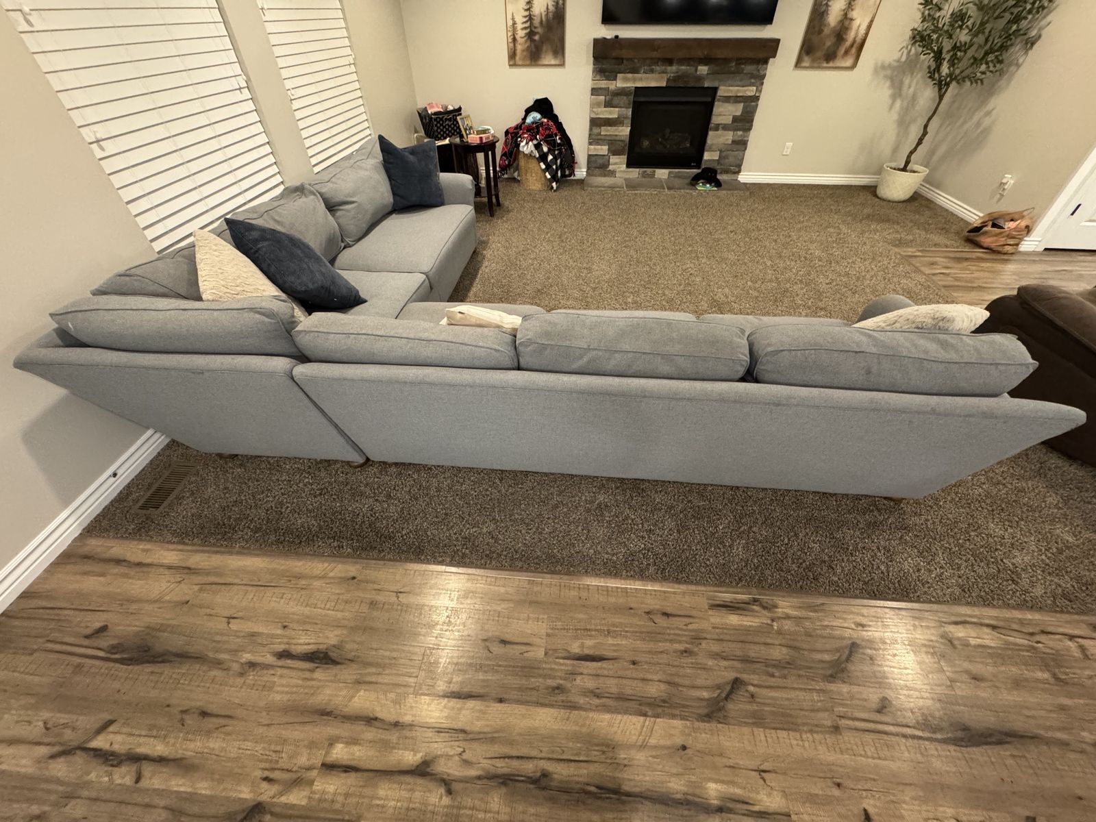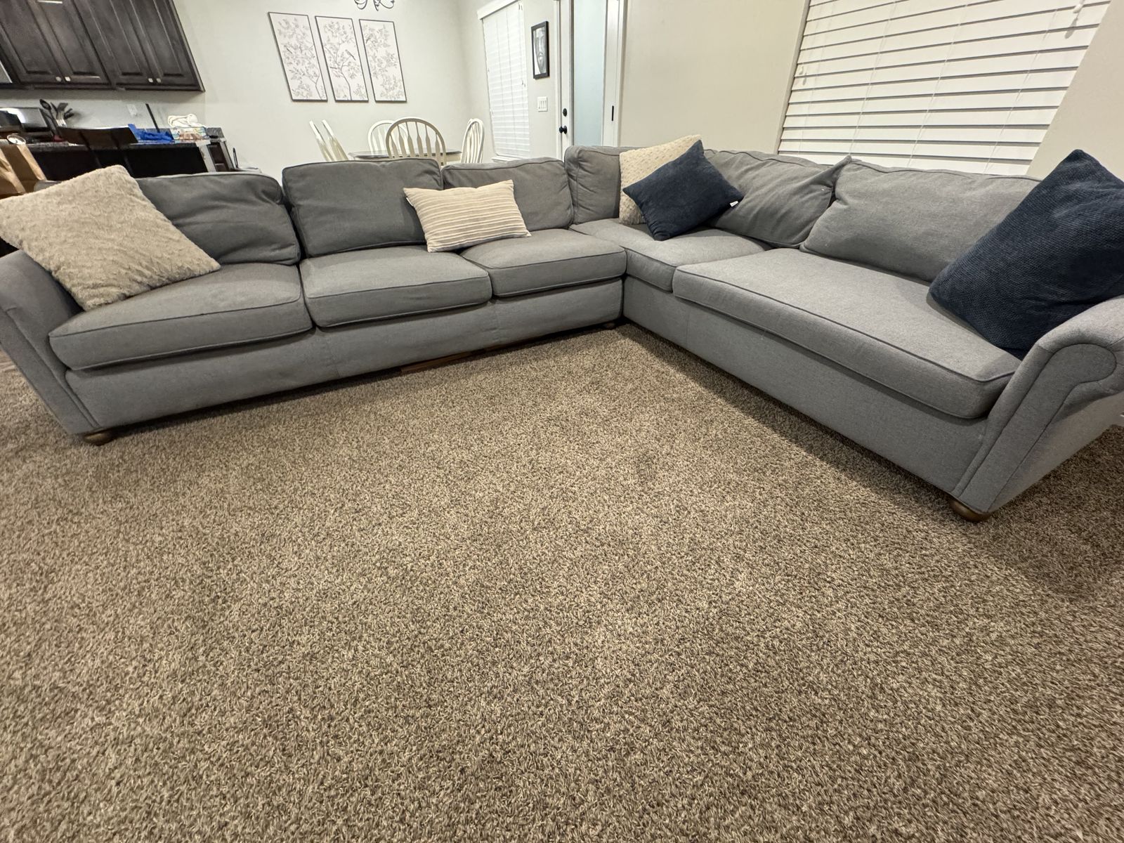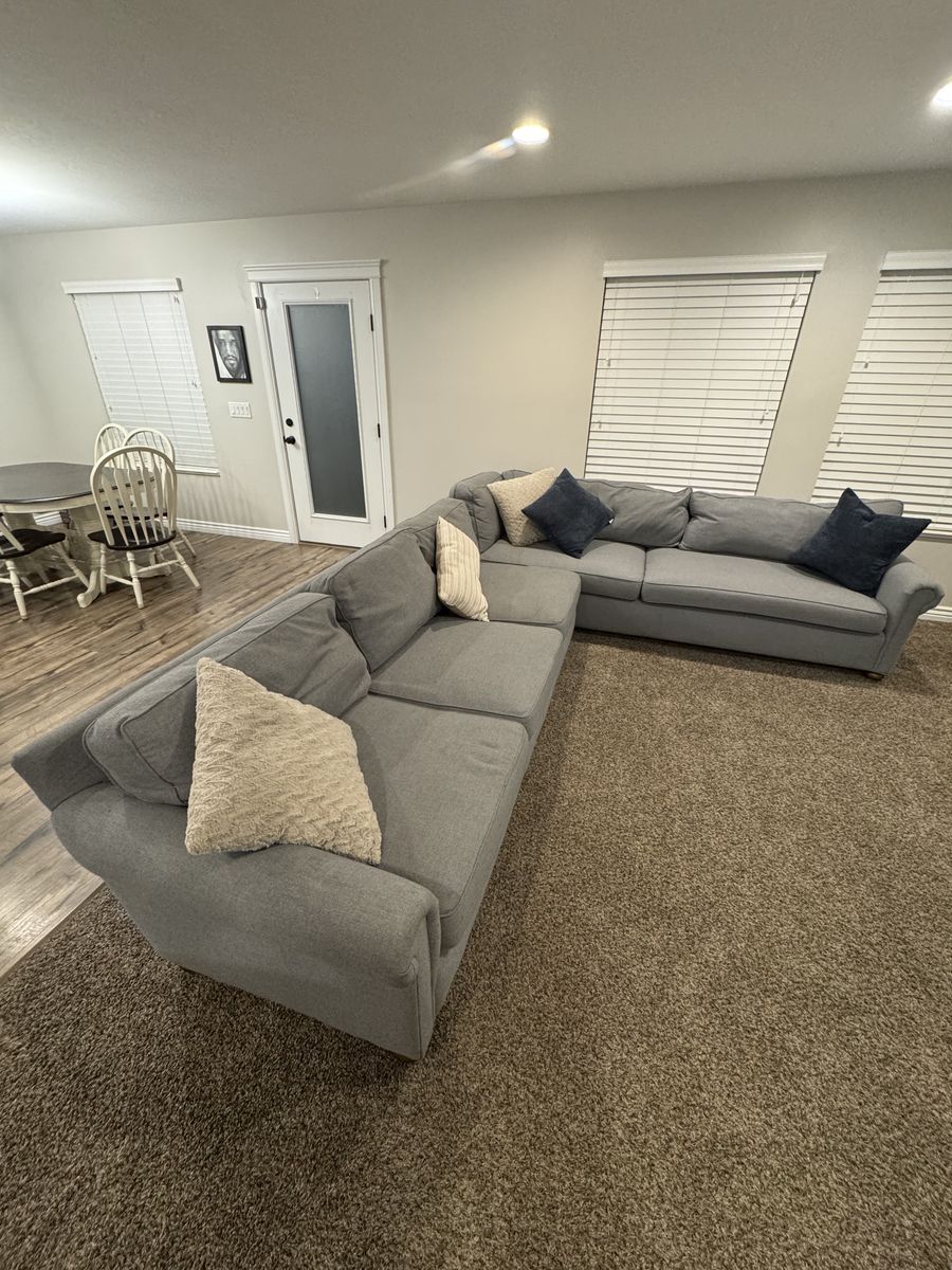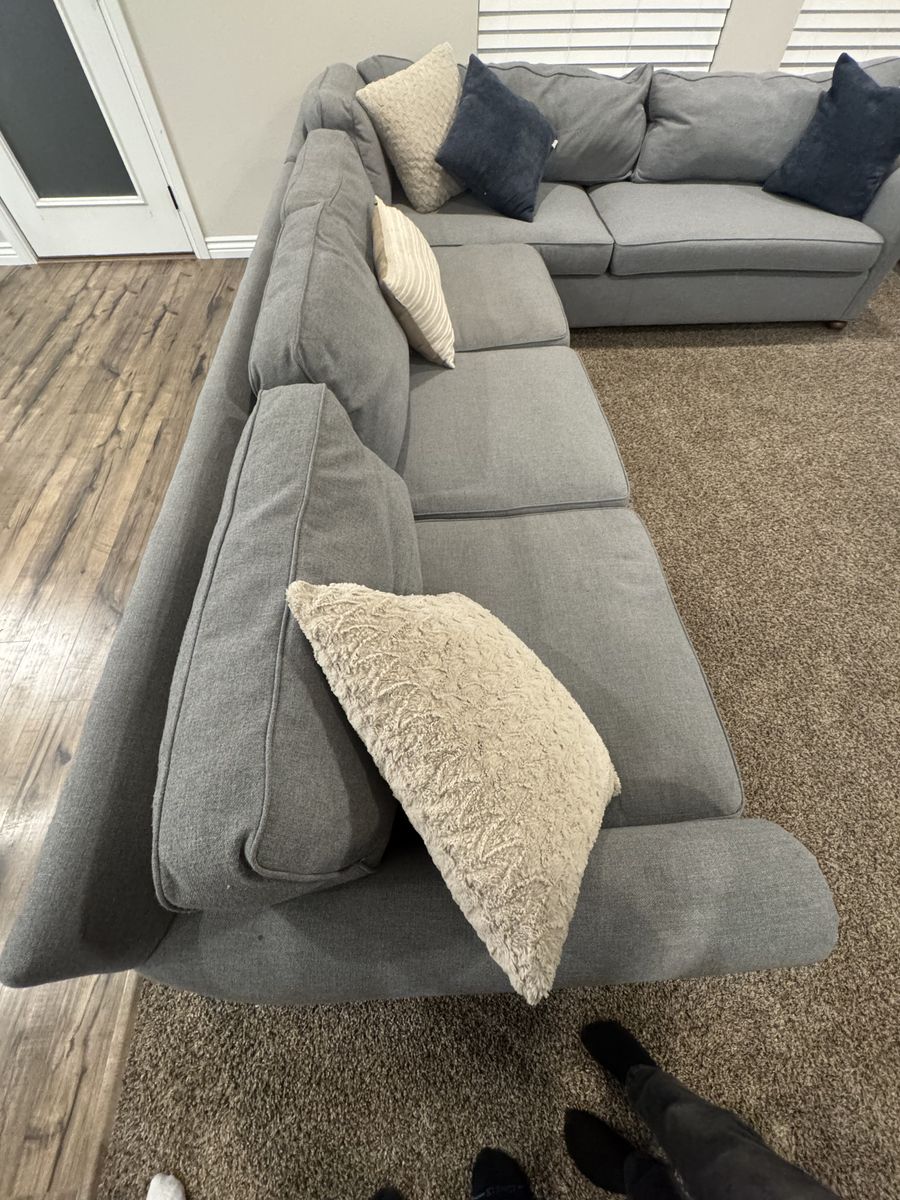 ZelleLight blue to grey sectional from Restoration Hardware. Very well made. Down filled back pillows. 132”x108” Some of the pillows are needing additional down filling. Because of that it I am selling it at a lower price.