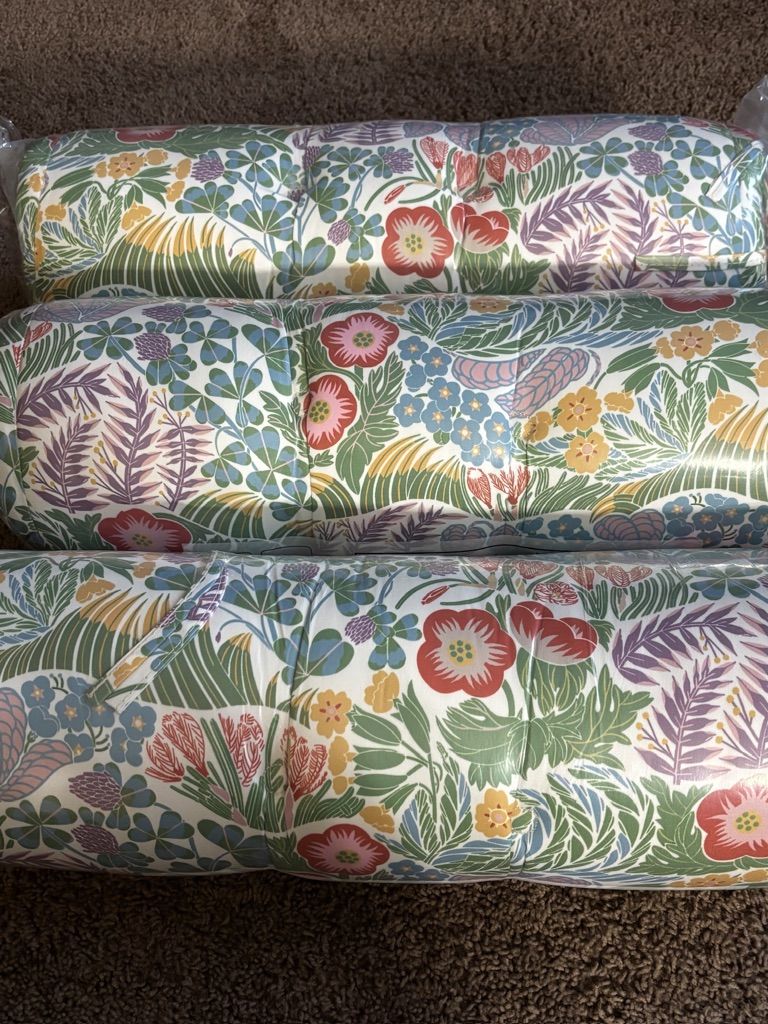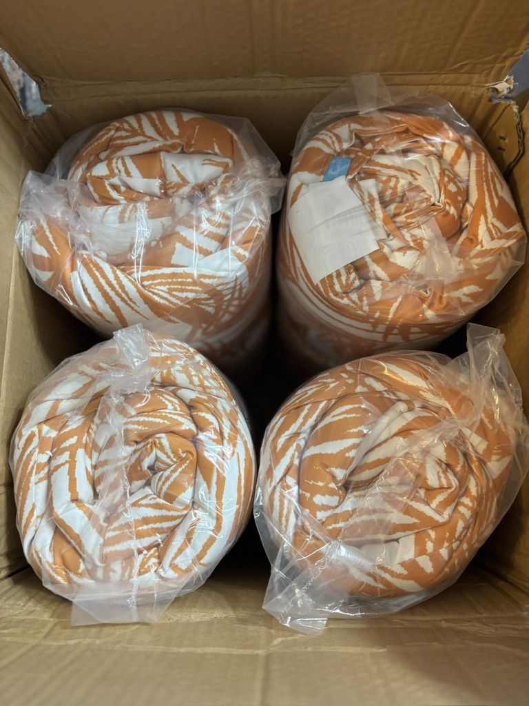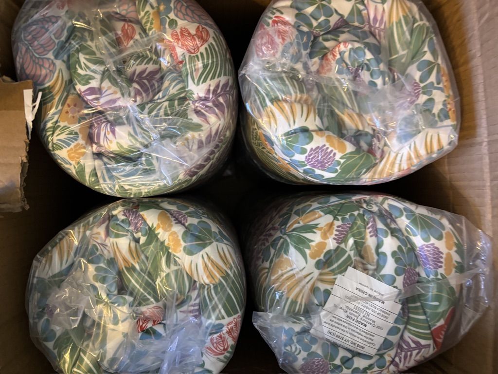All of these are the same tufted waffle style cushions, in three different fabrics--I have one set of 4 cushions in each color--multicolor floral, solid dark green, and white with dark orange colored palm leaves--as shown in photos.