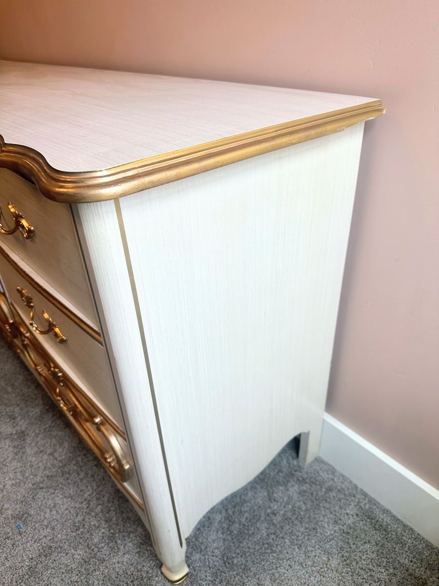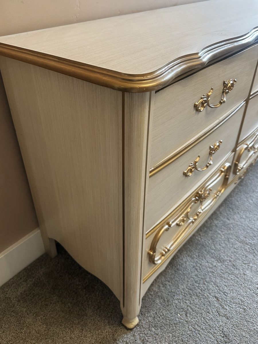 ApplePayElevate your space with this gorgeous, vintage-inspired French Provincial dresser. This solid, heavy-duty piece has been updated with a soft cream finish and elegant metallic gold accents that highlight its ornate curves and original hardware.
