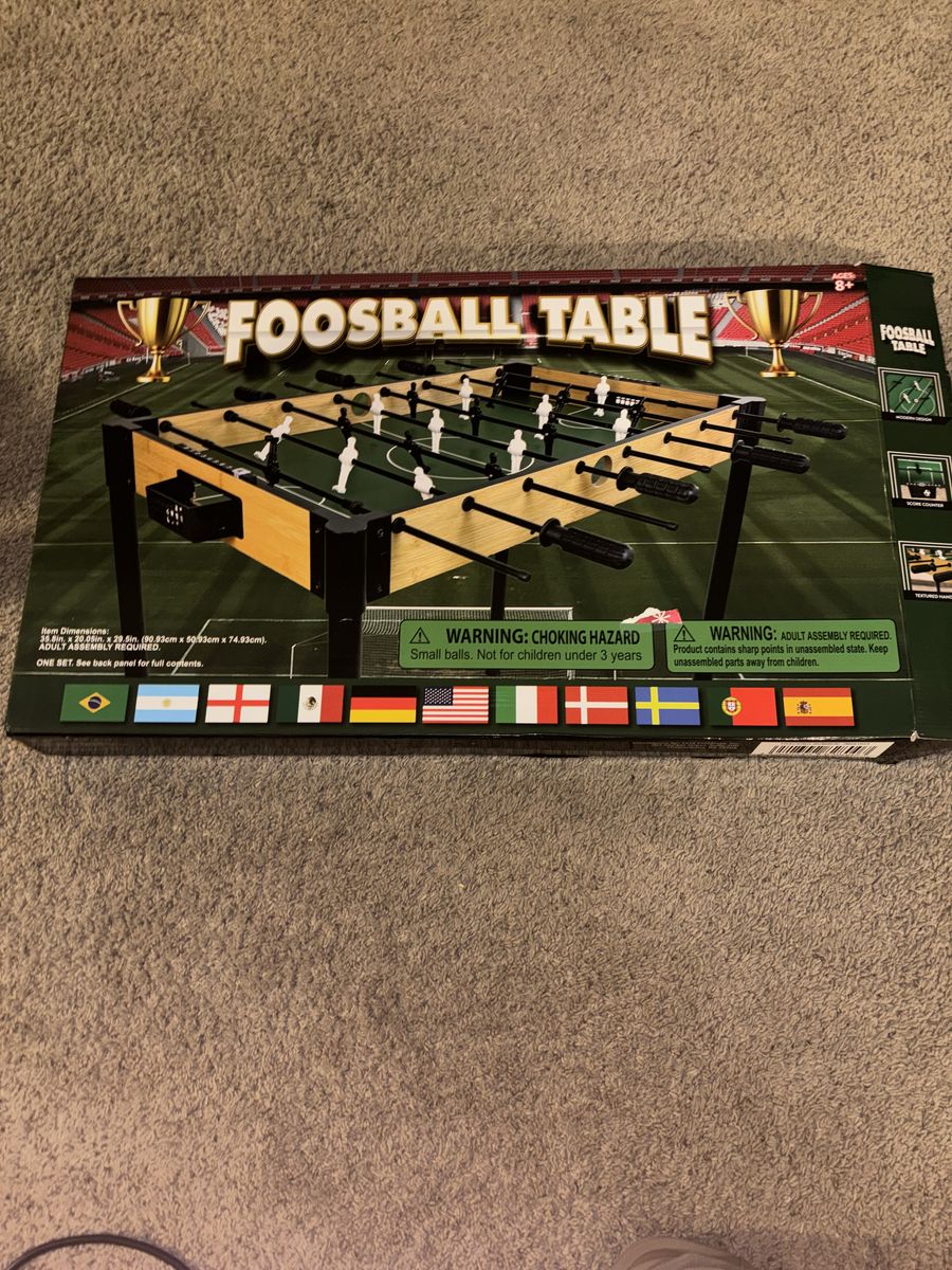 VenmoBrand new foosball table still in the box. Never assembled. Comes with table, instructions, and 2 balls. Great for a game room or basement.