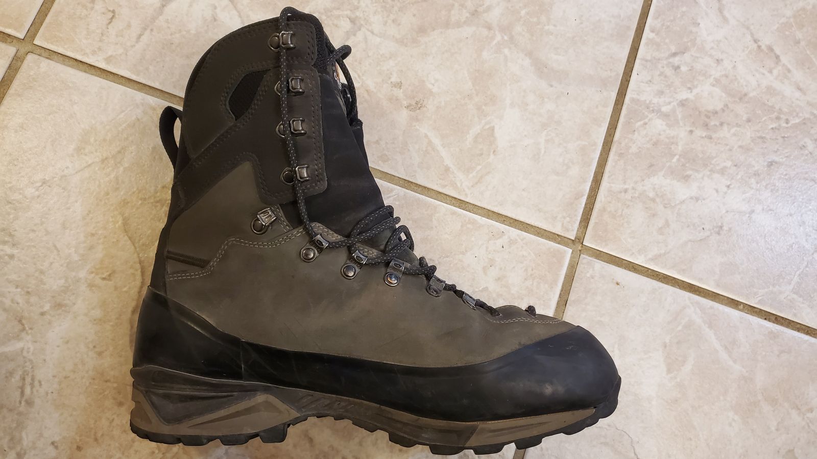 These boots were used for less than 20 miles and look new and have no scratches or rips in the rubber or leather. The insoles have not been used so there is not foot imprint or odor.