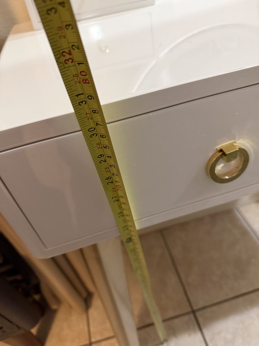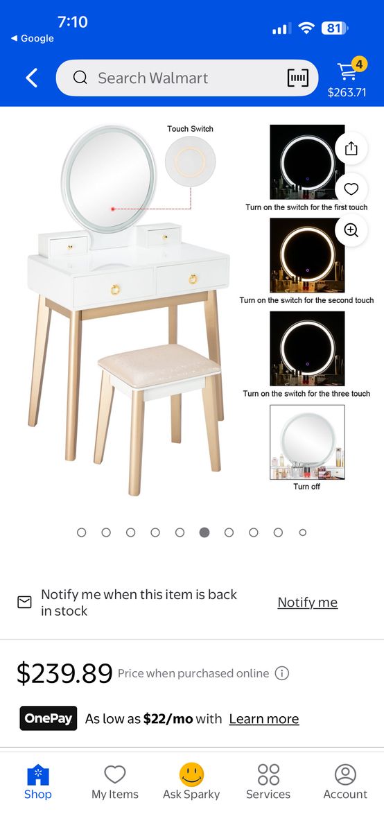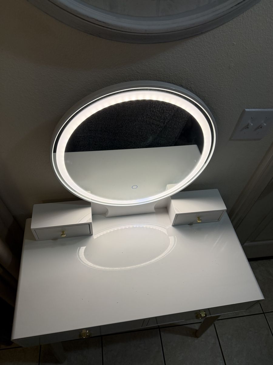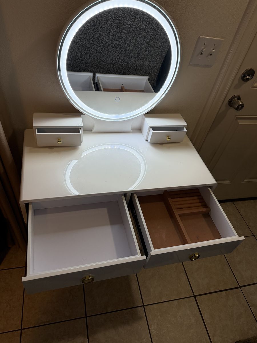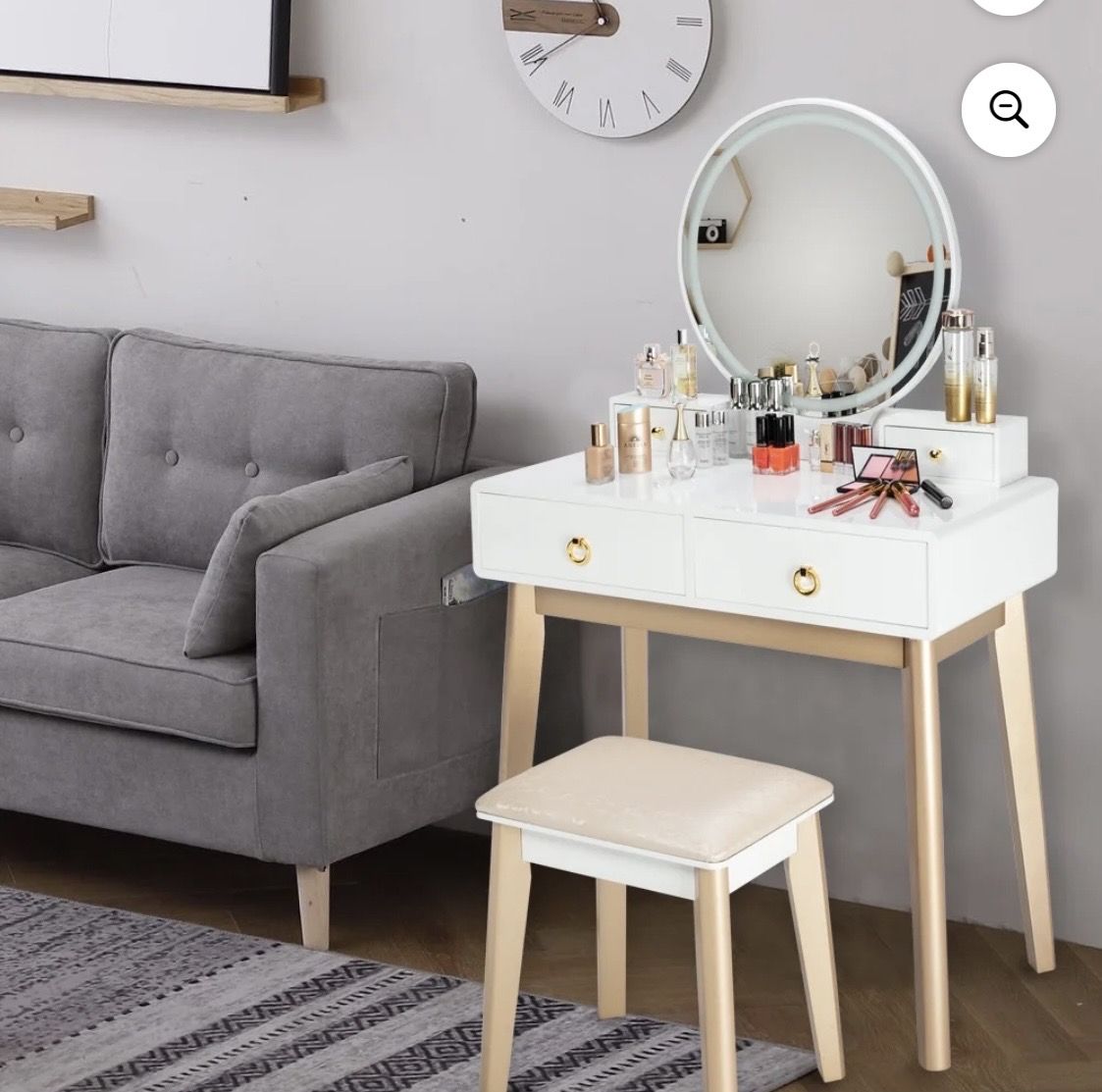 Vanity table with LED mirror, touch screen with 3 lighting modes, four polyurethane drawers, modern makeup table for girls or women.(Bench not included)