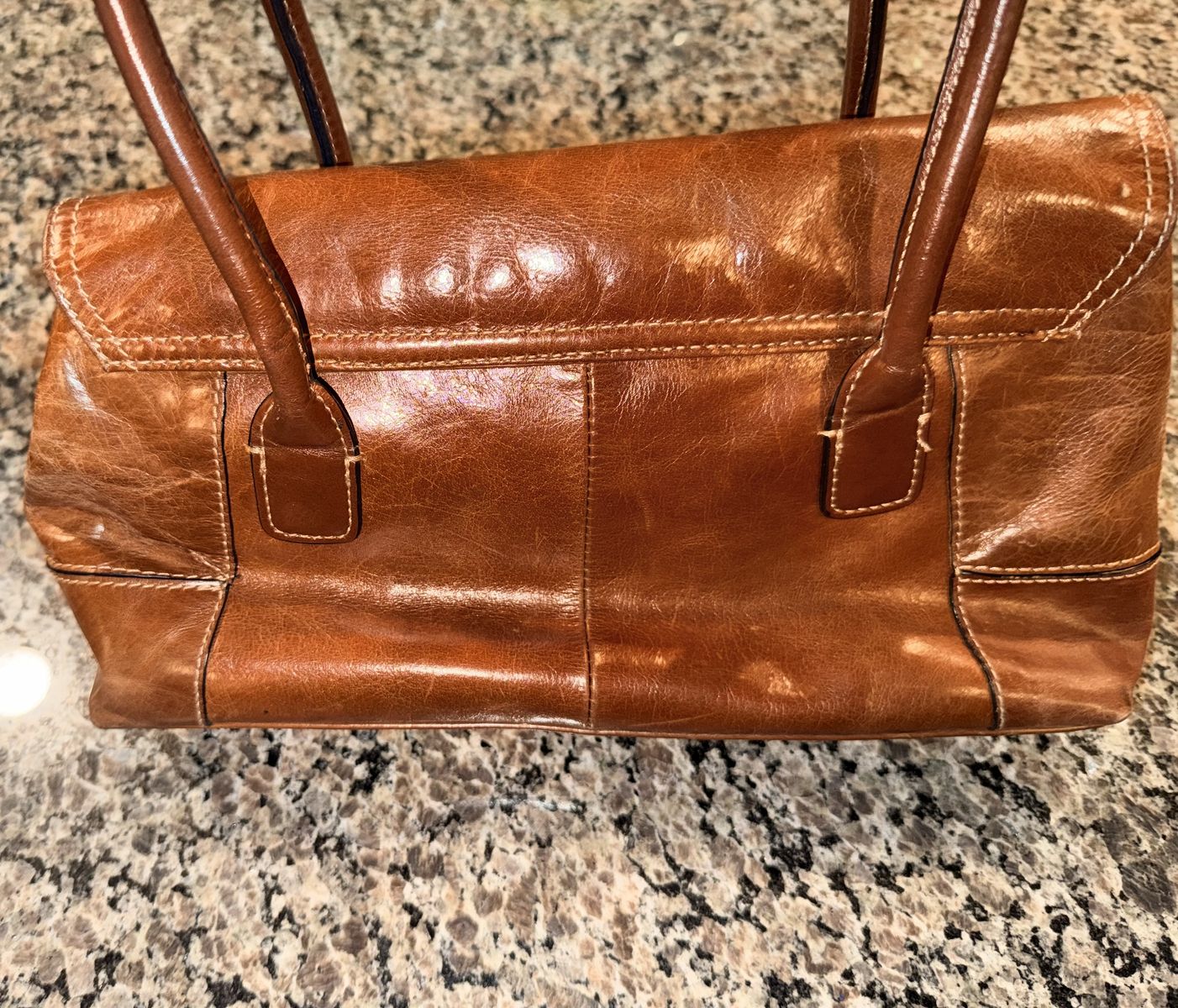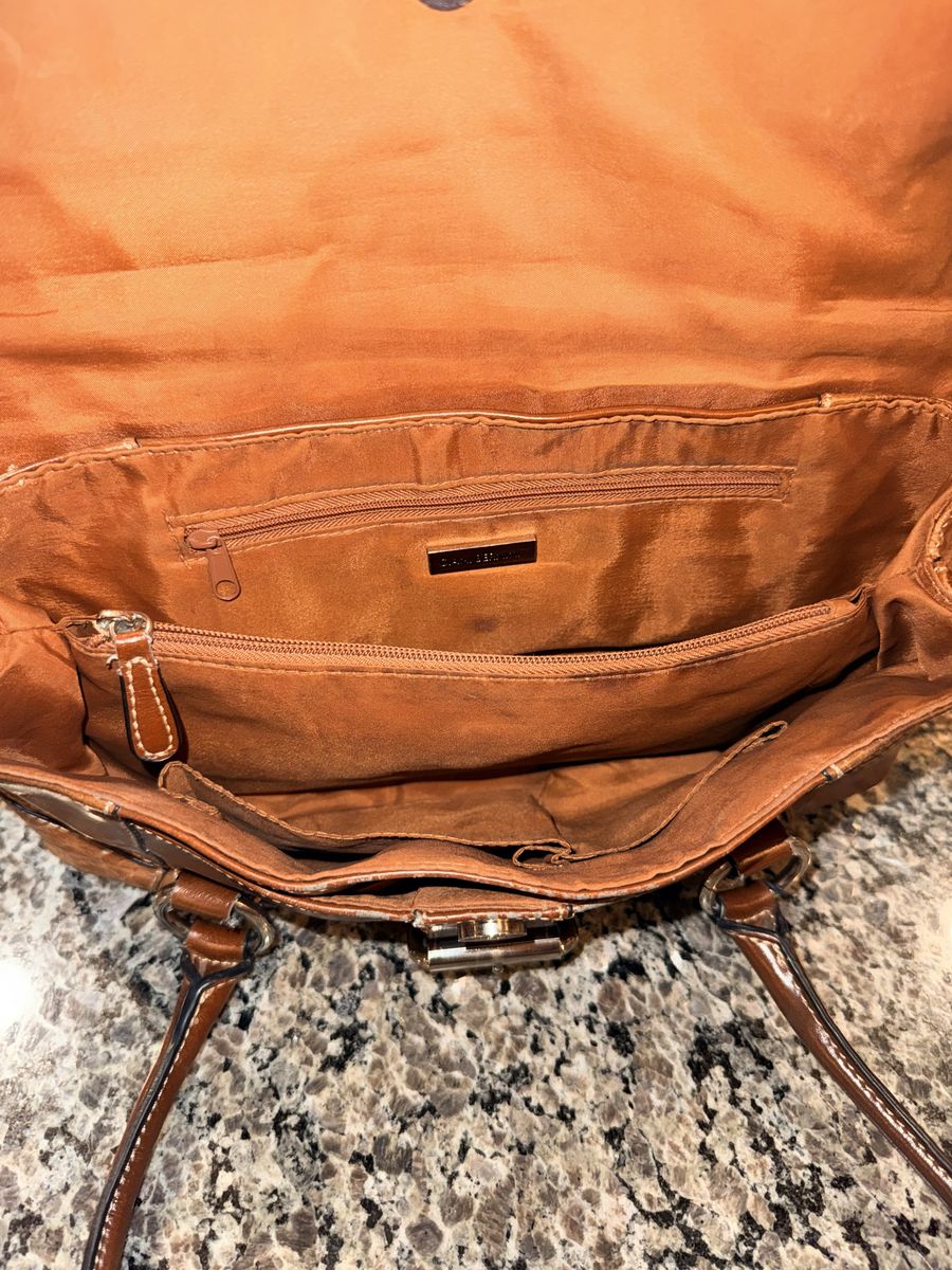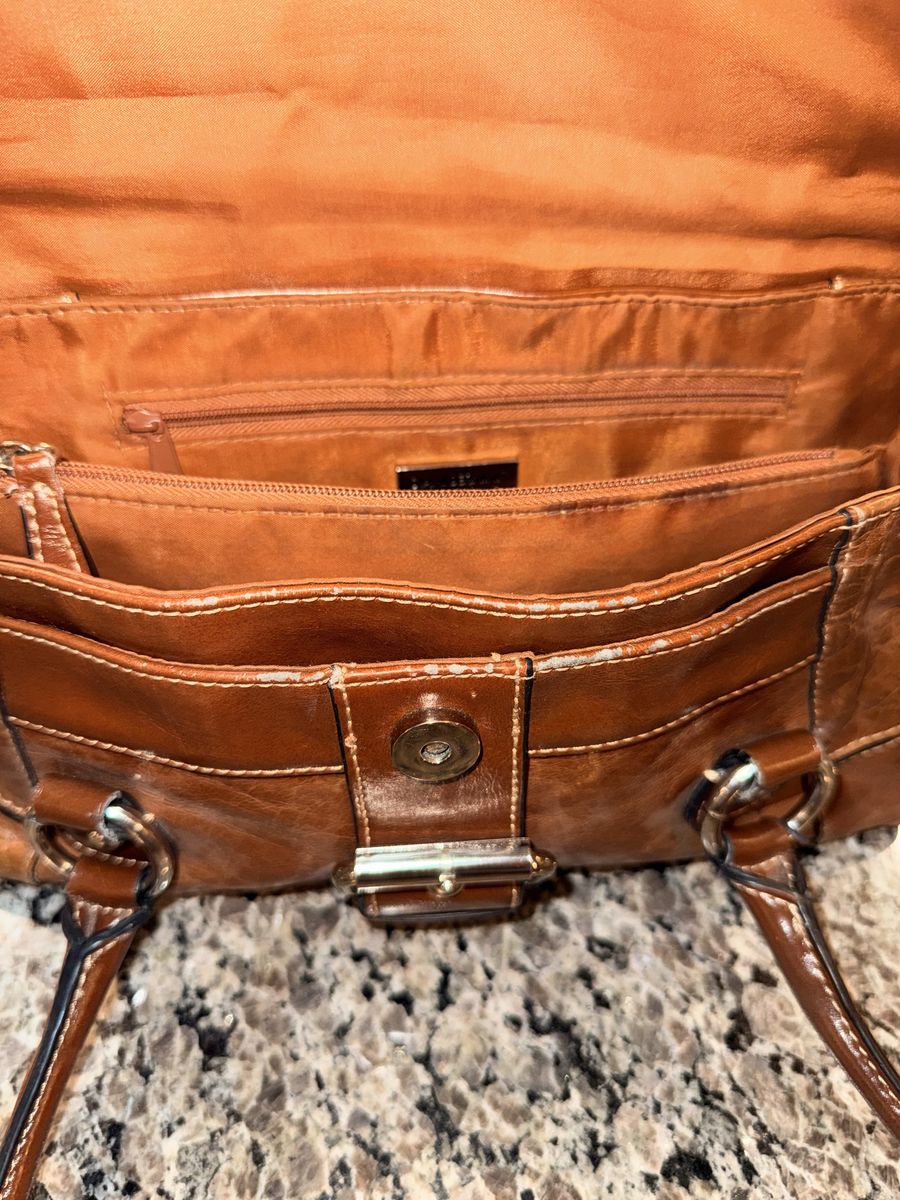 Top flap closure with magnetic snap in the front. Faux front buckle 2 interior sections, additional middle zippered section. Interior side zippered and multifunction pockets Silver tone hardware Double rolled handles, 9” drop. 13” x 7” x 3 purse measurements.