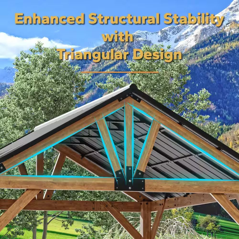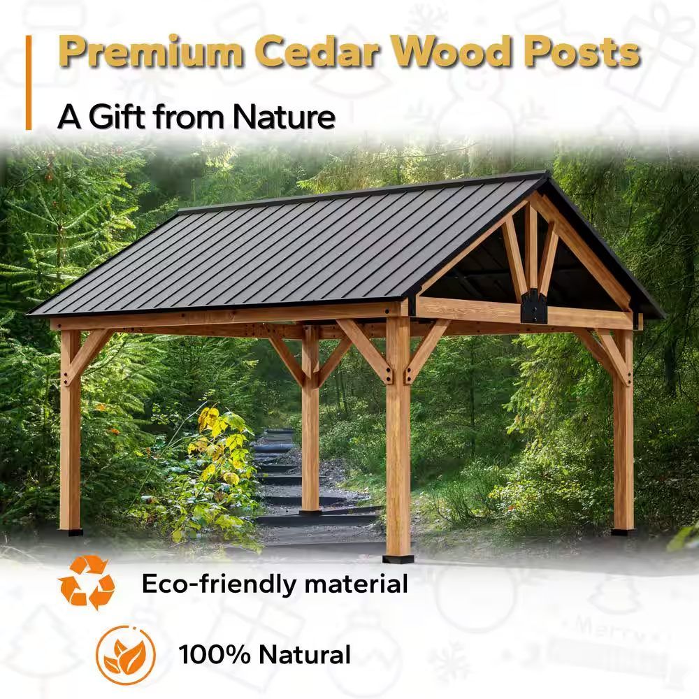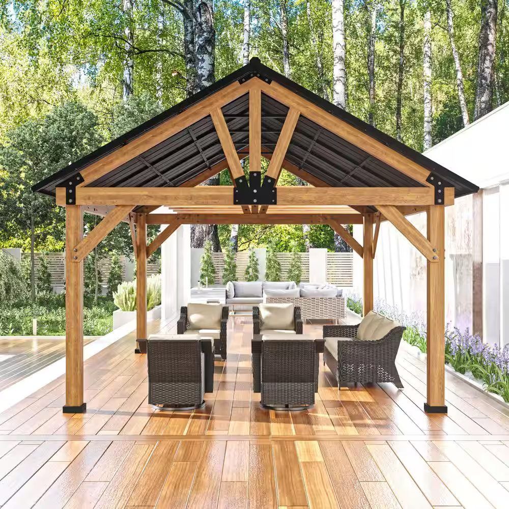 Introduce the glamour and comfort of a resort experience into your everyday life. The Joyside wood gazebo is the perfect item to bring elegance and ease to your deck or patio. The classic design adapts well to many styles of patio furniture. Expand your living space by bringing the indoors outside and creating your end-of-the-day oasis that's the perfect spot for meeting all entertainment needs with your family and friends. This item is built for stability, withstanding all kinds of weather and providing shade and shelter on even the hottest days. With straight-forward, easy-to-follow assembly instructions you'll be relaxing with your beverage of choice in your favorite new outdoor living space for years to come.. Canopy Style: Peaked. Color Family: Black. Commercial/Residential: Residential. Floor Options: Without Floor. Frame Material: Wood. Gazebo Features: Hardtop,Rust-Resistant Components,Water Resistant. Gazebo Type: Patio. Included: Assembly Instructions. Manufacturers Recommended Assembly Time (hours): 4. Manufacturers Recommended Tools needed for Assembly: Wrench, Screwdriver, Ladder and Gloves. Maximum Roof Load: 3900. Maximum Wind Resistance: 54. Number of People Recommended by Manufacturer to Assemble: 4. Outdoor Living Product Type: Gazebo. Product Weight (lb.): 523.2 lb. Returnable: 90-Day. Roof Color Family: Black. Shape: Rectangle. Approximate Depth (ft.): 13. Approximate Height (ft.): 10. Approximate Width (ft.): 15. Assembled Depth (in.): 156 in. Assembled Height (in.): 122 in. Assembled Width (in.): 179 in. Canopy Depth (in.): 156 in. Canopy Width (in.): 179 in. Coverage Area (sq. ft.): 195 sq ft. Height From Ground to Underside of Canopy Edge (in.): 83 in. Outside Post Spacing Depth (in.): 135 in. Outside Post Spacing Width (in.): 157 in. Overall Height from ground to top of canopy/Overall Dimensions in Height (in.): 126 in. Width (ft) x Depth (ft): 15x13. Width (ft) x Depth (ft): 15x13. Gazebo Features: Hardtop. Gazebo Features: Water Resistant. Gazebo Features: Rust-Resistant Components. Frame Material: Wood. Gazebo Type: Patio. Coverage Area (sq. ft.): 195 sq ft. Shape: Rectangle