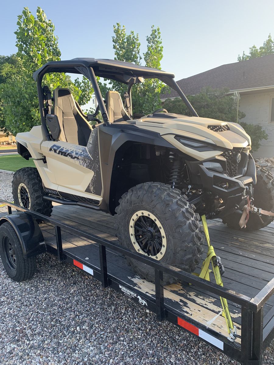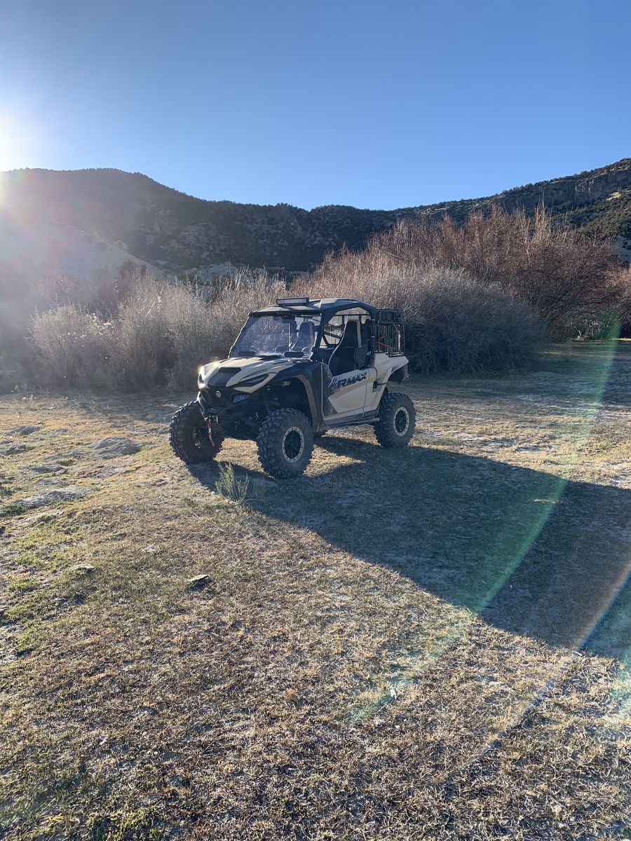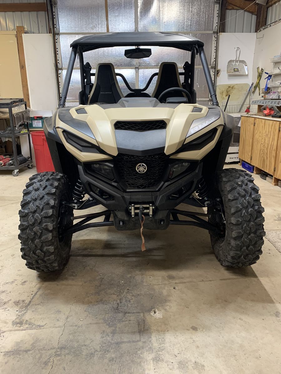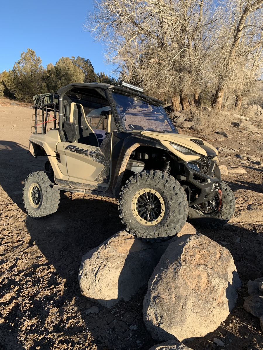 -30” carnivore tires with true beadlock wheels -factory installed warn winch -Yamaha Adventure Pro -Factory installed SSV Bluetooth sound system -factory installed drive mode switch -full SuperATV vented windshield with power wiper and fluid -tinted rear SuperATV window -LED light bar -Bandit tender springs (huge suspension improvement) -Weller tune -Weller exhaust tip -Weller air injection block off kit -Rear differential exhaust heat shield -Yamaha storage box -Rubber bed mat -Sound deadening material on roof -custom built metal cargo rack (used to haul full size SKB gun case up top with gear/dogs below and is easily removable)