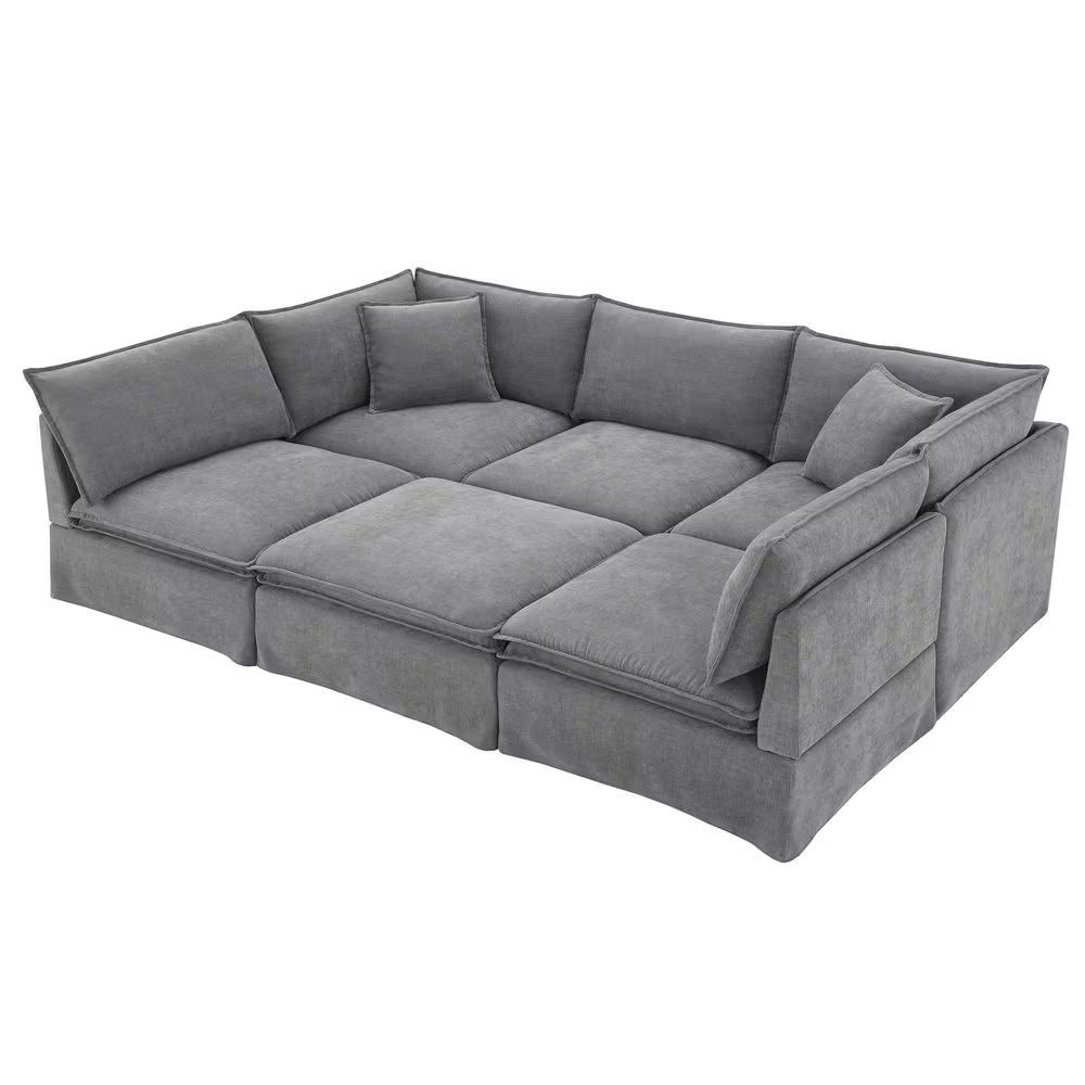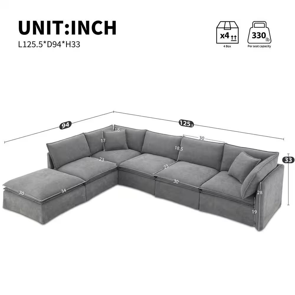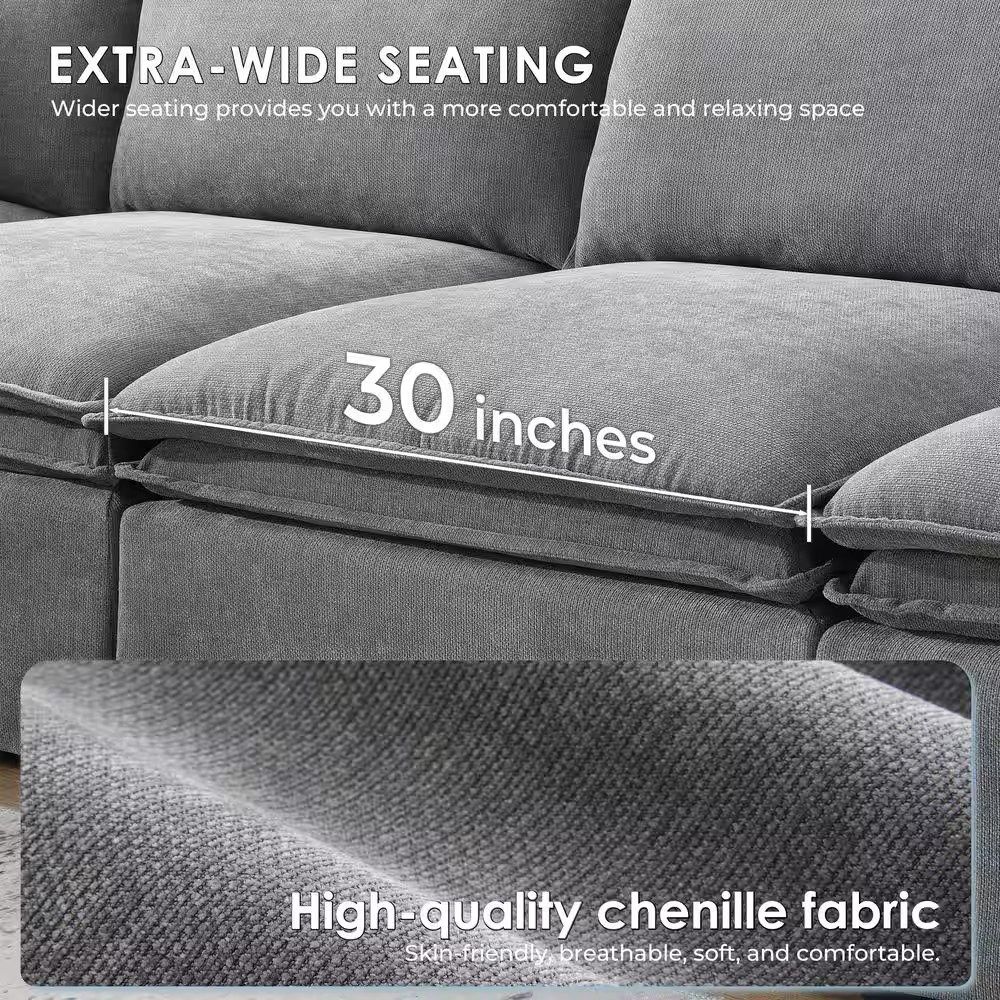 Create the perfect balance of luxury and comfort with the 125.5 in. 6-piece Modular Chenille Upholstered Sectional Sofa with Movable Ottoman. Designed with a spacious 30 in. seat width and cloud-like pure foam cushions, it delivers exceptional softness and support for ultimate relaxation. The high-quality chenille fabric and sturdy wooden frame ensure long-lasting durability, while the modular design allows you to freely rearrange each piece to suit any room layout or occasion. With its elegant skirt detailing and inviting texture, this sectional sofa elevates your living space with modern sophistication and cozy charm.. Modular design allows easy customization. High-density foam and oversized chenille for enhanced comfort. Solid wood frame ensures durability. Arm Style: Straight Arm. Assembly Required: Assembly Required. Back Style: Attached Pillow. Color Family: Gray. Color/Finish: Light Gray. Cushion Material: Foam. Features: Armrests,With Ottoman. Frame Material: Wood. Interior Furniture Type: Sectional with Ottoman. Number of Pieces: 6. Orientation: Left Facing. Seats: 6 Seat. Shape: L-Shaped. Upholstery Material: Chenille. Weight Capacity (lb.): 330 lb. Product Depth (in.): 94 in. Product Height (in.): 33 in. Product Width (in.): 125.5 in