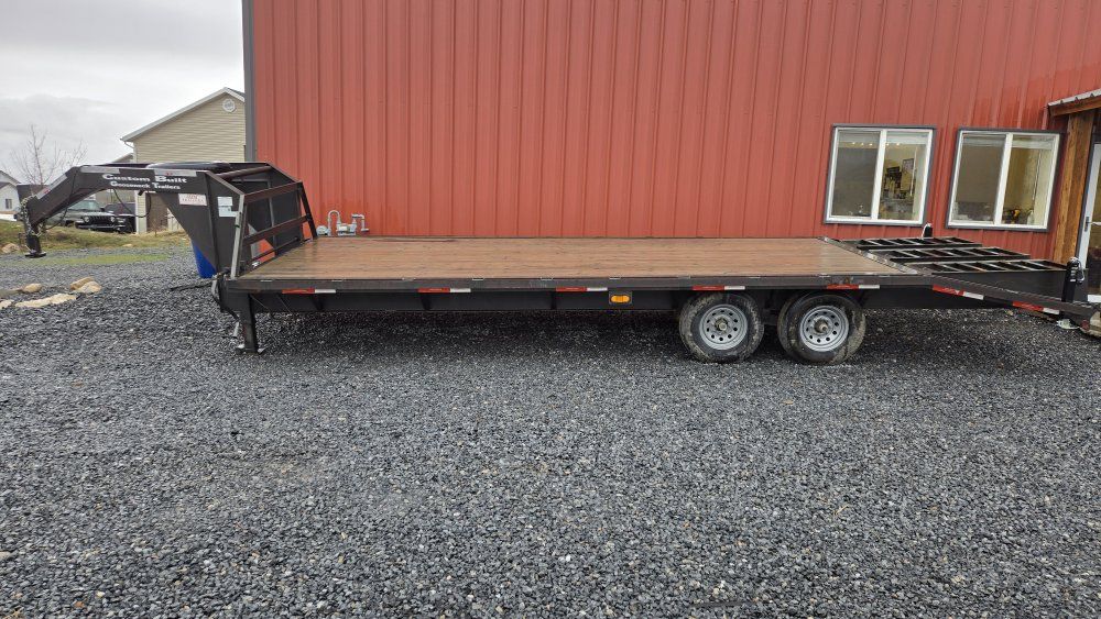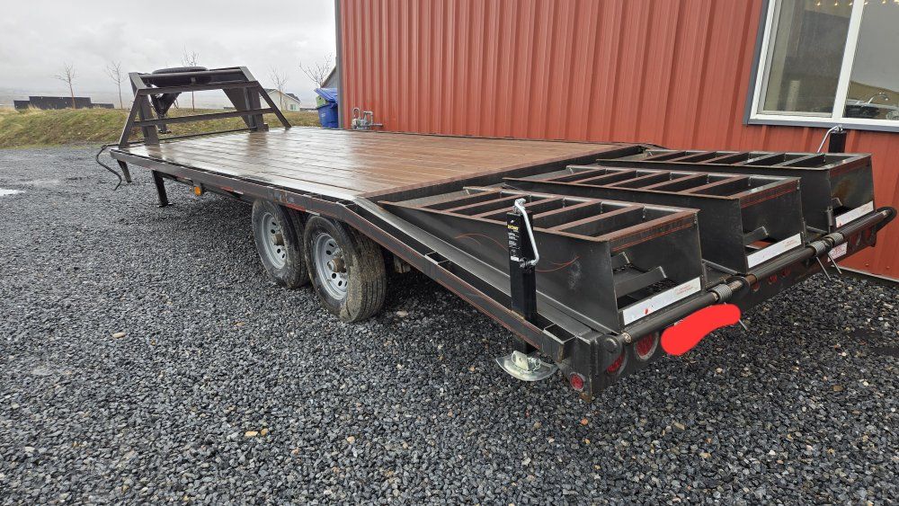 24 ft Gooseneck Deckover trailer. Great trailer, just don't use it much anymore and need to make more room for other things. 14k GVWR. Tires were a little dirty for the pictures due to the rain, but they're in great shape and the spare is nearly new. Make me an offer!