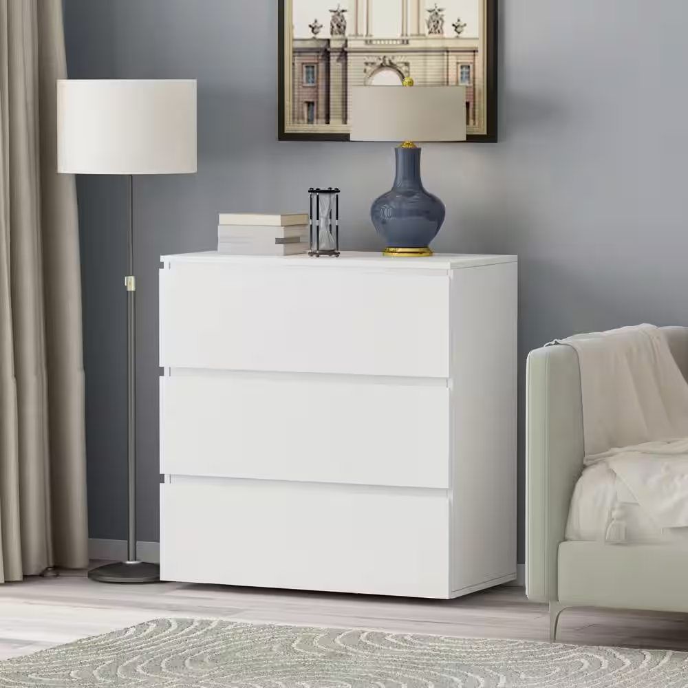 Timeless in design, the 3-Drawer Chest create the organized room of your dreams. Painted inside, out, and all around for a coherent look, this chest of drawers will add style and charm to any room of your house. The 3-spacious drawers offer enough organized storage for a plethora of clothes, games, or anything else that would otherwise create a room in disarray. It is engineered out of high quality wood making it durable and long lasting. Make your room dazzle with this compact dresser that's painted inside and out for a complete look; let its versatility shine in your bedroom as a dresser or nightstand, as a side table in the living room, or put 1-in each room for a unified look.. Assembly Required: Assembly Required. Color Family: White. Color/Finish: White. Finish Family: Other. Furniture Features: No Additional Features. Interior Furniture Type: Chest of Drawers. Material: Wood. Number of Drawers: 3. Product Weight (lb.): 61 lb. Returnable: 30-Day. Top Material: Medium-Density Fiberboard (MDF). Drawer Depth (in.): 11.8 in. Drawer Height (in.): 5.5 in. Drawer Width (in.): 33.3 in. Product Depth (in.): 16 in. Product Height (in.): 32 in. Product Width (in.): 30 in. Number of Drawers: 3. Material: Wood. Assembly Required: Assembly Required. Finish Family: Other. Top Material: Medium-Density Fiberboard (MDF)