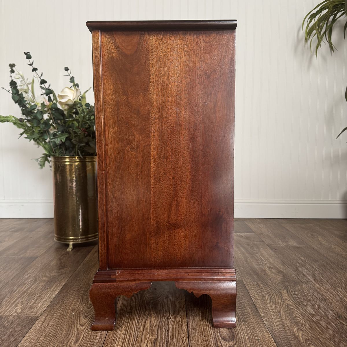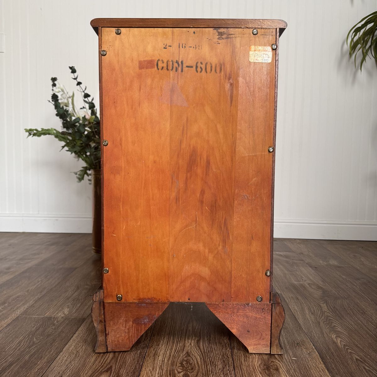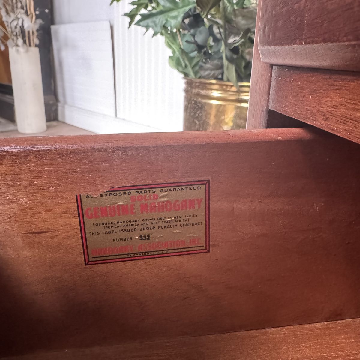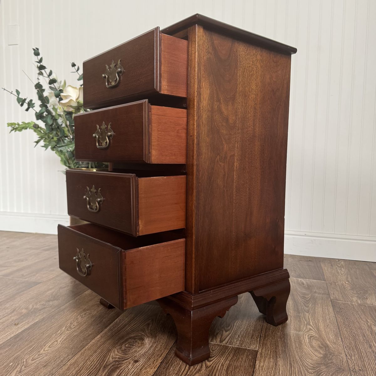 VenmoBeautiful mid-20th-century nightstand / small bachelor’s chest by the Elkins Furniture Company. This is a Colonial Revival piece crafted from solid mahogany—certified by the original Mahogany Association label (No. 332) still attached to the drawer. Features Chippendale-style bracket feet, original brass hardware, and four smooth-gliding dovetailed drawers.