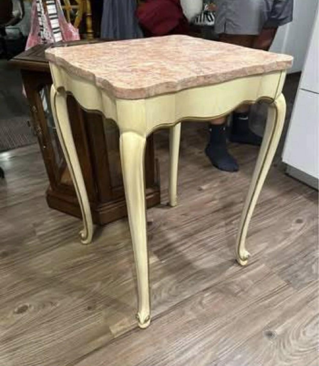 PayPalCharming mid-century French-provincial style side table featuring a warm pink-cream marble top and elegant cabriole legs.