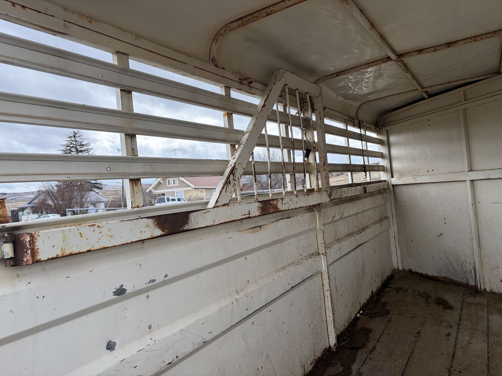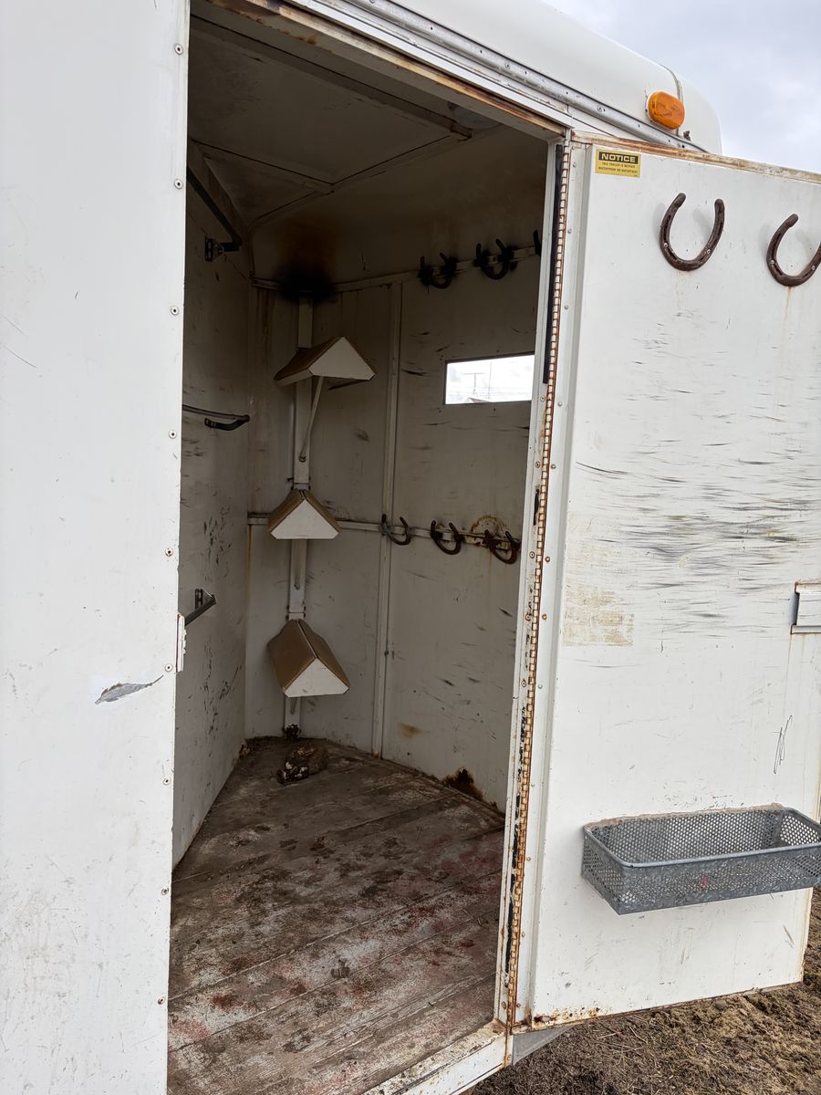 She’s got some rusted through spots, I have the second slant that goes in the front it’s just not pictured the horses we hauled were too big for both slants to be in there. It does have 1 cracked floor board that need replaced and the door holder for the tack room needs replaced. Lights work on our vehicles, we did have to rewrite it after we got it so it may need redone to your vehicle but as it stands it works, it does have floor mats that come with it i pulled them out to clean it and get pictures. I have fit 16/17 hand horses in this trailer with two smaller end horses in it and never had an issue with it pulling.