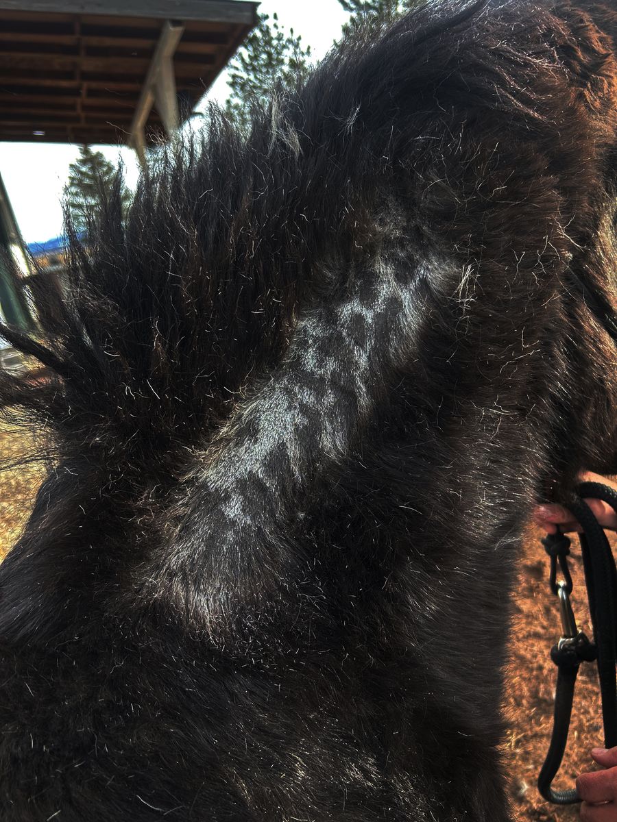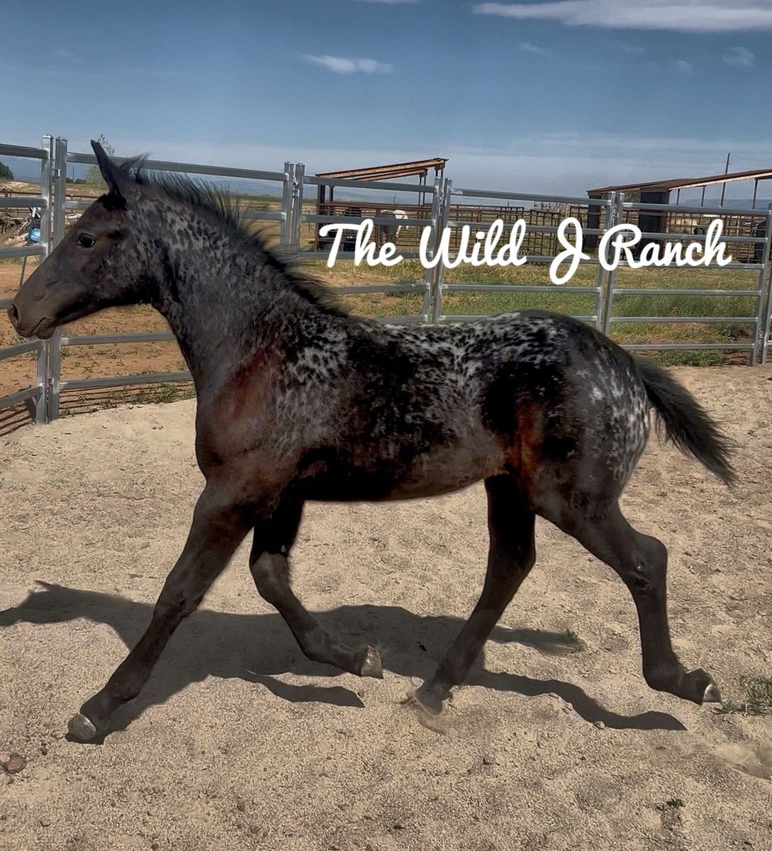 PJA Ghostwind Spirit x Maryshka I Black Leopard Friesian x Appaloosa Filly Born 5/28/25 This filly carries Lp & Patn1 She's our biggest foal of the year! Very Chill but will go all day type. Loves attention and grooming. Amazing with her feet.