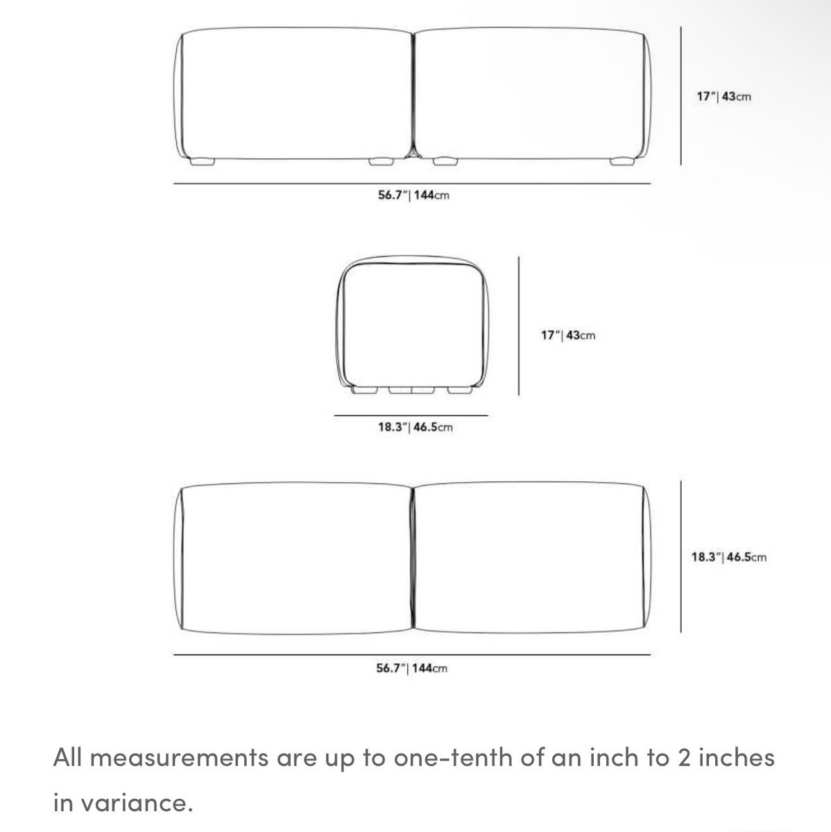 56.7 in x 18.1 in x 16.9 in (Width x Depth x Height) Max weight limit: 440 lb