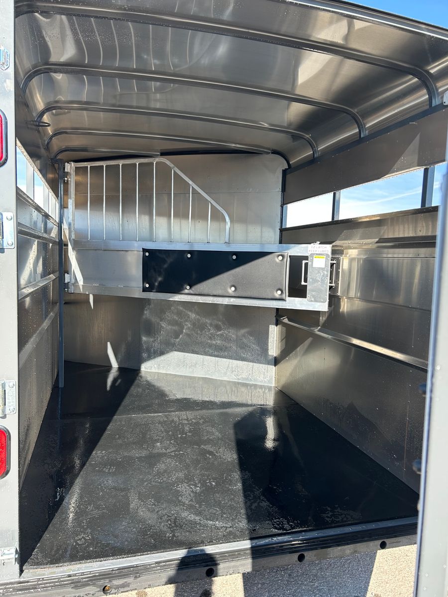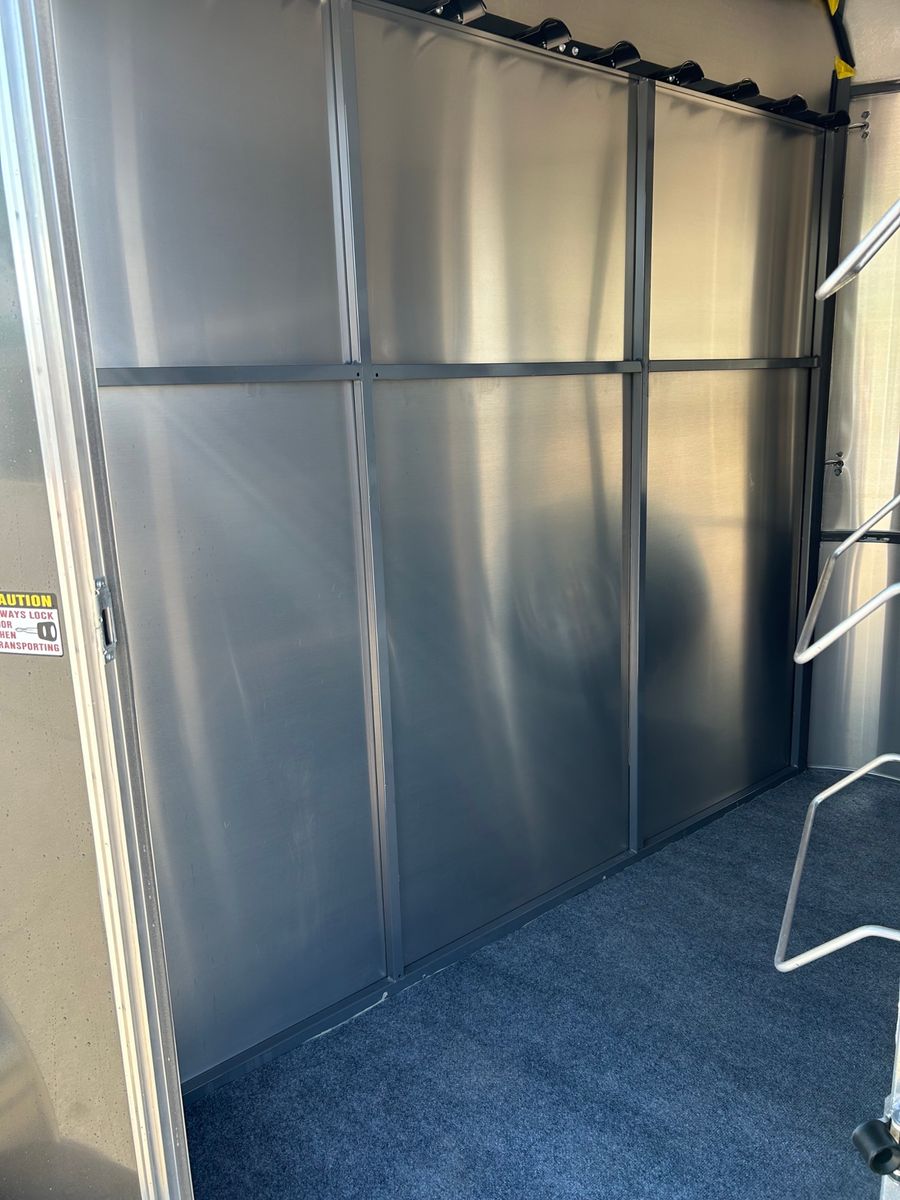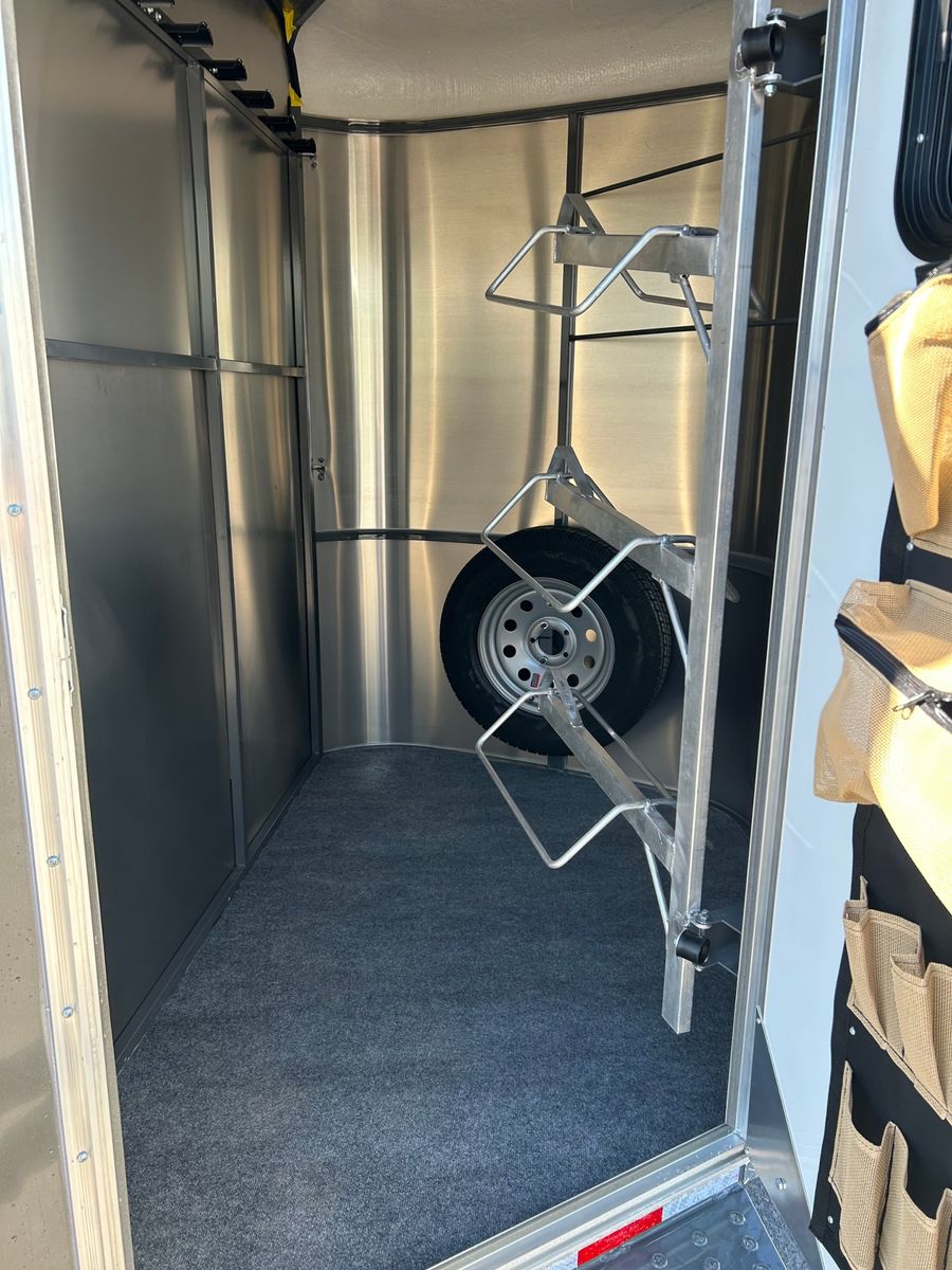 2 Horse Slant Load Front Sealed Tack Swing Out Saddle Racks Door Organizer Bridle Hooks Horse Area Has Floor Mats Aluminum Jail Bar Divider w/ Pad Spare Tire