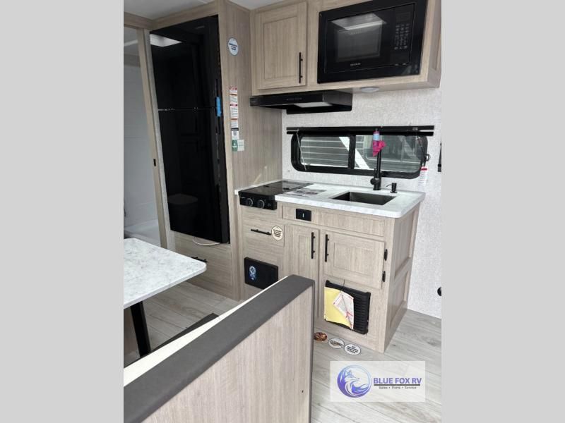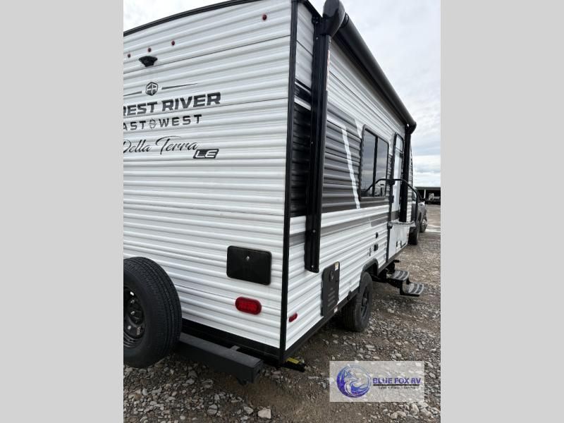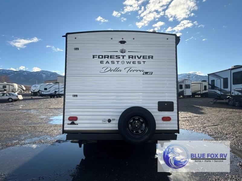 With any Della Terra LE travel trailer by EAST TO WEST, you will enjoy lightweight towing thanks to the single axle, along with many interior comforts. Each model is 8' wide with a 6' 9" interior ceiling height so you can walk around freely. There are seamless countertops also, along with motion sensor lights, a shower surround, and a USB charging station to keep your electronics ready to go. Outside, you'll find solar prep and ladder prep, an outside shower with hot and cold water, and a power awning with an LED light that will provide you with an inviting space outdoors.