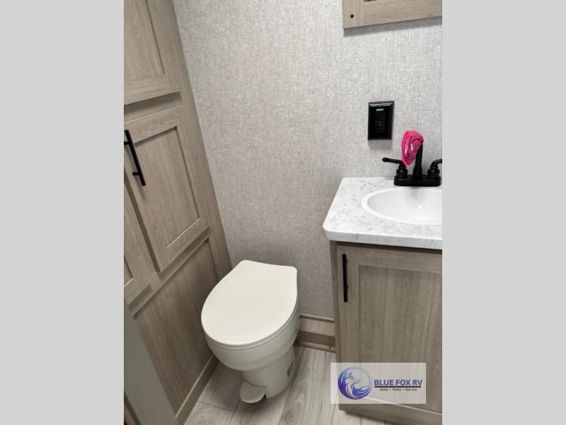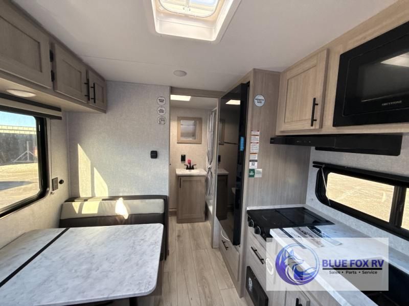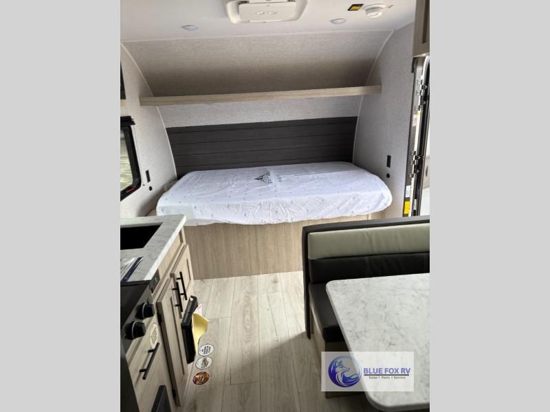 This Della Terra LE model is the perfect couples unit featuring a front queen bed that features flip-up storage and an overhead shelf for books. There is a booth dinette with storage beneath the seats to accommodate everyone for a meal, or to gather for a game of cards. You will appreciate the rear bath featuring a 24" x 40" walk-in shower, toilet, vanity/sink with a medicine cabinet, and additional storage for towels. The kitchen allows you to cook while you travel inside with a refrigerator, two burner range, and overhead microwave oven. A 12' awning outside offers an added living space protected from the sun and rain, and your camp chairs and outside equipment and games can be neatly tucked away in the large pass-through storage up front.