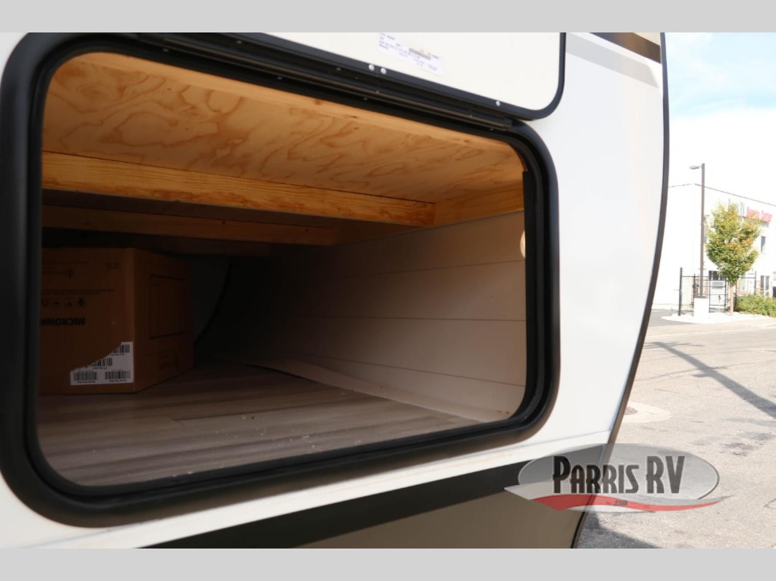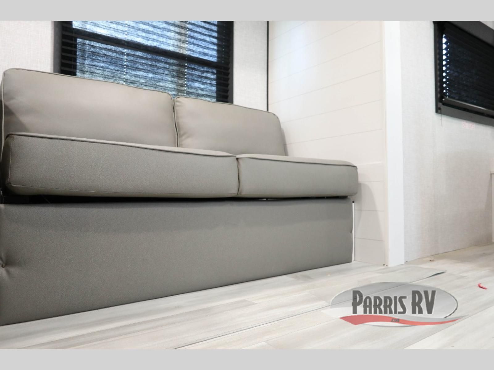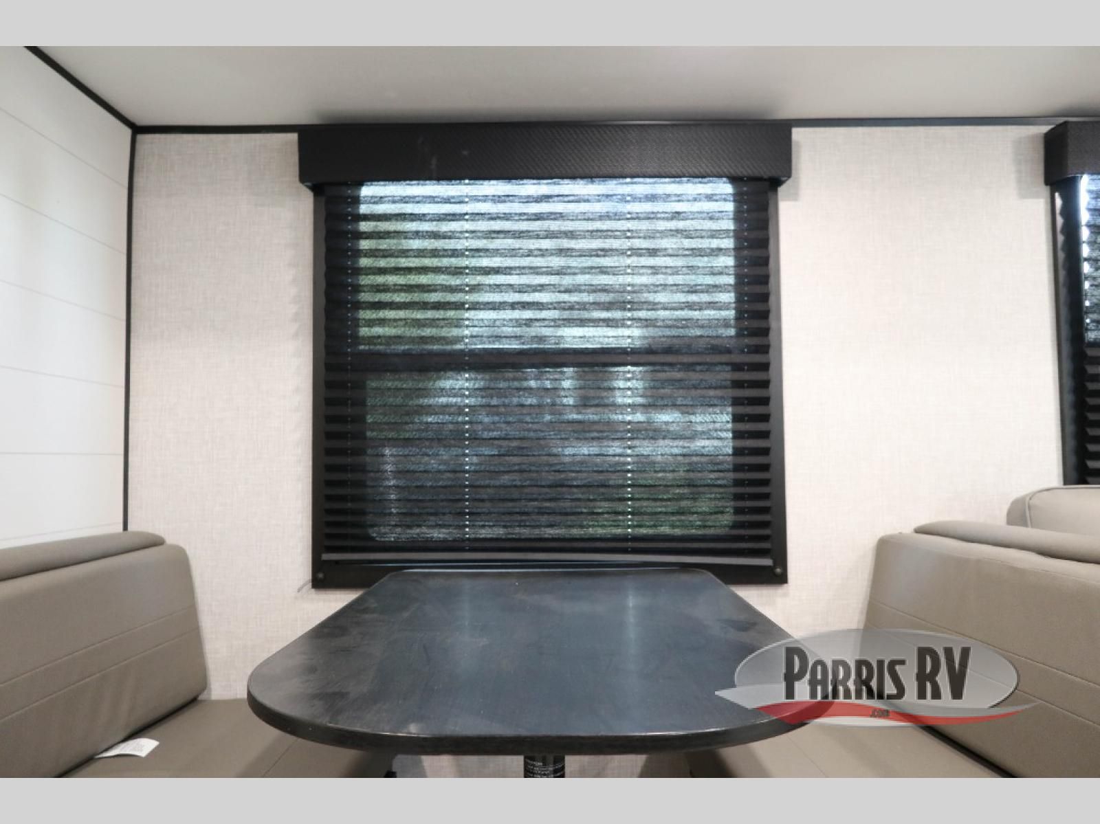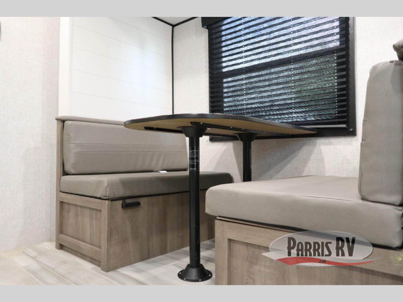 You're going to love every minute spent in this spacious travel trailer. The booth dinette and jack-knife sofa within the large slide out will be perfect for meal times, relaxing, and additional sleeping space. Add the optional Smart TV to the entertainment center and you're set up for movie night! This model includes an outside kitchen with a griddle and a refrigerator for cold drinks, plus indoor appliances if the rain has ruined your plans for the day. You will enjoy your own bedroom up front with space-saving sliding doors and two wardrobes for your clothes.