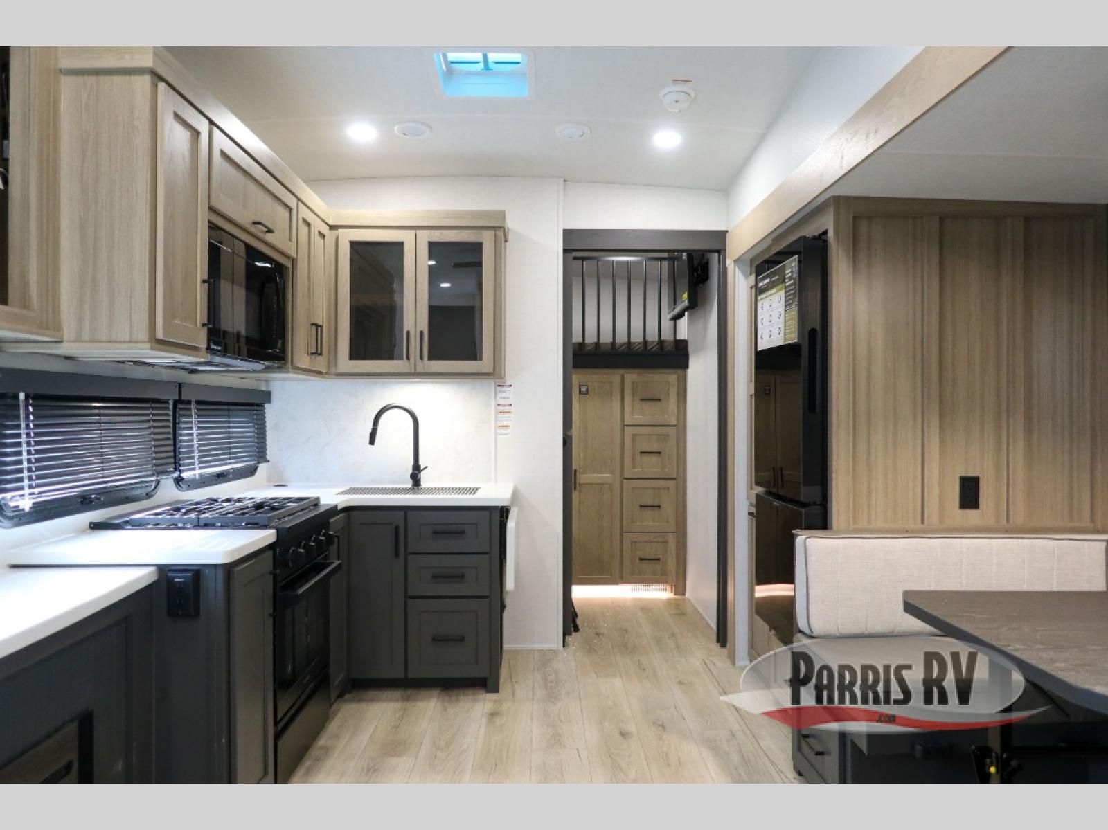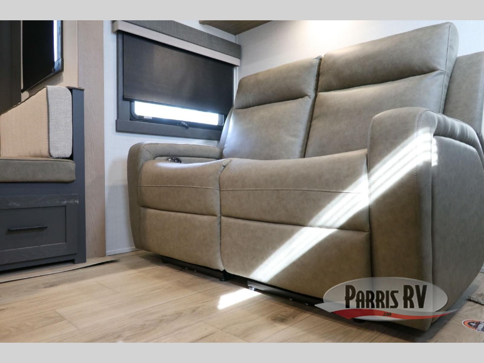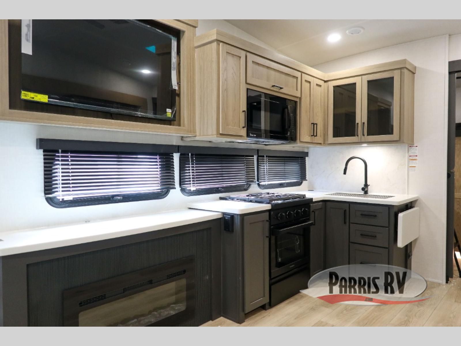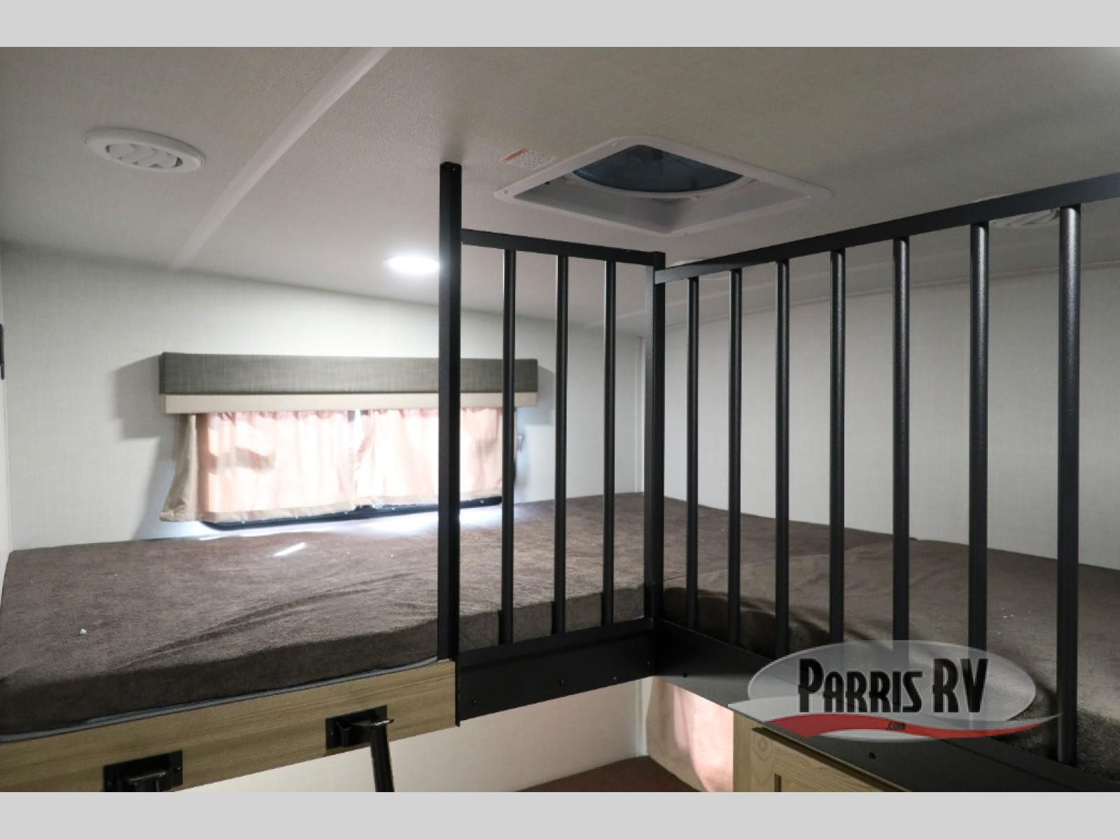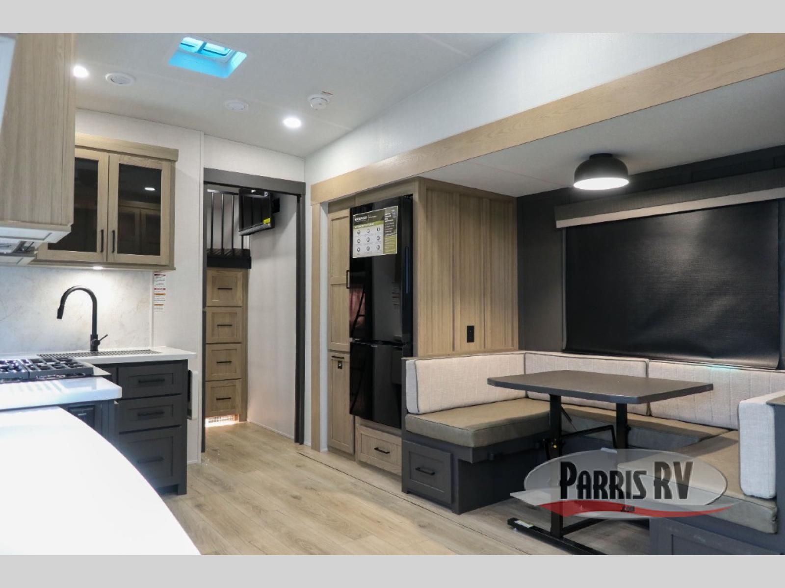 Looking to travel with your family and friends and need lots of space for everyone? This fifth wheel offers a front private bedroom with a queen bed, a spacious wardrobe, and a TV option for shows in bed. On the opposite side of the unit there is a private bunkhouse with triple bunks, plus washer and dryer prep. The main living and kitchen area includes a slide out which offers a king U-shaped dinette to dine at, play games with friends, and provides sleeping if needed, plus a 12V refrigerator and a pantry. There is also a 55" theater seat here for more comfort. The cook will have full amenities indoors plus an outside kitchen when the weather is nice. There are also two power awnings, Solid Entry steps, a rear 2" towing hitch, and more exterior conveniences!