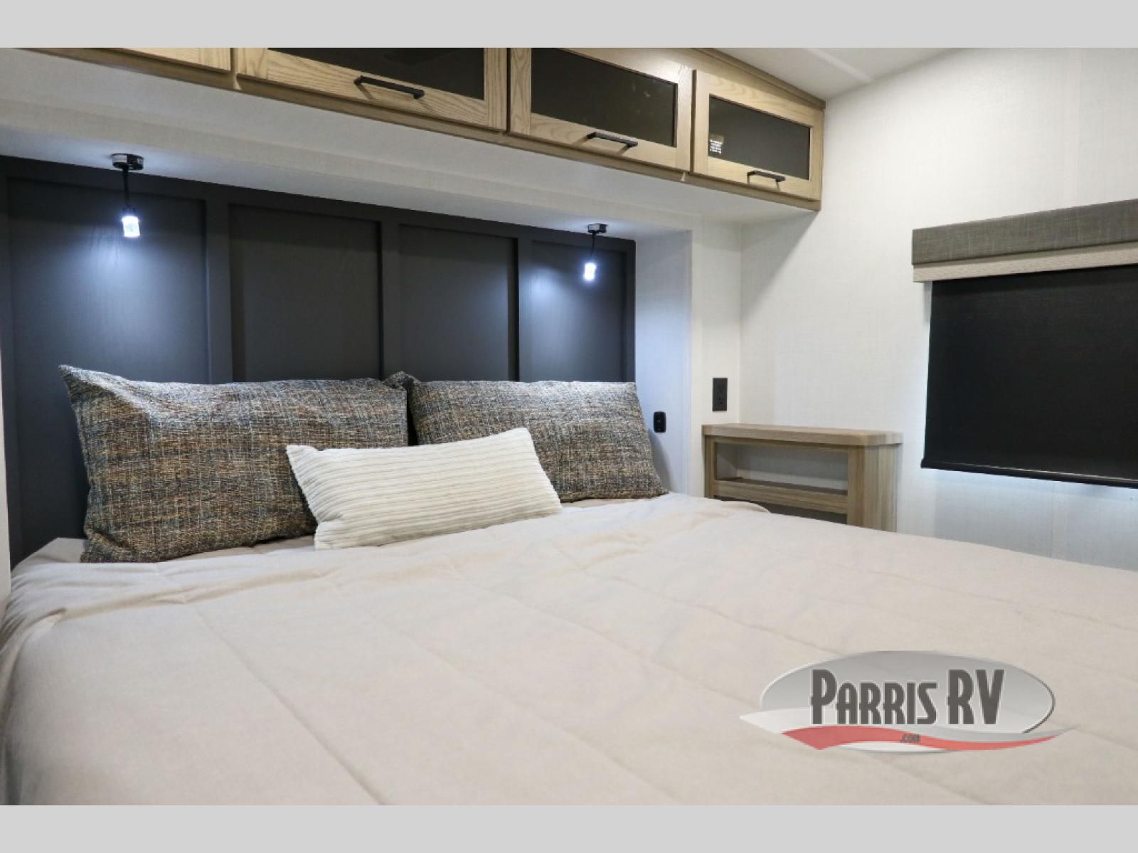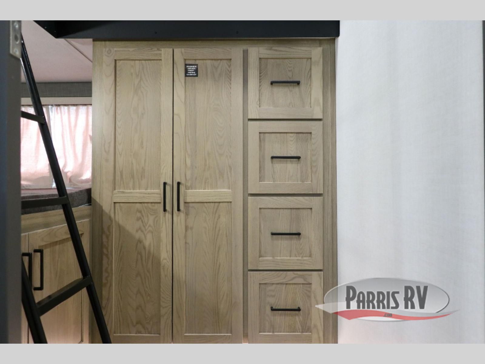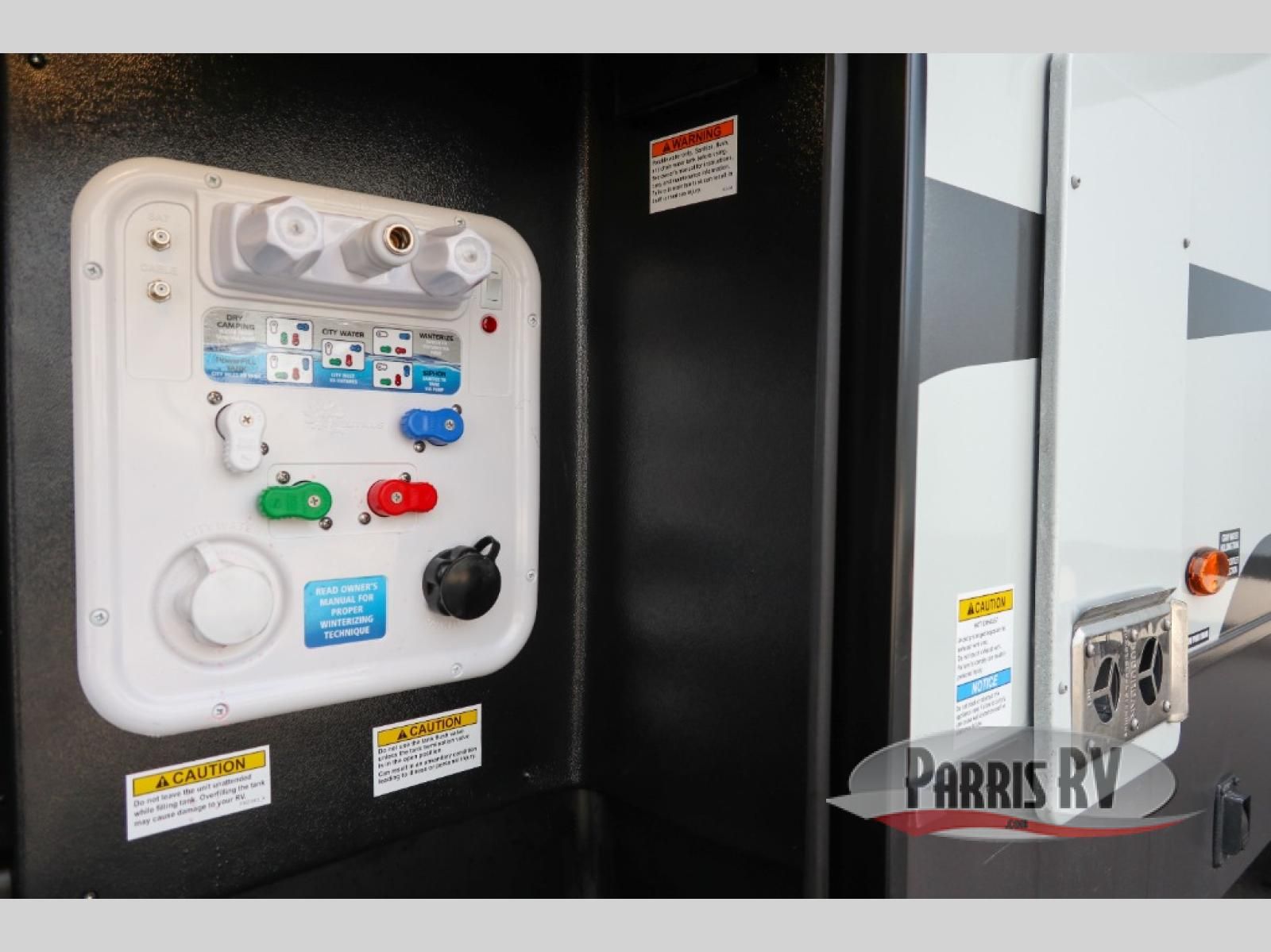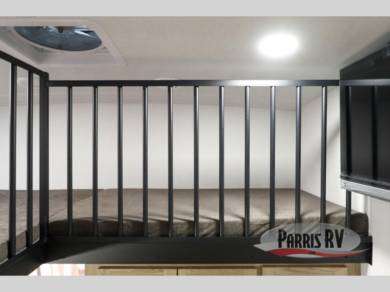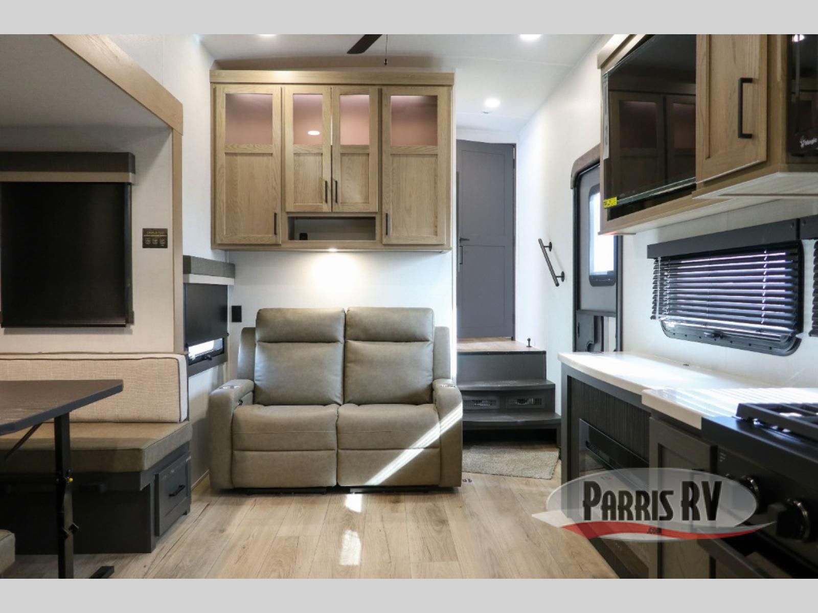 Looking to travel with your family and friends and need lots of space for everyone? This fifth wheel offers a front private bedroom with a queen bed, a spacious wardrobe, and a TV option for shows in bed. On the opposite side of the unit there is a private bunkhouse with triple bunks, plus washer and dryer prep. The main living and kitchen area includes a slide out which offers a king U-shaped dinette to dine at, play games with friends, and provides sleeping if needed, plus a 12V refrigerator and a pantry. There is also a 55" theater seat here for more comfort. The cook will have full amenities indoors plus an outside kitchen when the weather is nice. There are also two power awnings, Solid Entry steps, a rear 2" towing hitch, and more exterior conveniences!