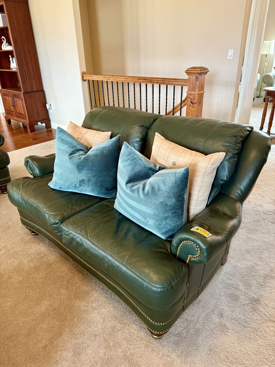 CashAppHand-crafted hunter green leather couch and loveseat, with brass rivets.