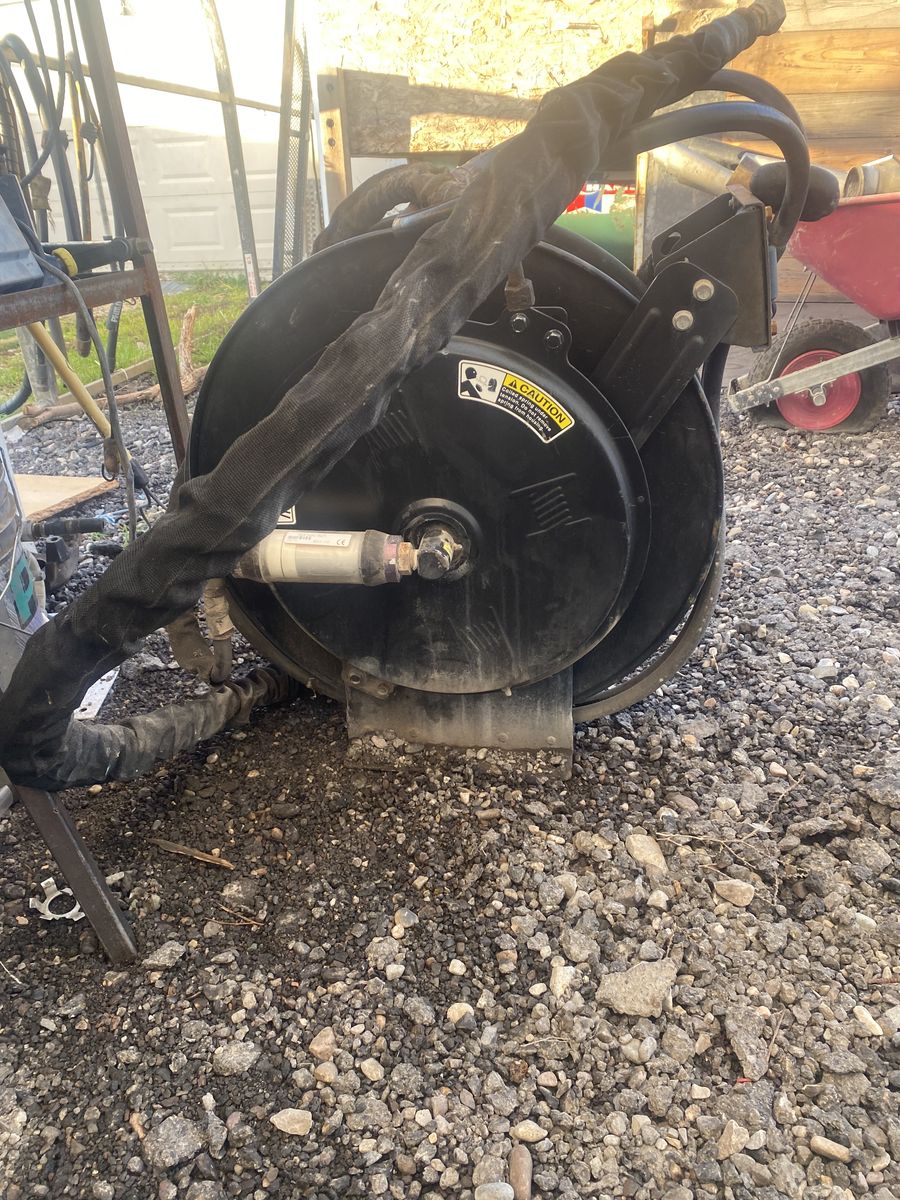 ZelleHydraulic hose reel made by Hanney Reels. New world cost a couple K’s or more. Dual hose i believe 50’ long. Bought it for one of my multiple projects but got hurt.