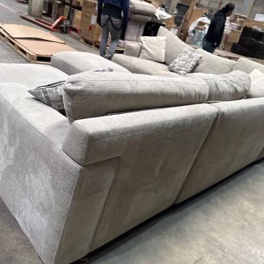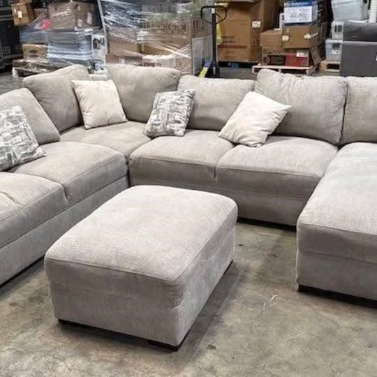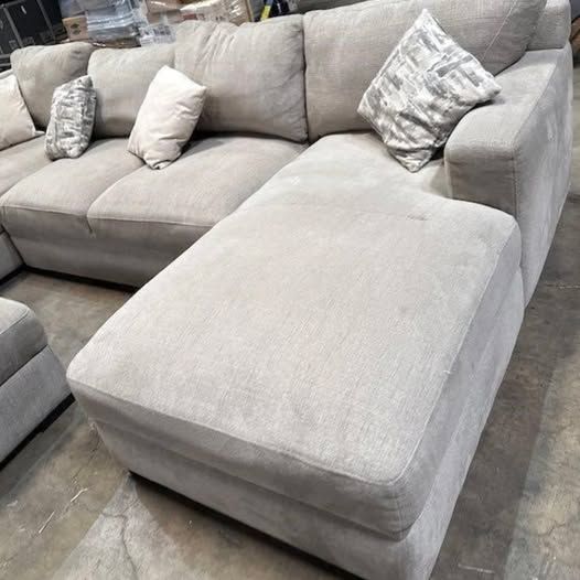 Color: beige; material: 100% polyester chenille fabric; includes 6 accent pillows; foam seat cushions; sinuous spring suspension; care: regular vacuuming recommended, clean with damp soft whit left arm loveseat with wedge seat: 104.3 in. L x 42.5 in. W x 30.3 in. H, inside seating width 55 in.; loveseat: 56.6 in. L x 42.5 in. W x 30.3 in. H, inside seating width 56.6 in.; chaise lounge: 69.2 in. L x 27.1 in. W x 30.3 in. H, inside seating width 27.1 in.; ottoman: 35.4 in. L x 27.5 in. W x 19.6 in. H LOC-MY.