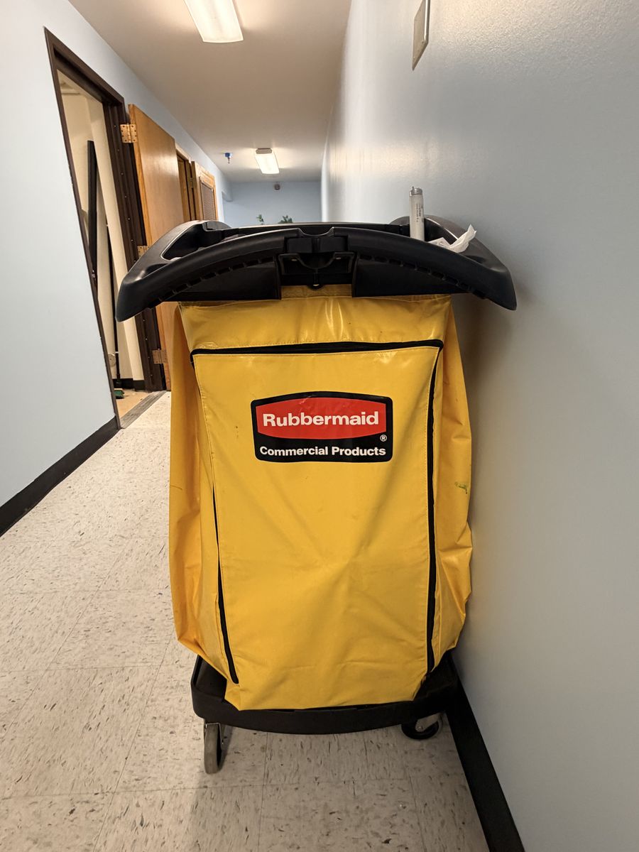 VenmoSturdy Rubbermaid commercial cleaning cart. Has multiple shelves for supplies and a big yellow bag for trash or laundry. On wheels so easy to move around. Great for janitorial work or just organizing stuff.