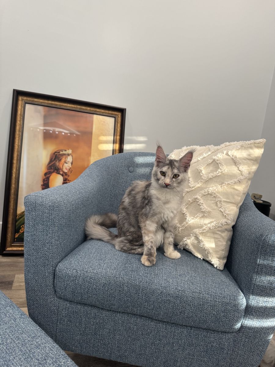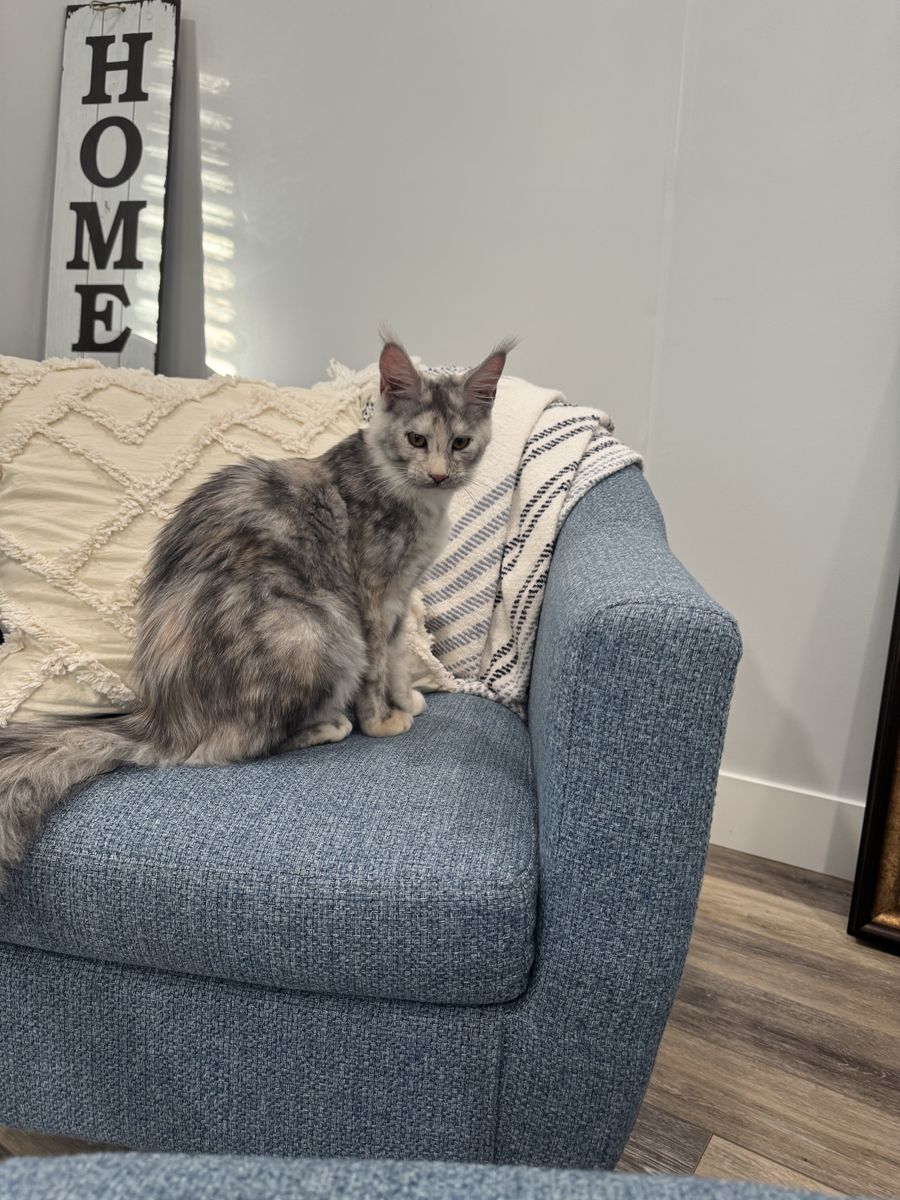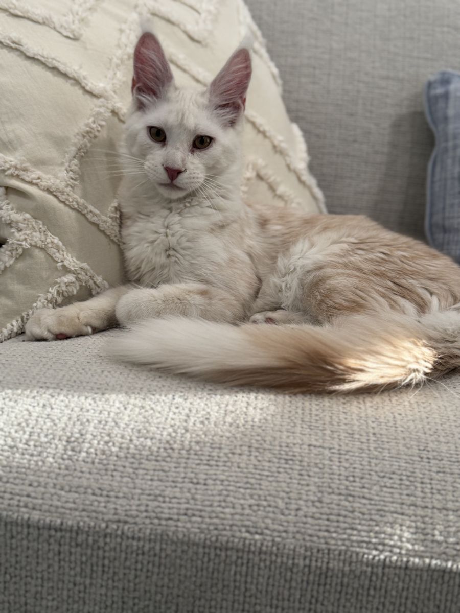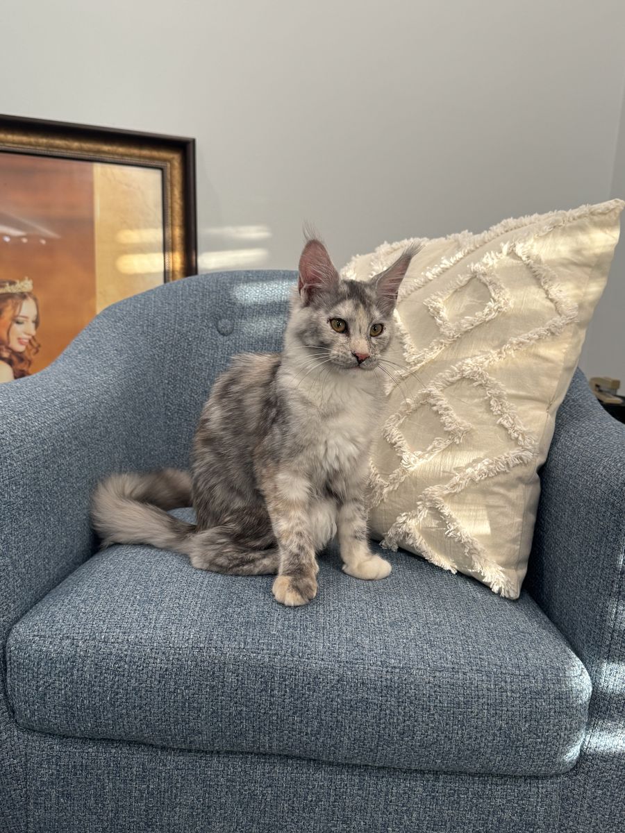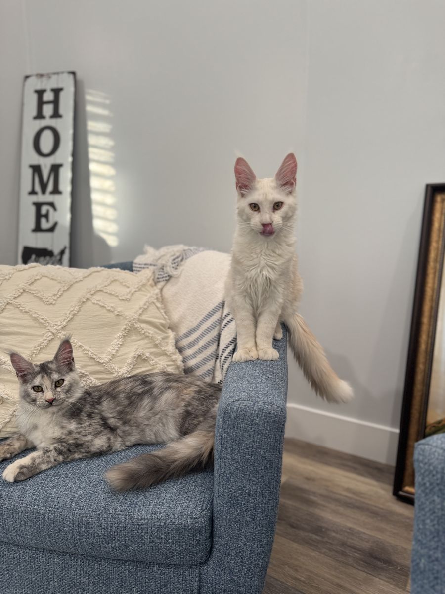 Beautiful Mainecoon kittens. European Lines. Male and female. Born October 19, 2025. She is registered with TICA and CFA. She’s had 3 sets of shots. Her parents are health tested. Father is very large. The male is the light red smoke. Breeding rights are an option to right home.
