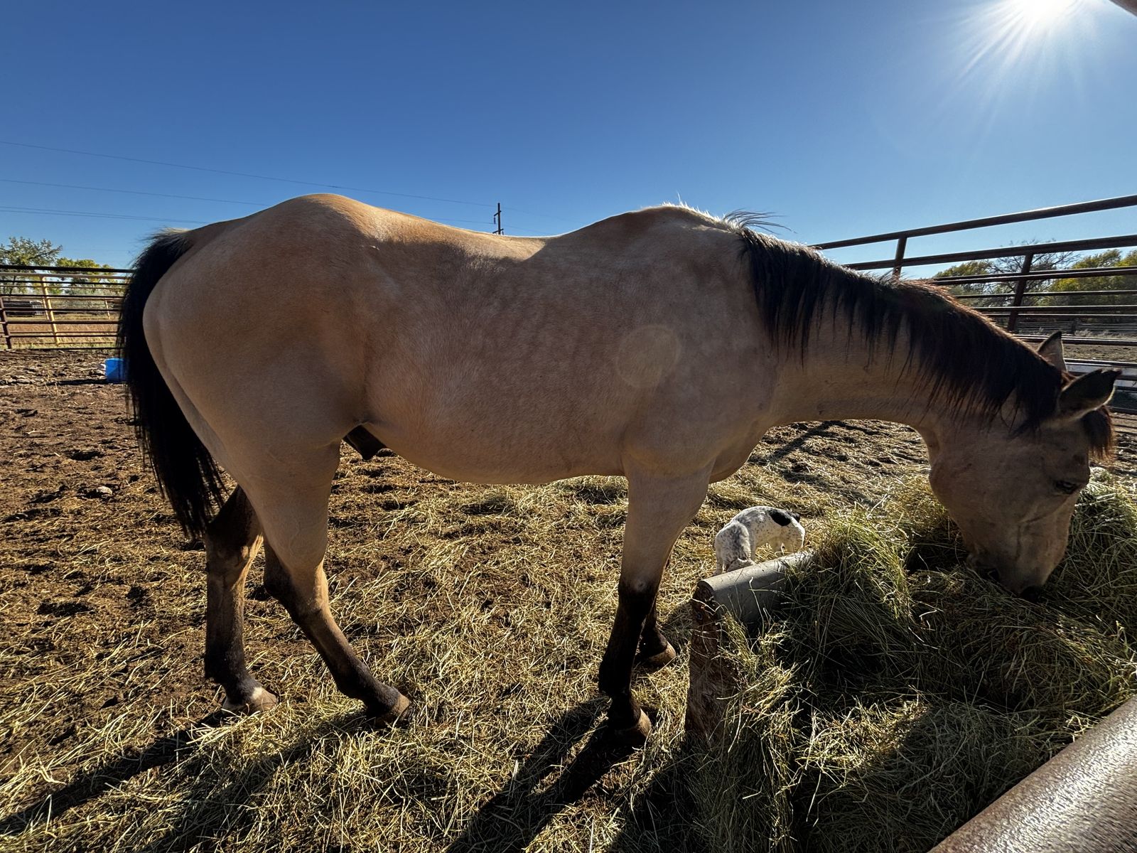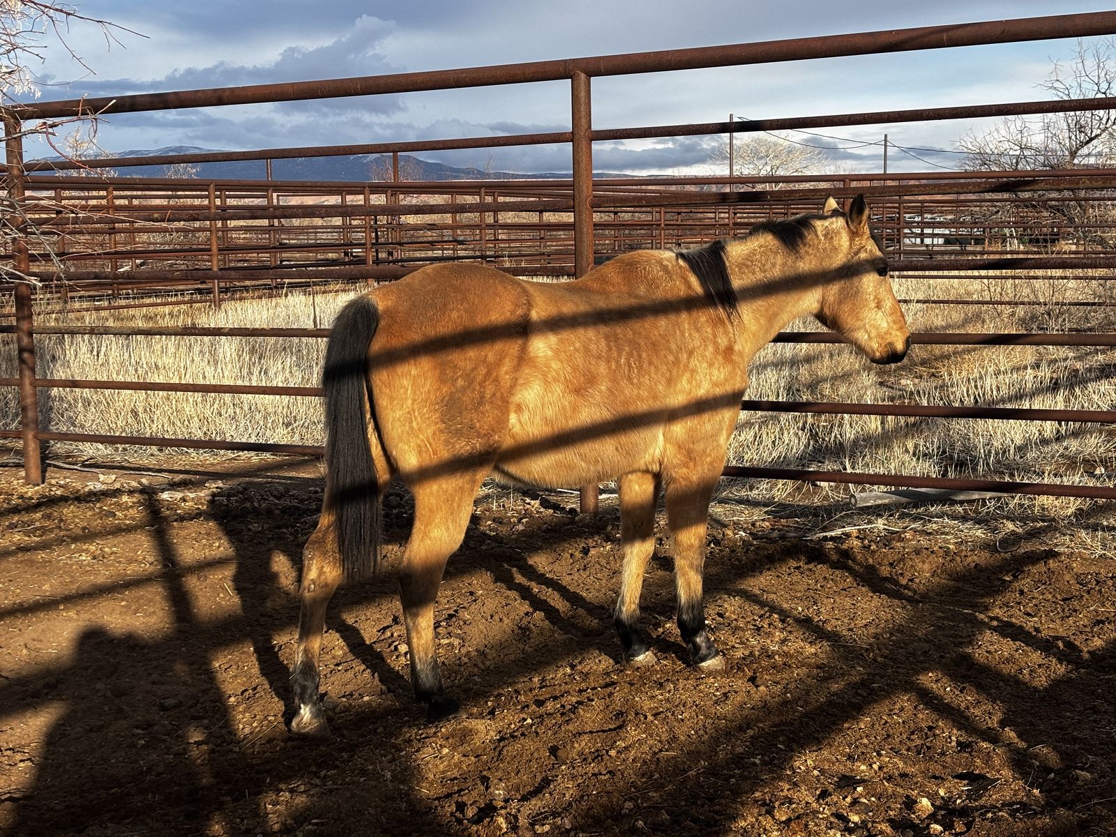 His name is Leonard. He is approximately 20 years old and is a grade quarter horse gelding. We have had him examined by the veterinarian, and he is in good health. Leonard is a very gentle horse, although he can be a bit buddy sour when being ridden and occasionally shows some headstrong behavior. We typically ride him in a Hackamore. He is certainly more suited for children or beginners. We have worked with cattle using him, and he performed excellently. For the most part, he is very calm and slow-paced, but we are looking to get a little more out of him to invest in a new horse.