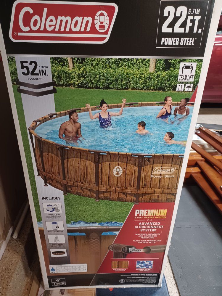 VenmoBrand New above ground Coleman Brand pool (unopened, still in box). 22 Feet across. Deep pool at 52 inches.