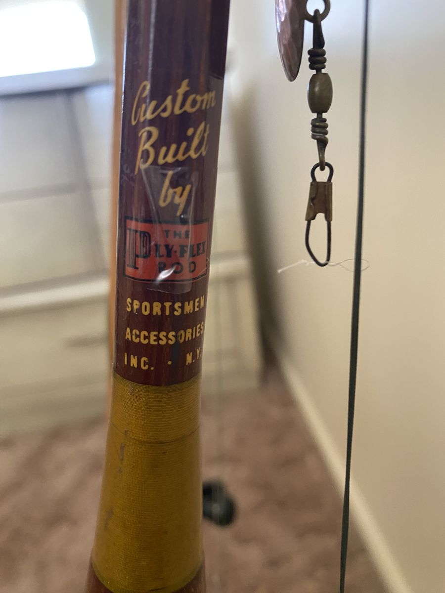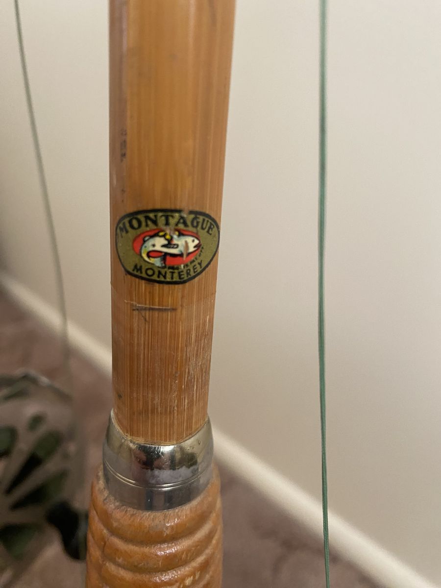 3 vintage cane fly rods for sale. Montague Monterey, 74" tall with Pflueger Taxie reel.