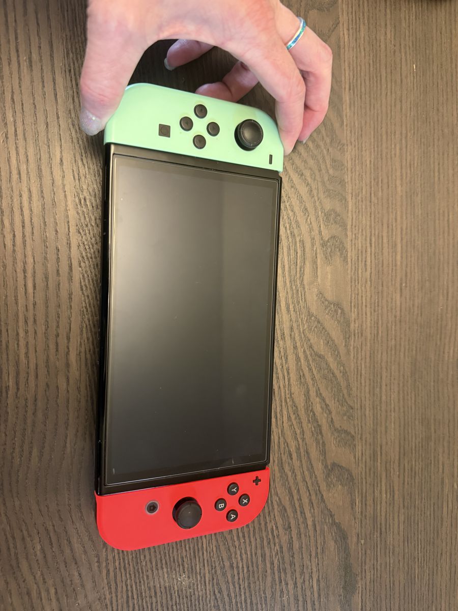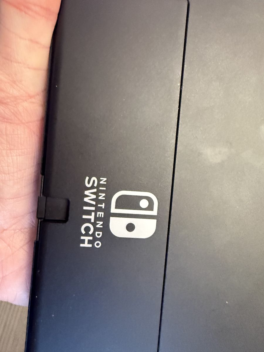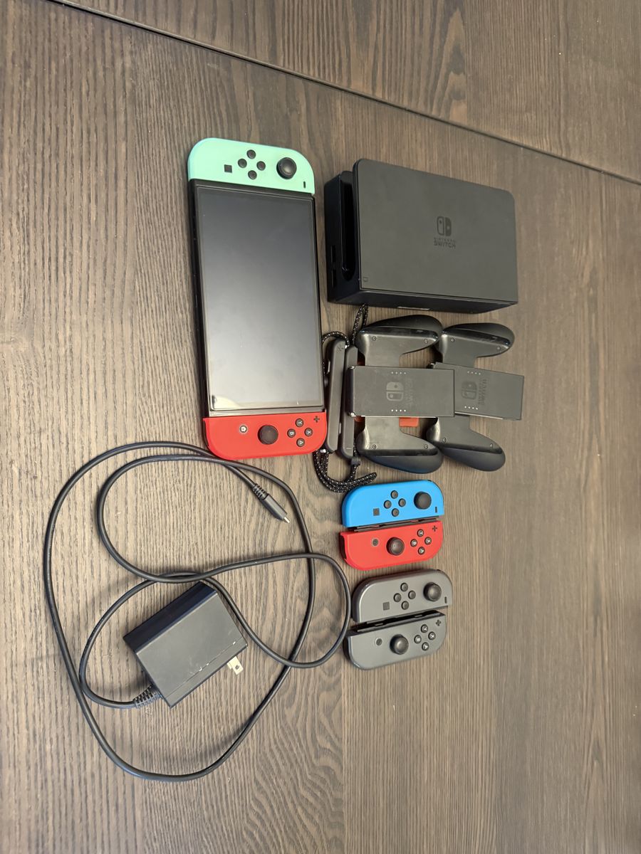 Nintendo switch oled with dock and cords. 2 pairs of controllers and controller attachments included with a 500 gb sd card