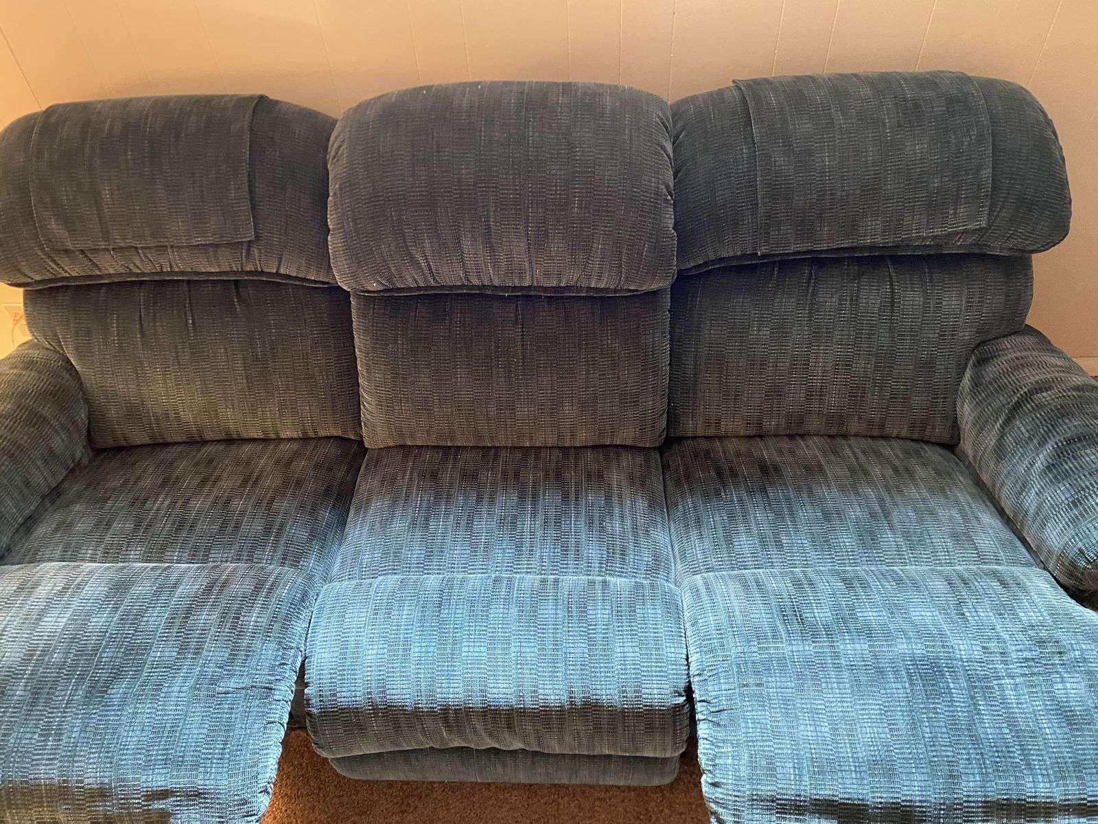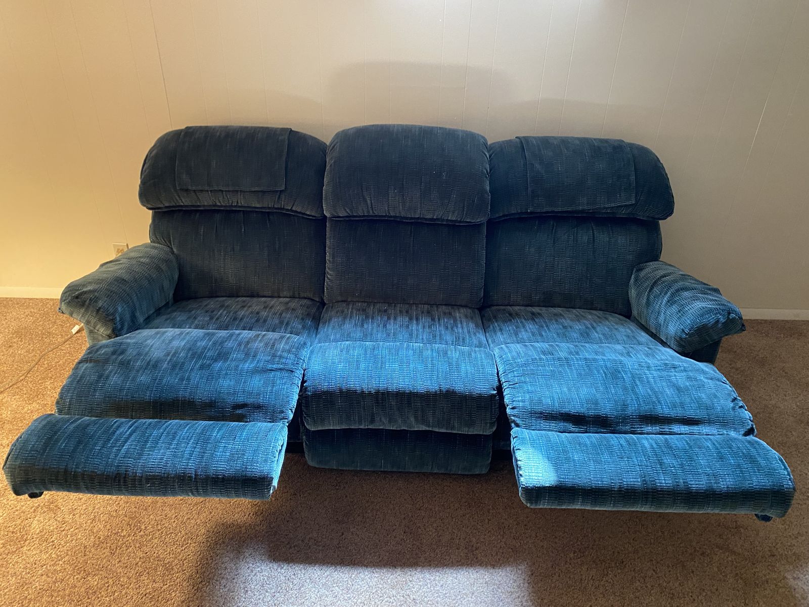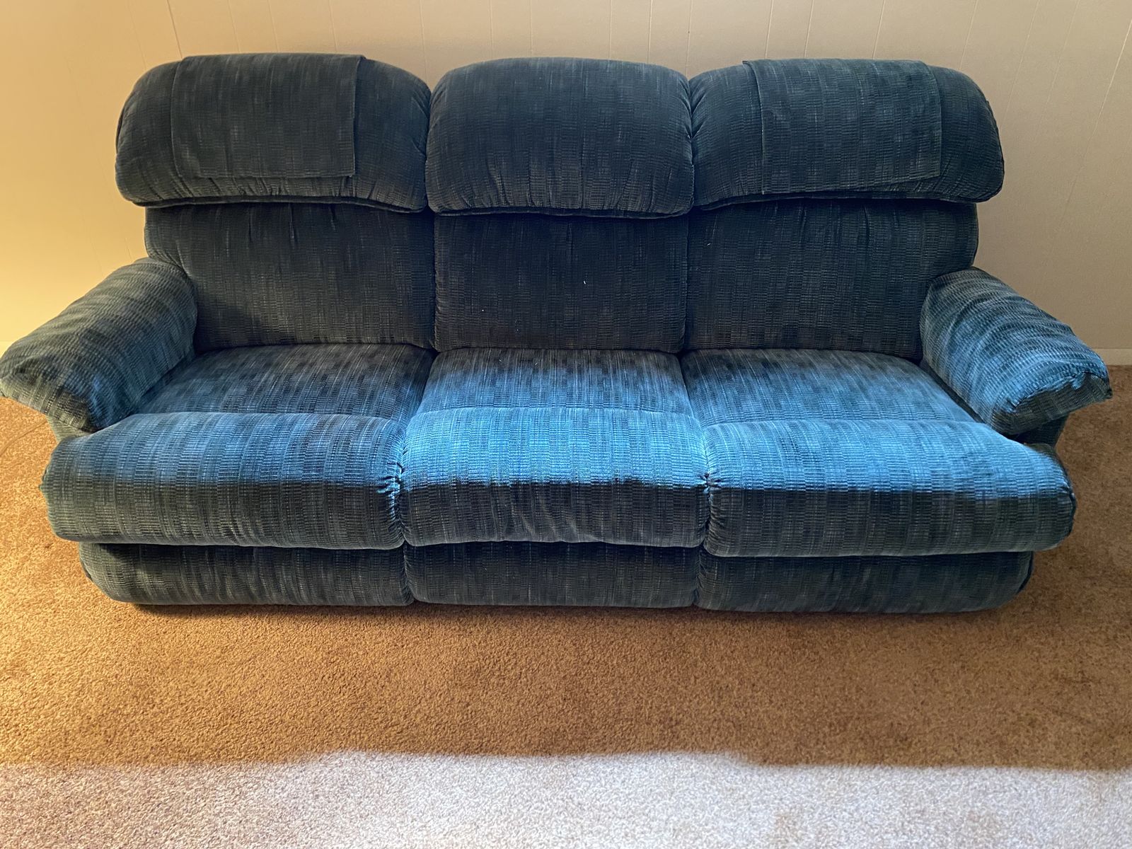 Matching green Lazy-Boy couch with end recliners and a single recliner. Couch has been lightly used and recliner has had minimal use. All are in amazing condition. Single recliner: 41" H x 38"W x 36"D. Couch: 39"H x 88"L x 40"D with both ends being recliners. FCFS. Cash only. Thanks for looking!