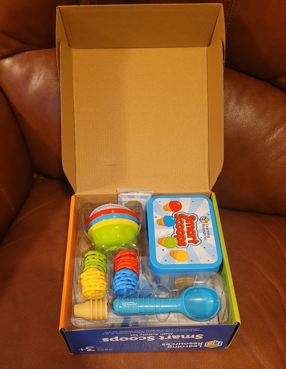 VenmoNew! Box is opened. It comes with 55 pieces, 4 ice cream cones, 4 sundae bowls, and 20 stackable scoops in different colors. It also has 23 double-sided activity cards for learning math concepts like sorting and counting. It is in a container shaped like an ice cream carton for easy storage.