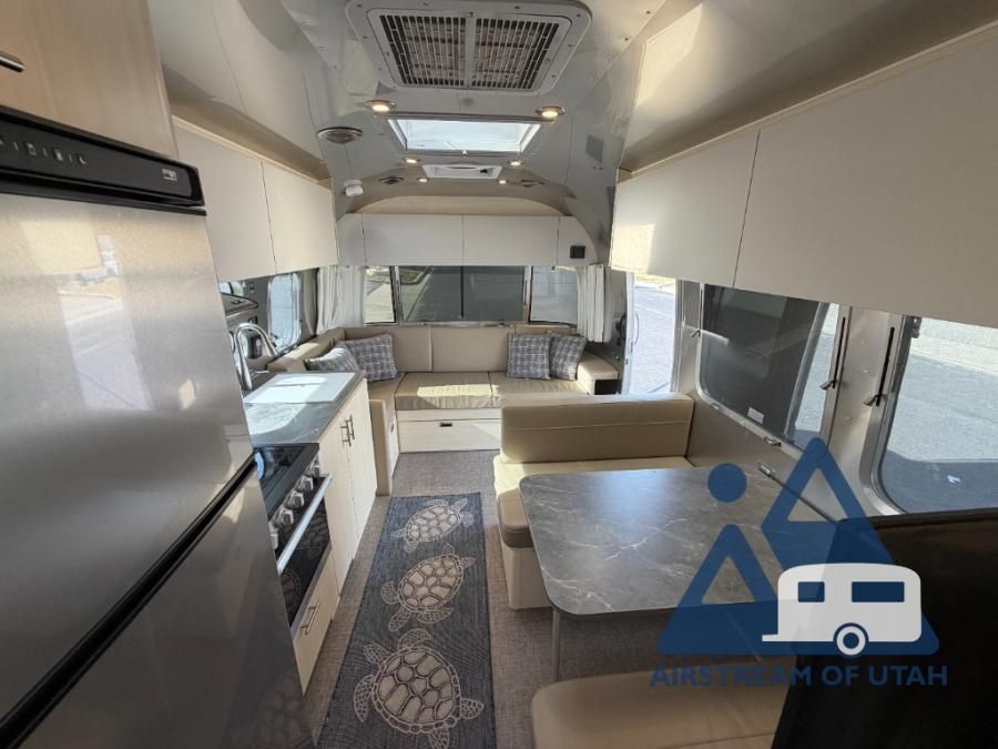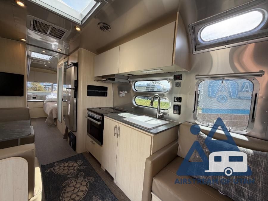 With each Flying Cloud travel trailer by Airstream, there are two axles, and each is built for ease of towing, plus there is a rear-view camera to make reversing and parking easier, and stainless steel front stone guards to protect the lower segments from road debris. The iconic Airstream design is created outside and inside by the semi-monocoque aluminum superstructure, the temperature reducing one-piece white aluminum roof, the panoramic front windows, and the stylish aluminum wheels. The interior will have you feeling right at home with handcrafted cabinetry, plenty of storage and counter space, sleek roller blinds and blackout curtains, plus residential style faucets!