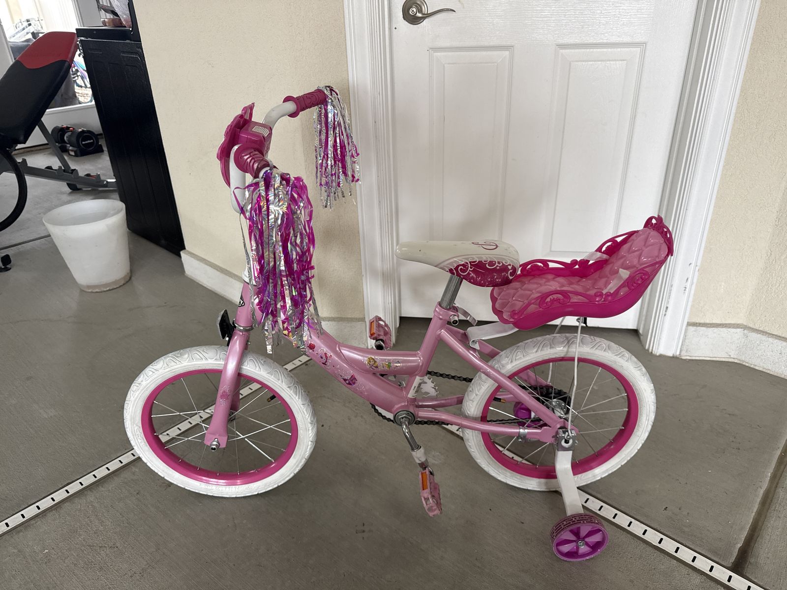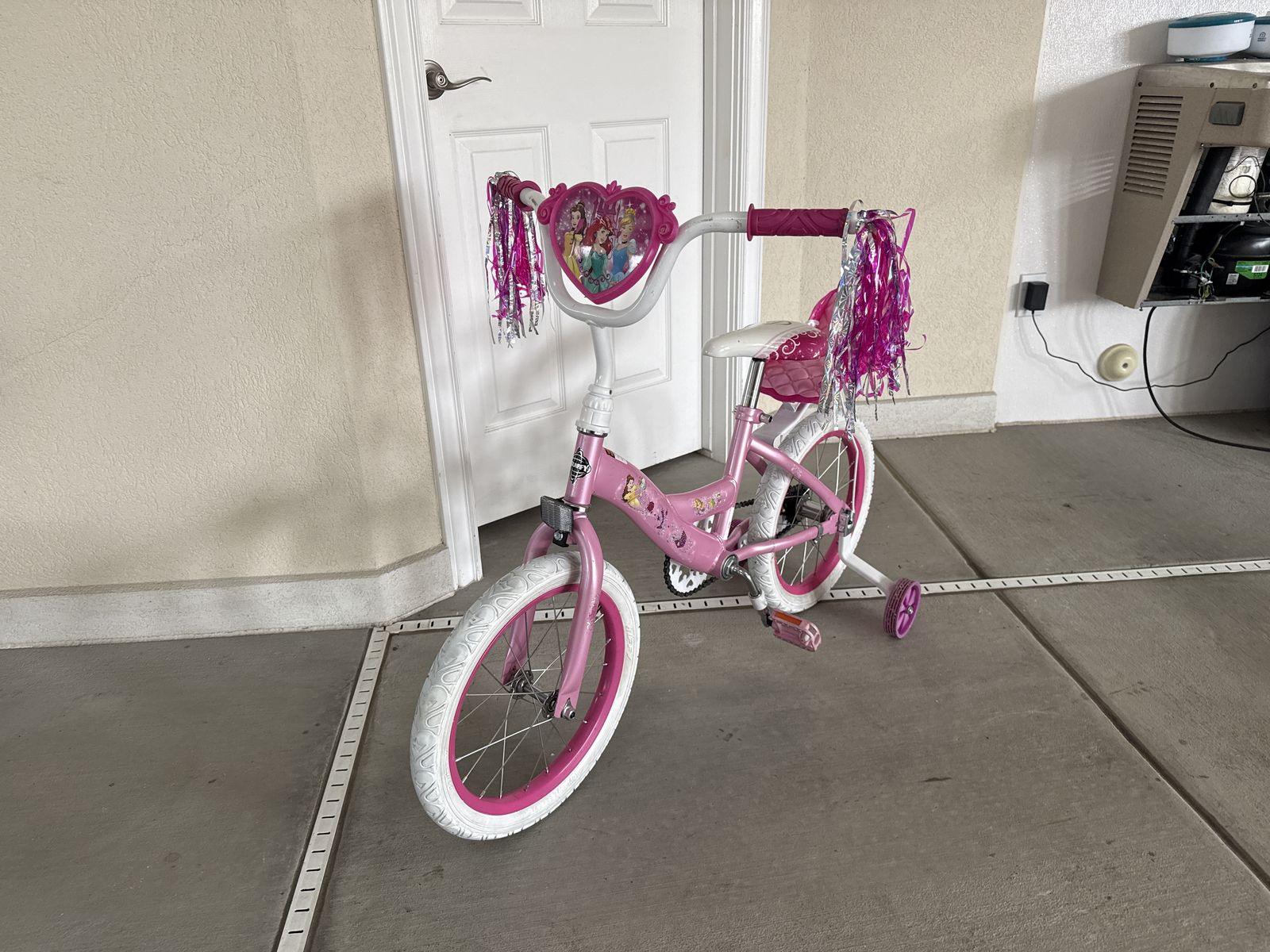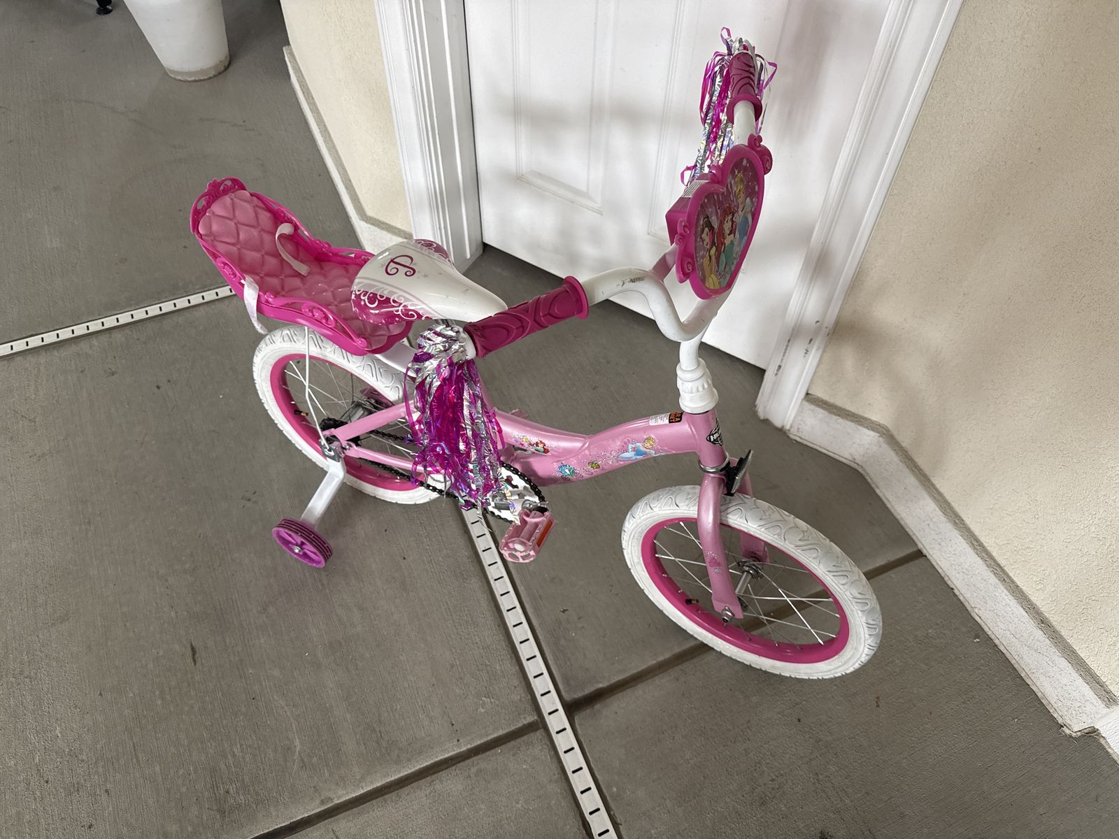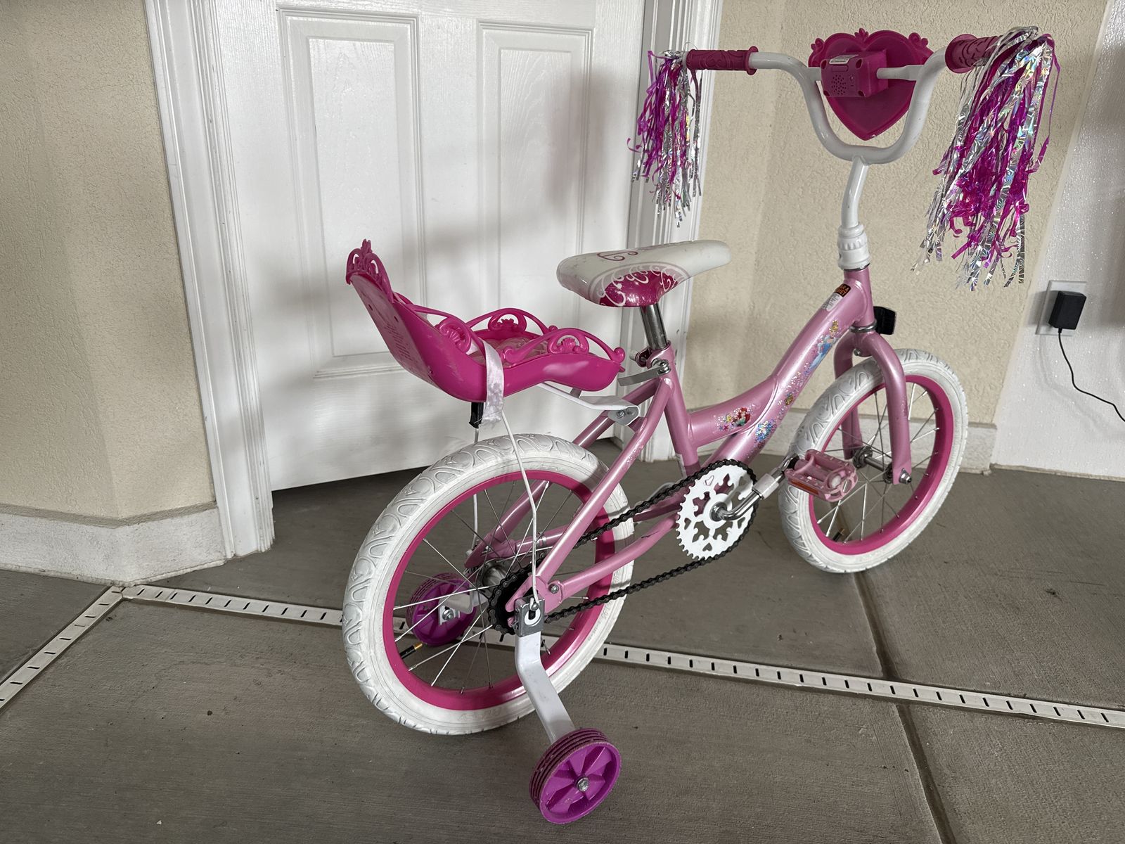VenmoPrincess 16 inch girls bike with training wheels and doll seat. Wheels are true, tires in great condition.
