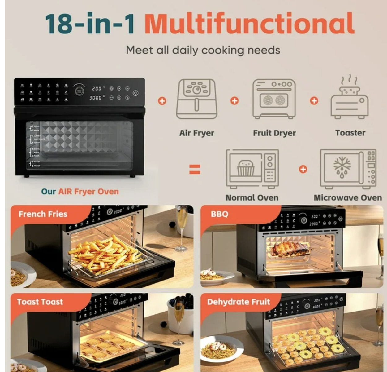 Brand new 32QT Large Air Fryer Grill Combo, 1800W, 450°F Max Temp, 20-in-1 with 7 Accessories and 13" Pizza Pan