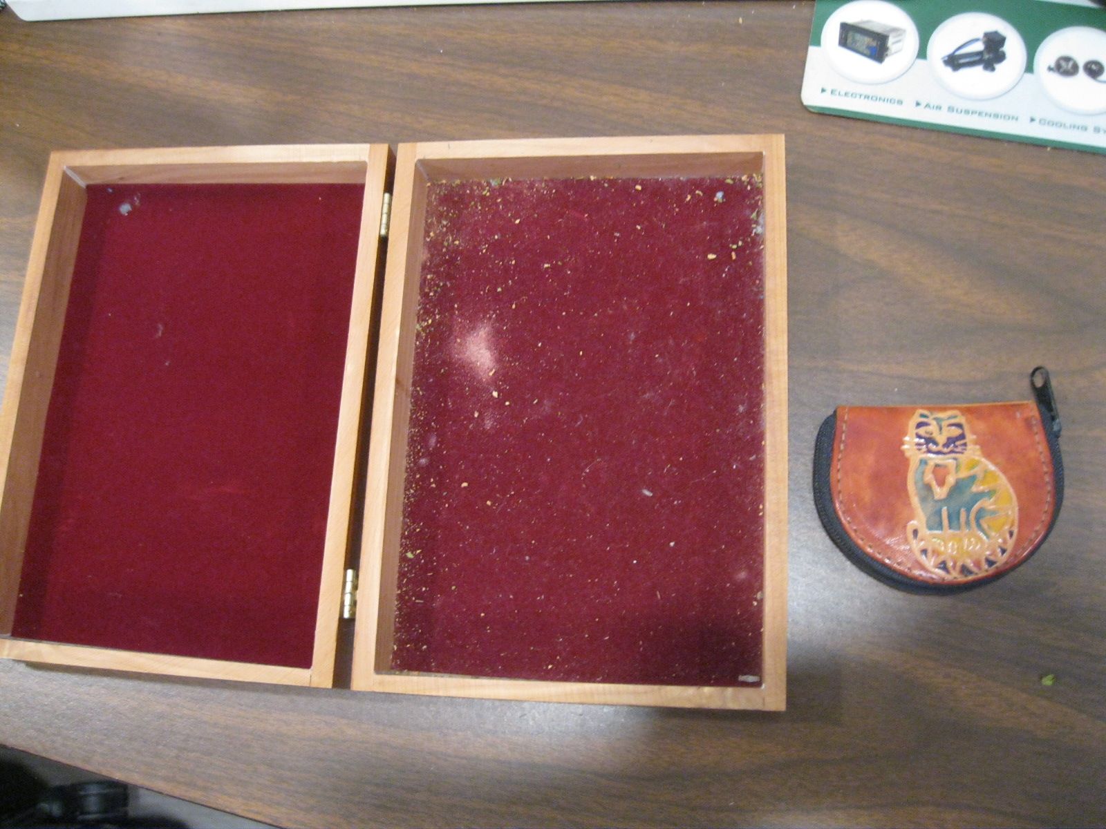 VenmoFor sale is a cedar box with a wolf on the front and felt lining. Measurements are 6.5 inches wide, 9 tall and 2 deep. A leather zip pouch with a cat on it. $5 for both.