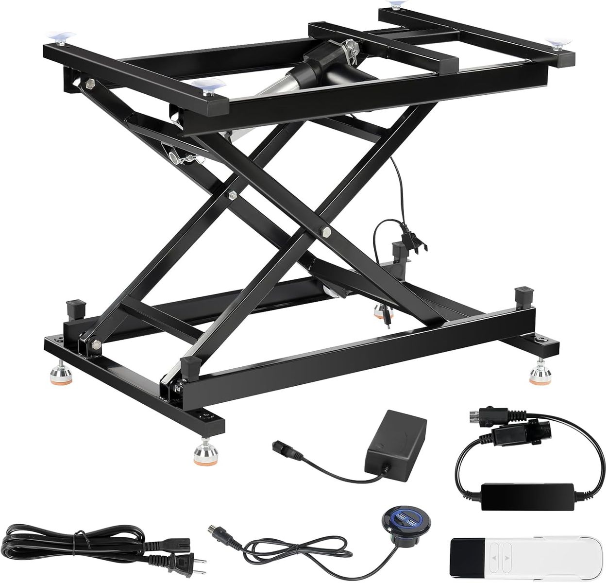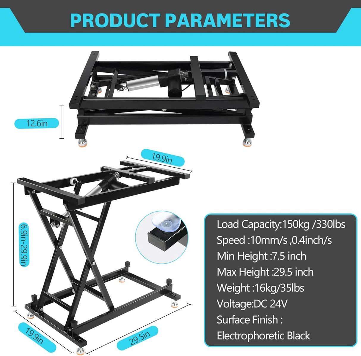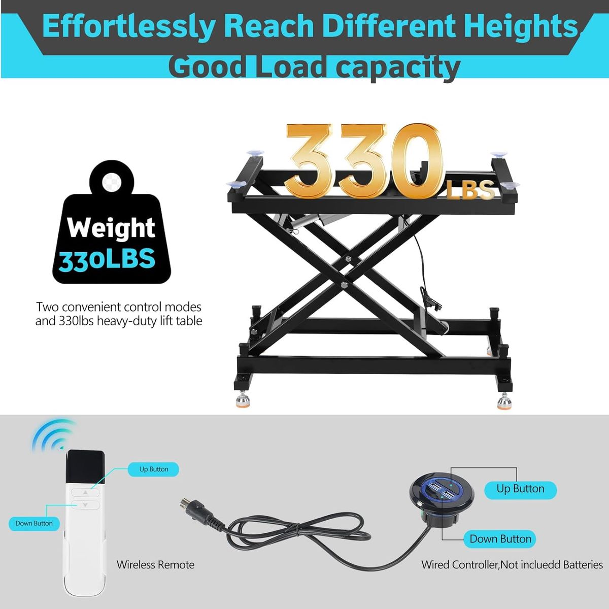 ApplePayFree shipping. 30'' Electric Remote Control Dining Coffee Table Lift,110V-240V,Working Platform Computer Desk Electronic Scissor Lift,Adjustable Height Office Desk Lift with 330LBS Weight Capacity-Black Brand TOPTGO Product Dimensions 30.7D x 20.5W x 7.9H Item Weight 38.1 Pounds Maximum Weight Recommendation 38.2 Pounds Frame Material Alloy Steel About this item Heavy-duty Load Capacity: Electric lift table made of high-quality powder-coated steel, rust-proof and corrosion-resistant, and features a spacious 30 x 16-inch desktop for a variety of items. The maximum load capacity of 330 lbs and support adjustable height from 7.5inch to 29.5inch, this electric lift table allows you to safely and easily perform lifting and transport tasks at different heights Durable motor:Designed for durability and consistent performance, the motor balances power, efficiency and user safety with quiet operation designed to minimize noise and vibration for seamless regulation,High efficiency ensures the ability to lift considerable weights while maintaining stability. Equipped with overload protection to prevent motor damage due to overload or overheating Two Control ways: Easy to operate our single scissor lift provided 2ways for control the device, wireless remote or wired controller not include batteries, you can insert power for working, Which Effortlessly reach your table to different heights you want. The wireless remote with range limited of 10 meters, so you can control the table within this distance. Perfect for matching with different tabletops or accessories, customizable as a tatami table, coffee table, a photography stand or a laboratory lift Free movement: There with 4pc 360° rotating smooth casters on the botton of lift , each casters with a braking function,on the top of the lift with 4pc anti-slip pads Can protect your table from slipping and breaking during movement.Only 1 person easily move the device at your wanted site Widely use:1pack of Electric lift which no need to install, only the Power cord package requires link.The electric coffee table lift is versatile and practical in a vaiety of environments,such as residential application, commercial application,environments and events and so on