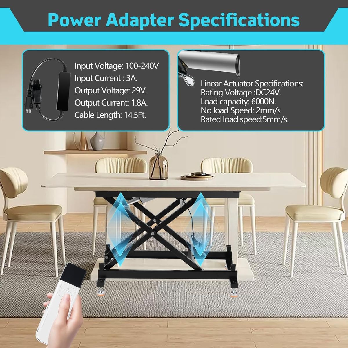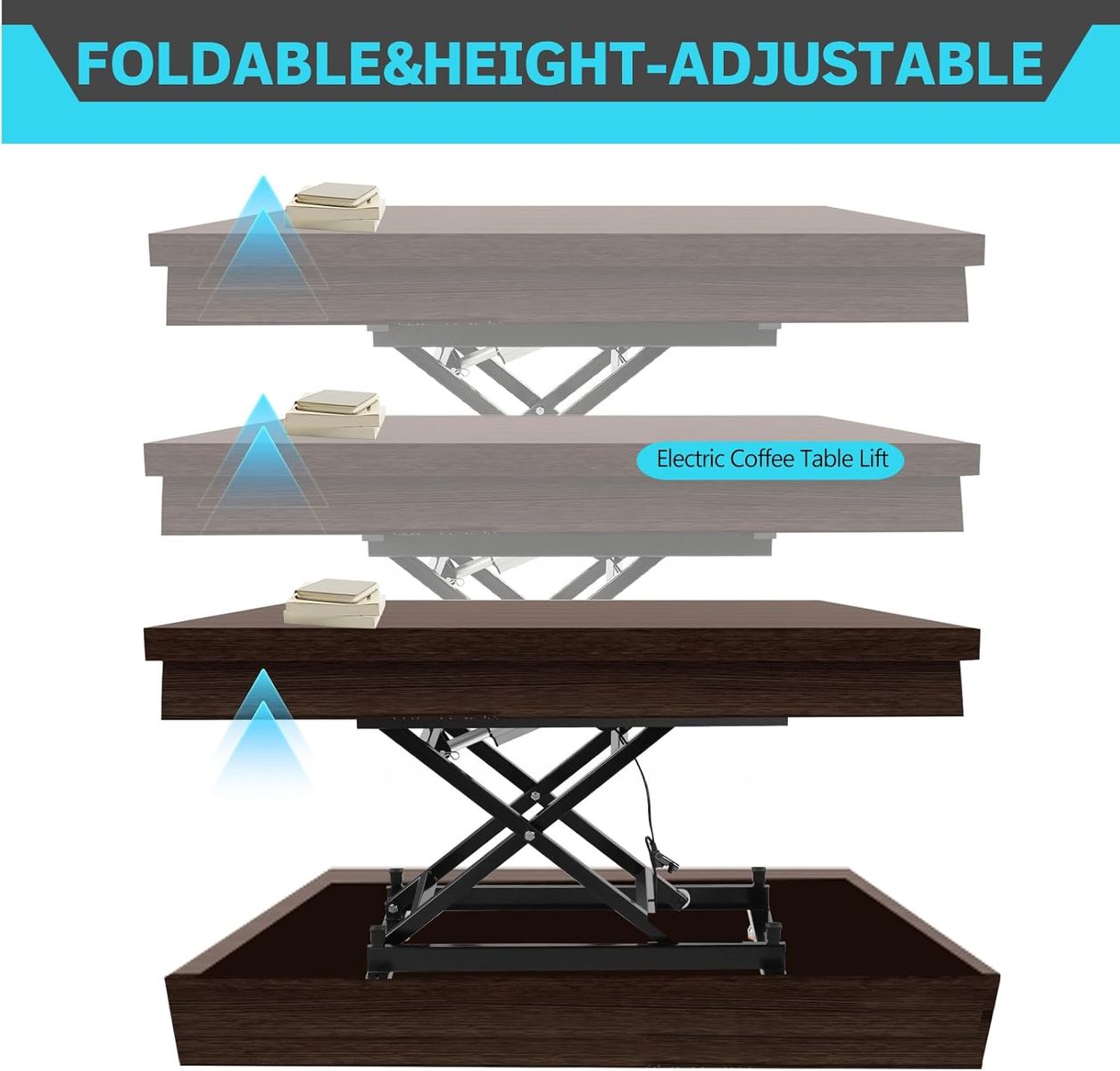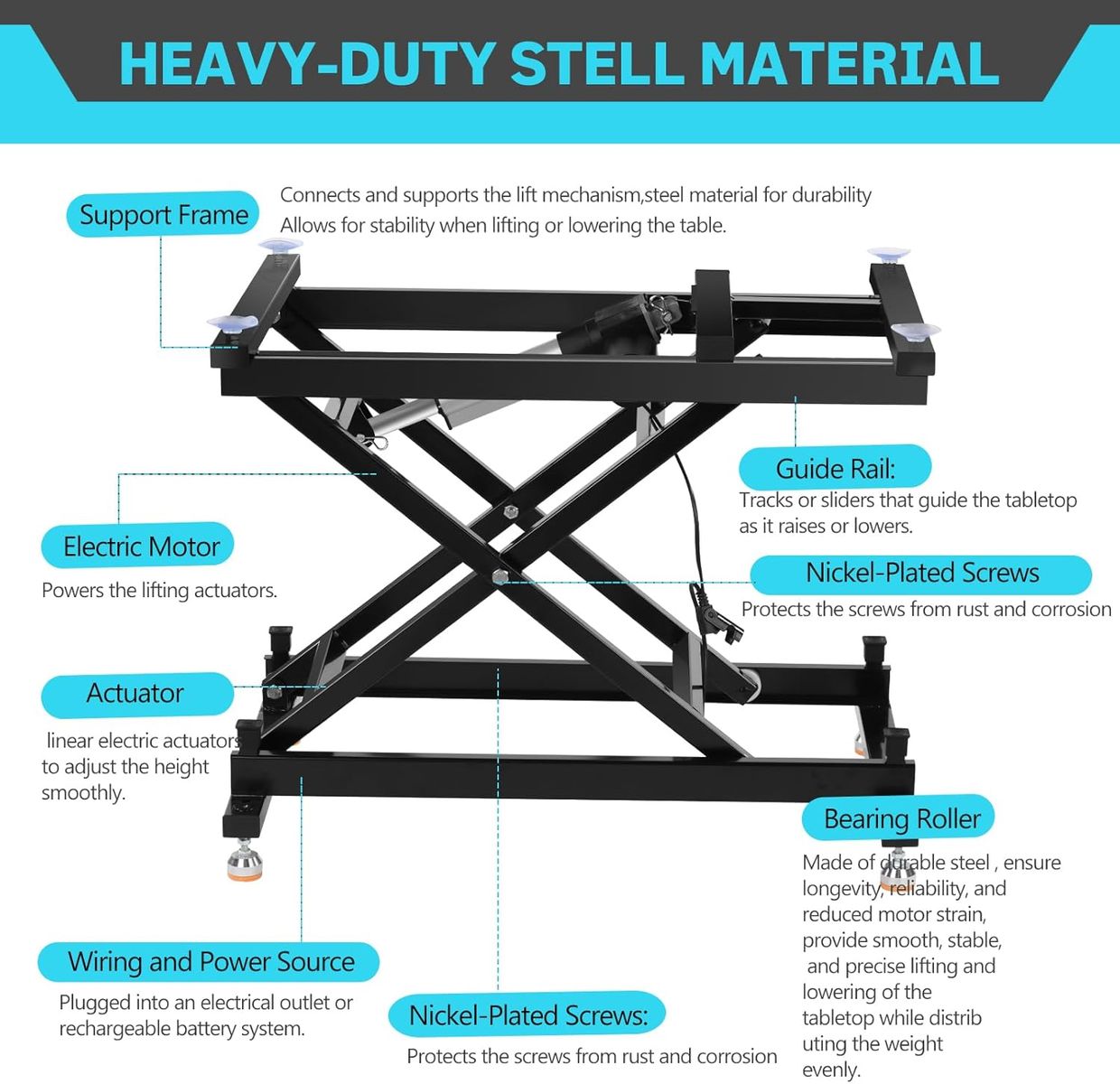 ApplePayFree shipping. 30'' Electric Remote Control Dining Coffee Table Lift,110V-240V,Working Platform Computer Desk Electronic Scissor Lift,Adjustable Height Office Desk Lift with 330LBS Weight Capacity-Black Brand TOPTGO Product Dimensions 30.7D x 20.5W x 7.9H Item Weight 38.1 Pounds Maximum Weight Recommendation 38.2 Pounds Frame Material Alloy Steel About this item Heavy-duty Load Capacity: Electric lift table made of high-quality powder-coated steel, rust-proof and corrosion-resistant, and features a spacious 30 x 16-inch desktop for a variety of items. The maximum load capacity of 330 lbs and support adjustable height from 7.5inch to 29.5inch, this electric lift table allows you to safely and easily perform lifting and transport tasks at different heights Durable motor:Designed for durability and consistent performance, the motor balances power, efficiency and user safety with quiet operation designed to minimize noise and vibration for seamless regulation,High efficiency ensures the ability to lift considerable weights while maintaining stability. Equipped with overload protection to prevent motor damage due to overload or overheating Two Control ways: Easy to operate our single scissor lift provided 2ways for control the device, wireless remote or wired controller not include batteries, you can insert power for working, Which Effortlessly reach your table to different heights you want. The wireless remote with range limited of 10 meters, so you can control the table within this distance. Perfect for matching with different tabletops or accessories, customizable as a tatami table, coffee table, a photography stand or a laboratory lift Free movement: There with 4pc 360° rotating smooth casters on the botton of lift , each casters with a braking function,on the top of the lift with 4pc anti-slip pads Can protect your table from slipping and breaking during movement.Only 1 person easily move the device at your wanted site Widely use:1pack of Electric lift which no need to install, only the Power cord package requires link.The electric coffee table lift is versatile and practical in a vaiety of environments,such as residential application, commercial application,environments and events and so on